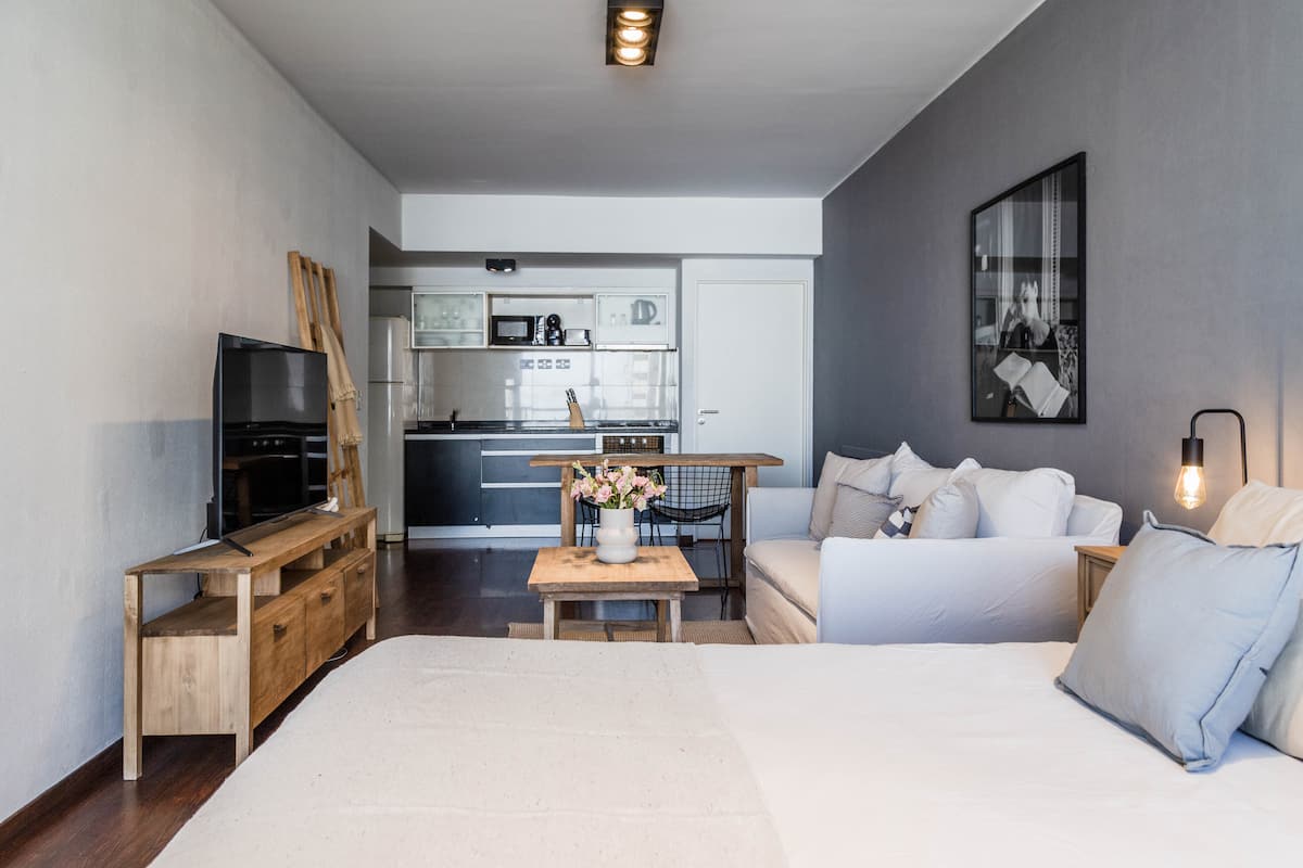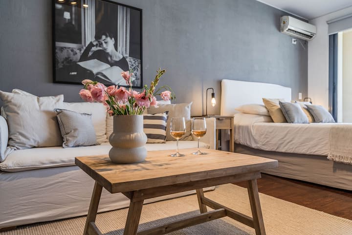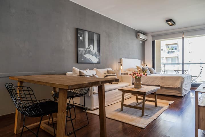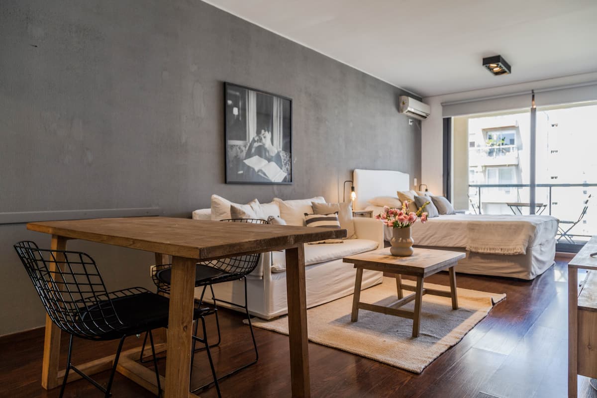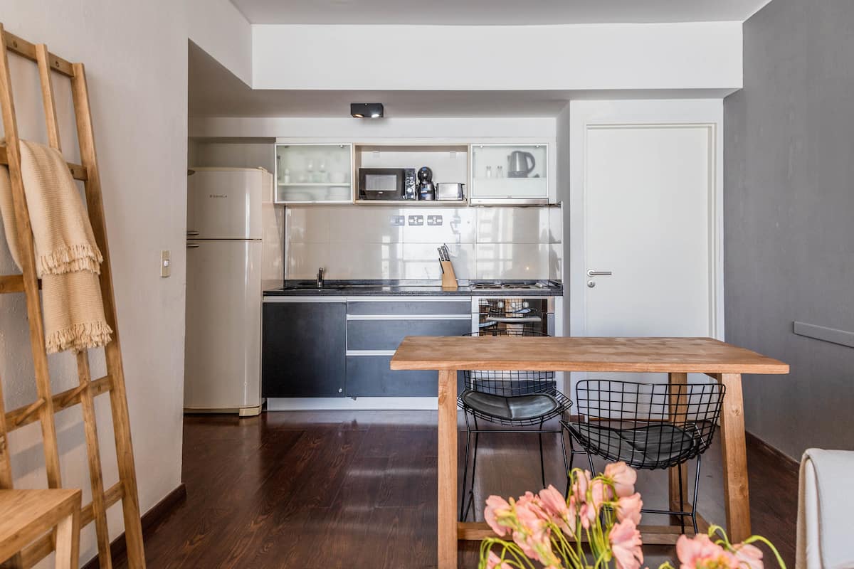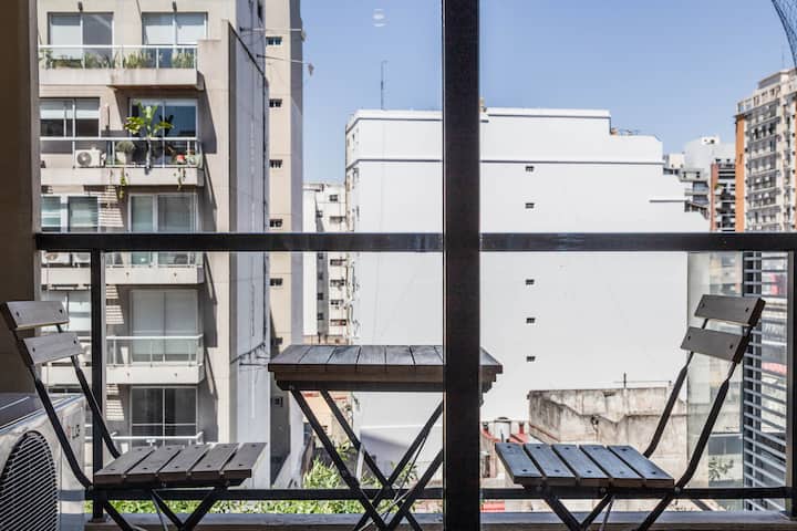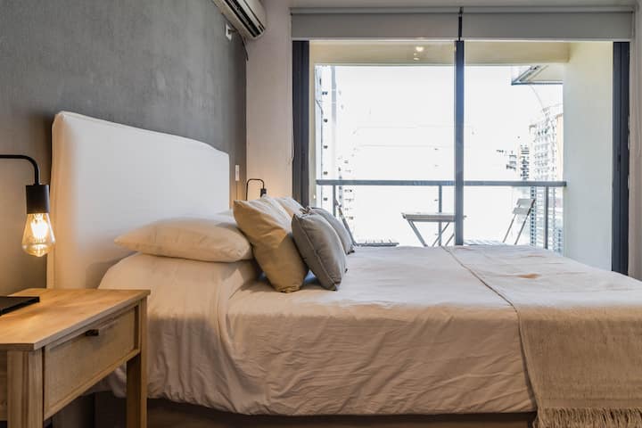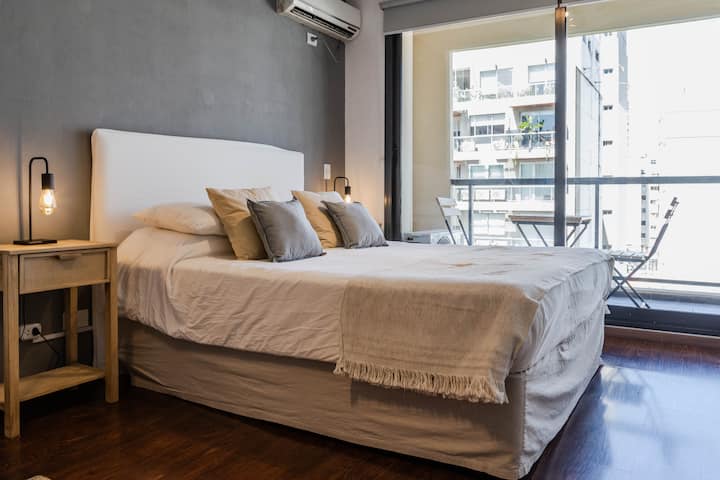 Departamento tipo monoambiente con terraza en Villa Urquiza. Cuenta con cama de 1 plaza y cocina con equipamiento completo, y un baño con ducha. Ubicado a poca distancia de la estación Los Incas y del área de Parque Chas.