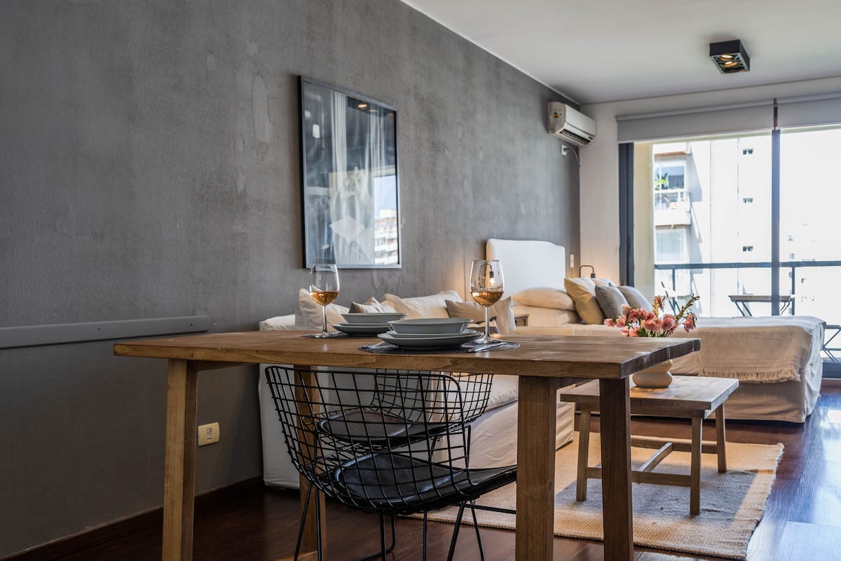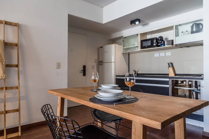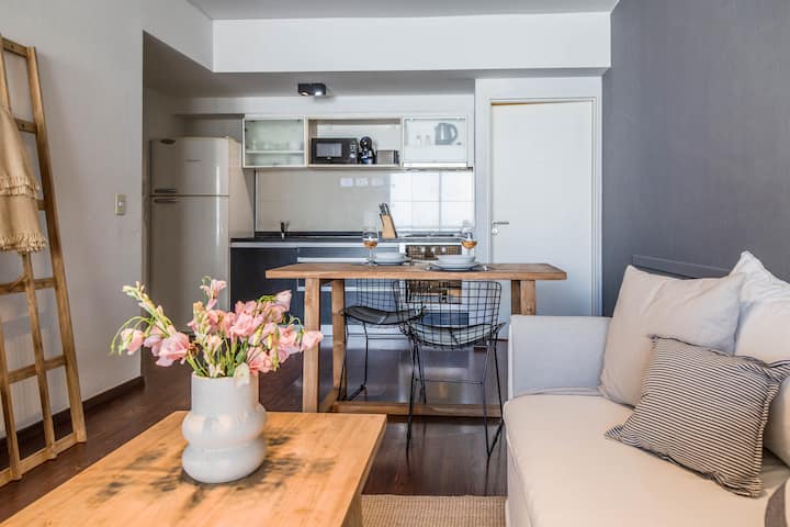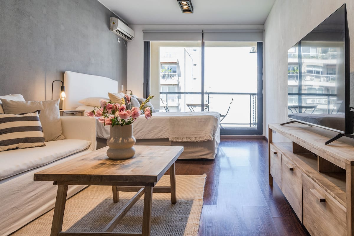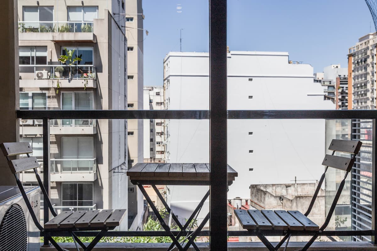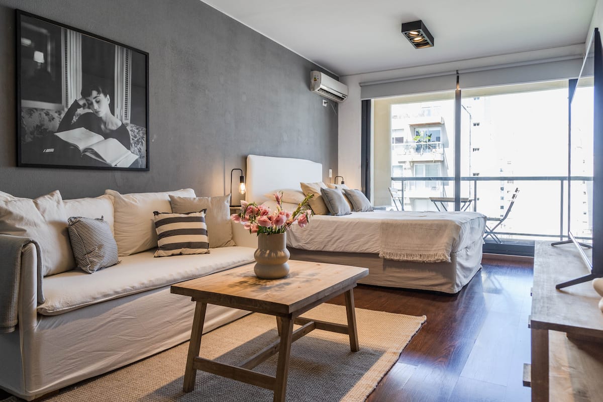 Departamento tipo monoambiente con terraza en Villa Urquiza. Cuenta con cama de 1 plaza y cocina con equipamiento completo, y un baño con ducha. Ubicado a poca distancia de la estación Los Incas y del área de Parque Chas.