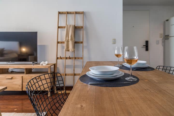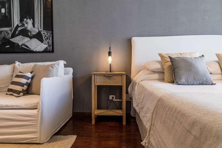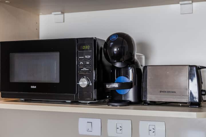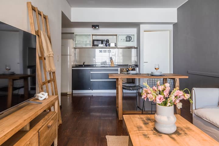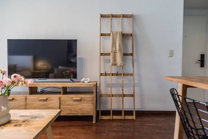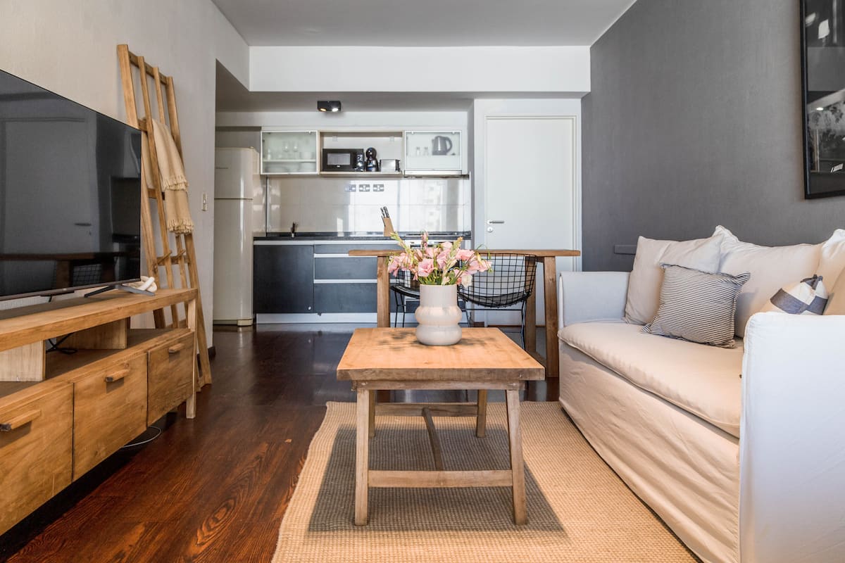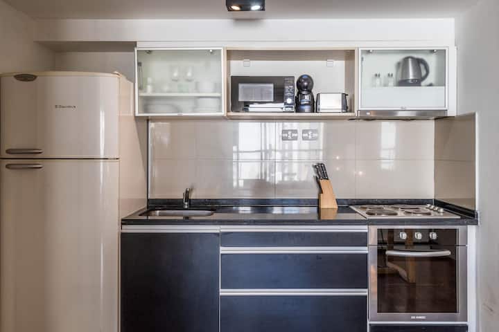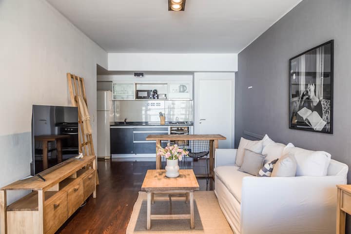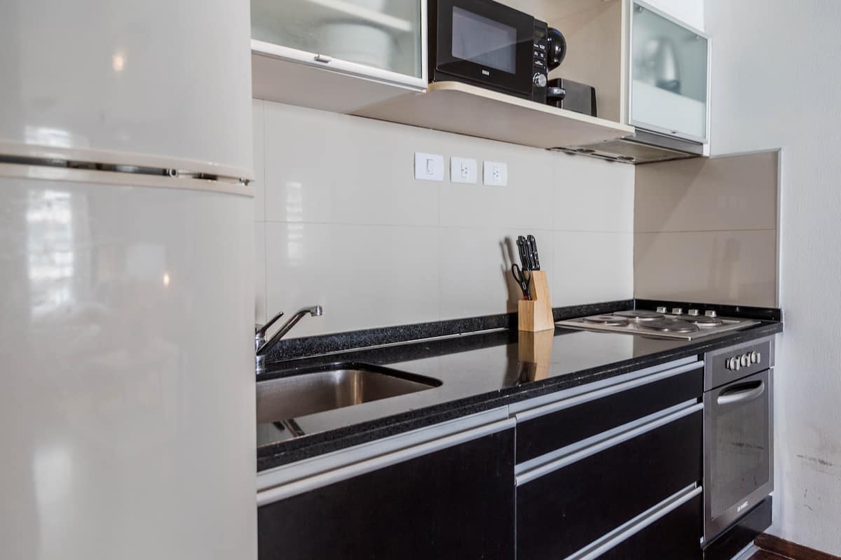Departamento tipo monoambiente con terraza en Villa Urquiza. Cuenta con cama de 1 plaza y cocina con equipamiento completo, y un baño con ducha. Ubicado a poca distancia de la estación Los Incas y del área de Parque Chas.