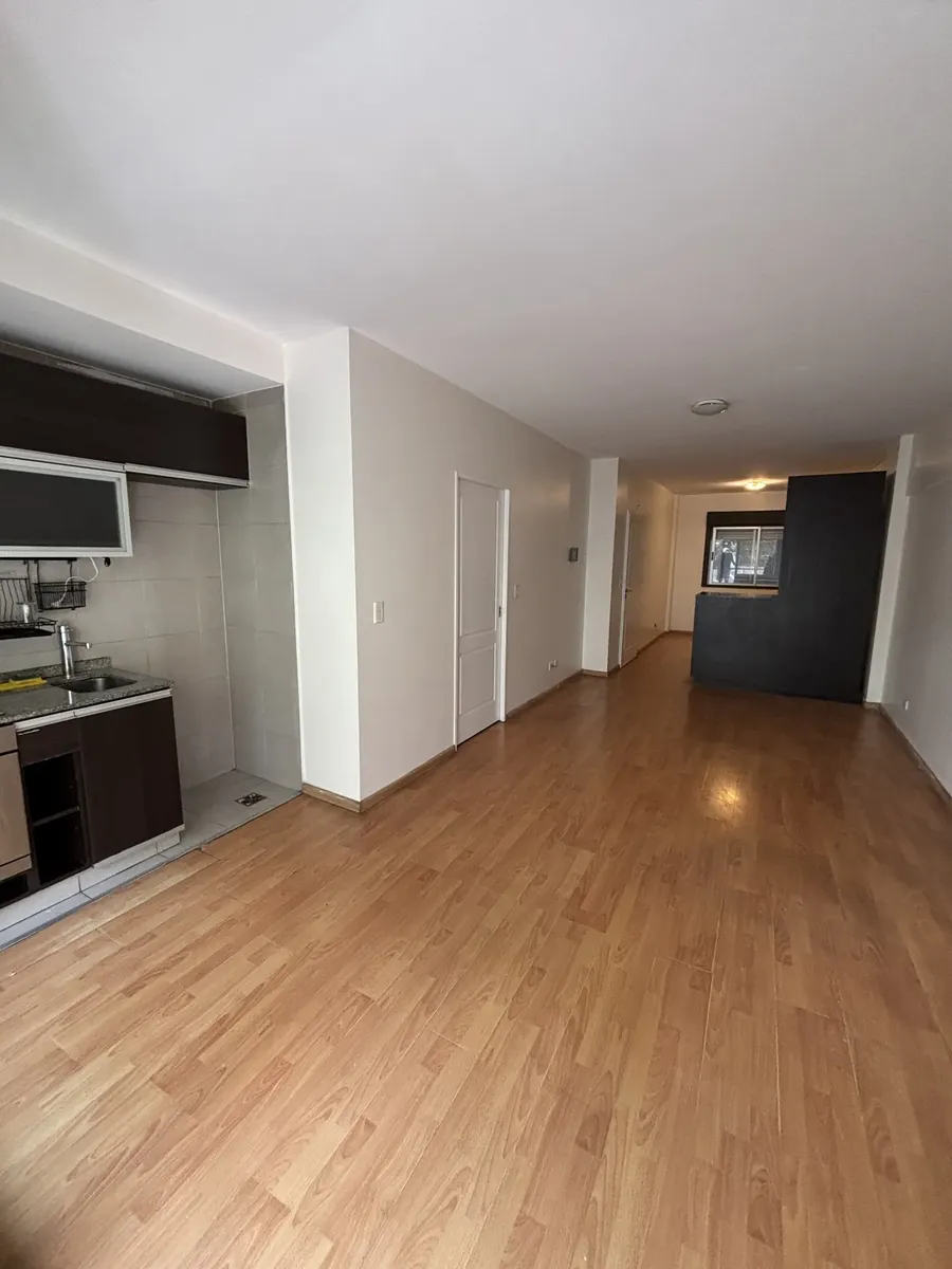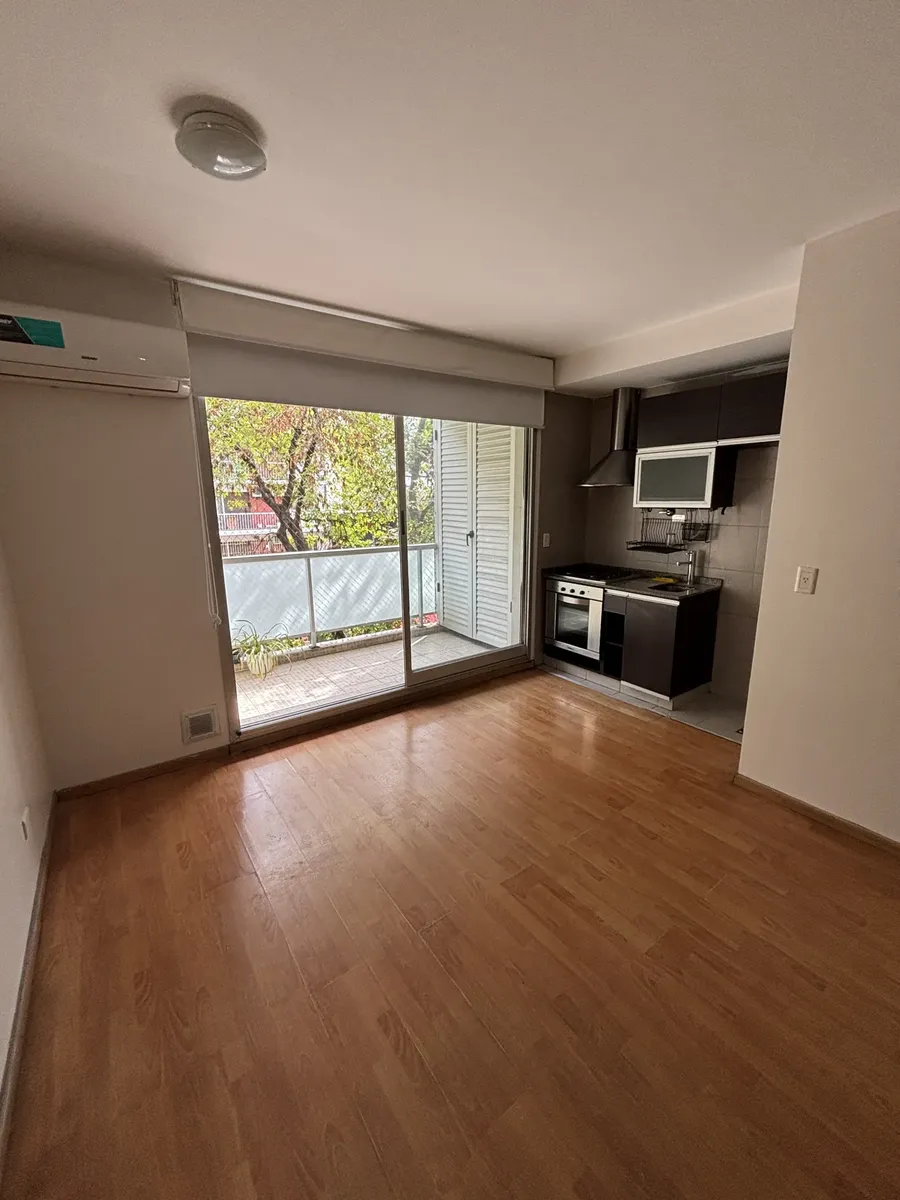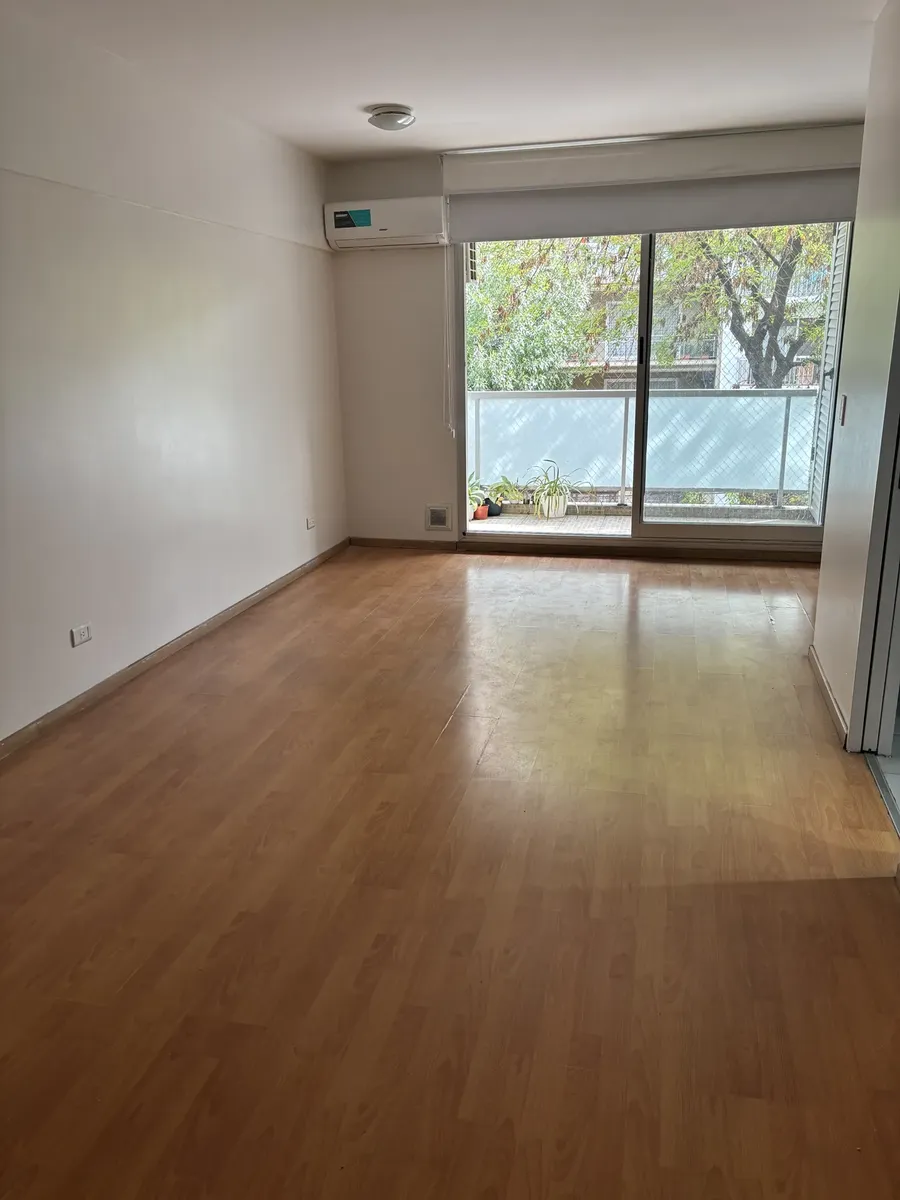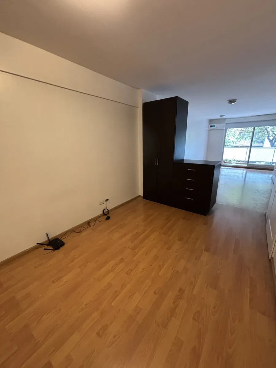 Monoambiente divisible de 40 m² al frente, con balcón. La división se realiza mediante un mueble de madera (placard) que delimita una superficie destinada a dormitorio con ventana al aire y luz. Cuenta con cocina incorporada con espacio para heladera, cocina a gas y balcón al frente, con sector para lavadero y caldera, además de baño completo. Tiene calefacción por piso radiante, agua caliente con caldera individual y aire acondicionado frío/calor. Apto profesional. No se aceptan mascotas.