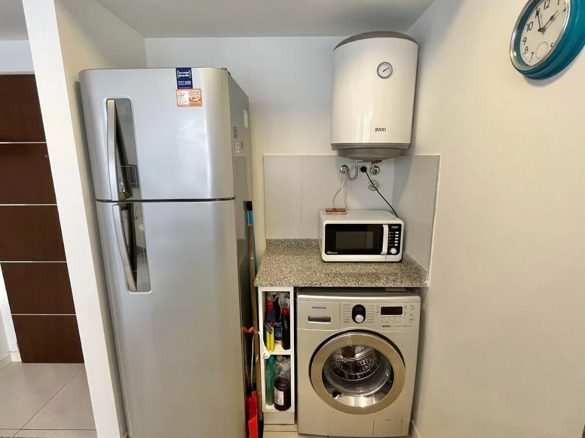 Departamento monoambiente de 1er piso al contrafrente en Villa Urquiza, con salida a balcón corrido. Amoblado e incluye cama matrimonial, Smart TV, mesa de comedor con sillas y aire acondicionado frío/calor. Cocina integrada con anafe y horno eléctricos, heladera con freezer y microondas, con lavarropas propio incorporado. El edificio cuenta con piscina y solárium. Alquiler mensual $750.000; expensas y servicios (Luz, Agua, ABL) a cargo del inquilino. Requiere seguro de caución y depósito en gar