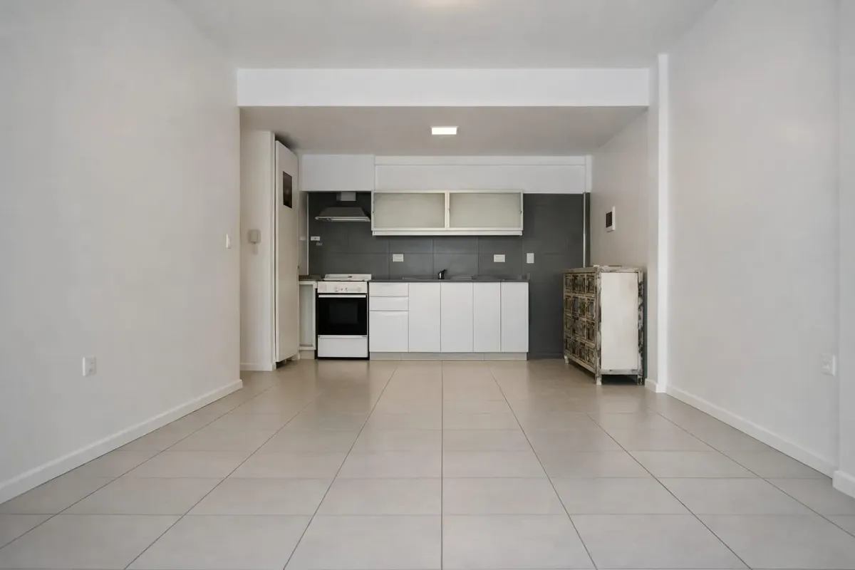 Departamento monoambiente de 36 m² cubiertos y 4 m² de espacio exterior, al frente, con balcón corrido. Cuenta con cochera fija y cubierta. La cocina tiene muebles bajo y sobre mesada y cocina a gas con 4 hornallas y horno; el baño es completo con bañera y mampara. Dispone de placards y aire acondicionado tipo split. El edificio tiene 10 años de antigüedad, con ascensor, y se ubica a metros de Av. Triunvirato y Galván. El alquiler requiere depósito de 700 USD, incremento trimestral según IPC y p
