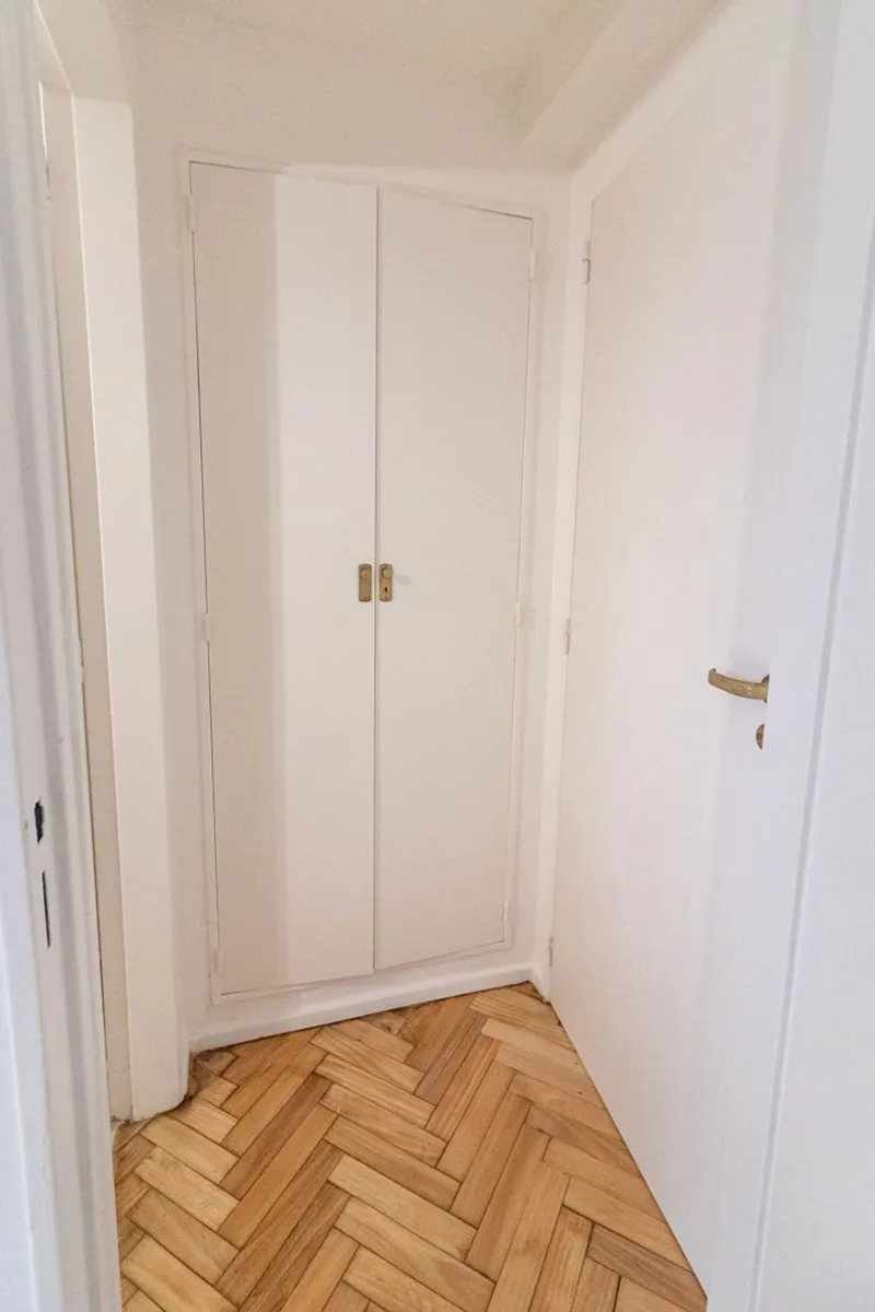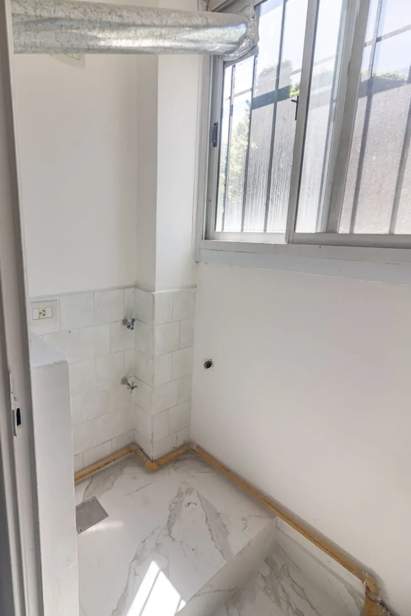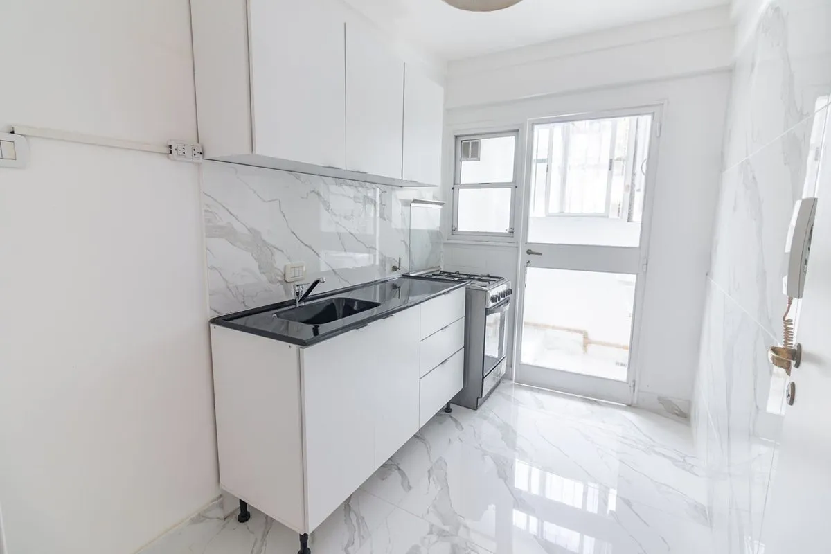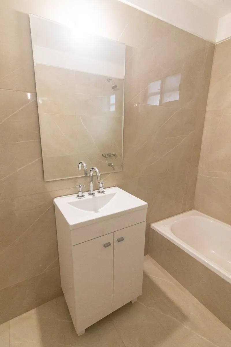 Two-room apartment with a studio layout, fully refurbished “as new”, with covered laundry area and an (assigned) parking space with an automatic gate. North-facing unit with hardwood floors, separate living-dining room and bedroom, air conditioning, and a balanced-draft heating system. Renovated bathroom with new plumbing, exterior window, vanity and built-in storage; renovated kitchen with upper cabinets and base units, plus a laundry room with a sink and space for a washing machine. Located in