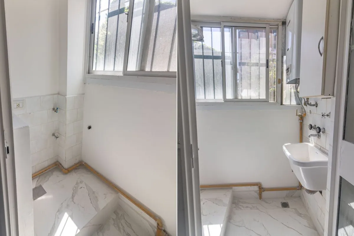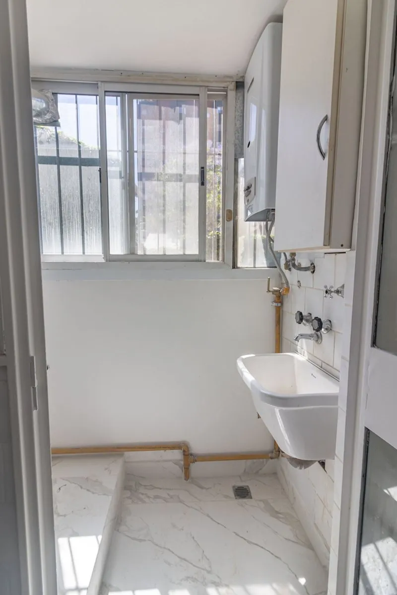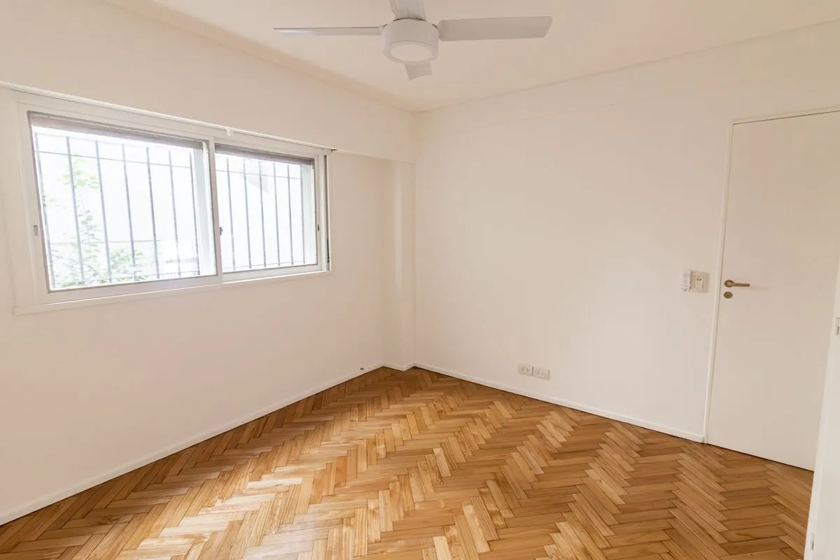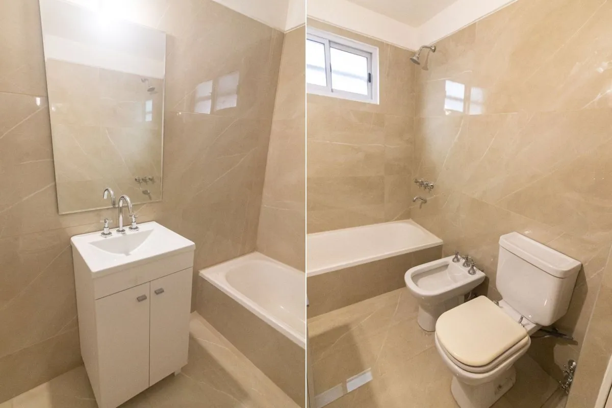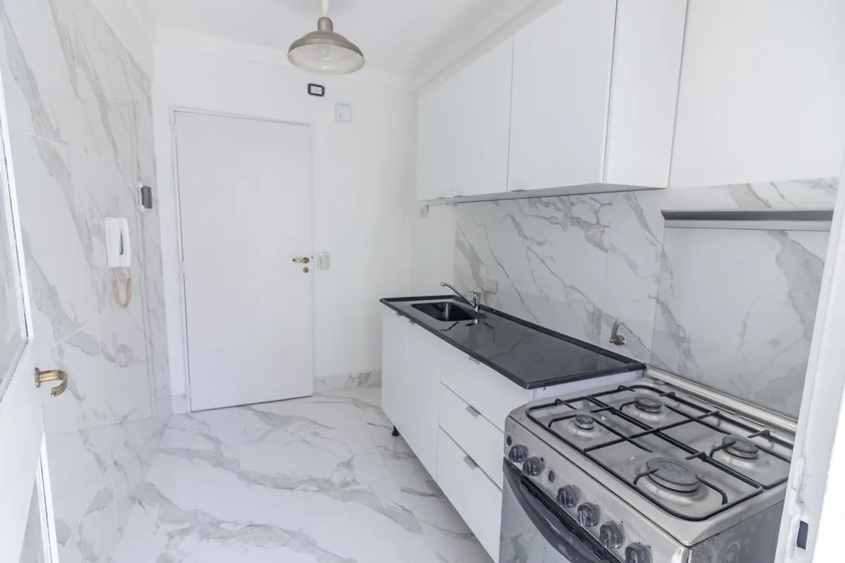 Two-room apartment with a studio layout, fully refurbished “as new”, with covered laundry area and an (assigned) parking space with an automatic gate. North-facing unit with hardwood floors, separate living-dining room and bedroom, air conditioning, and a balanced-draft heating system. Renovated bathroom with new plumbing, exterior window, vanity and built-in storage; renovated kitchen with upper cabinets and base units, plus a laundry room with a sink and space for a washing machine. Located in