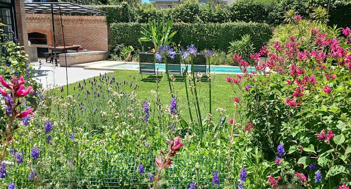 Renovated 1917 villa with 4 bedrooms, fully restored. The property has a pool and a garden with seating areas. Bedrooms include private bathrooms, and guests can use the living room, dining room, swimming pool and garden.