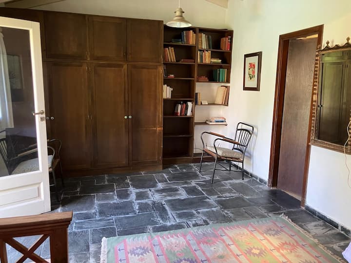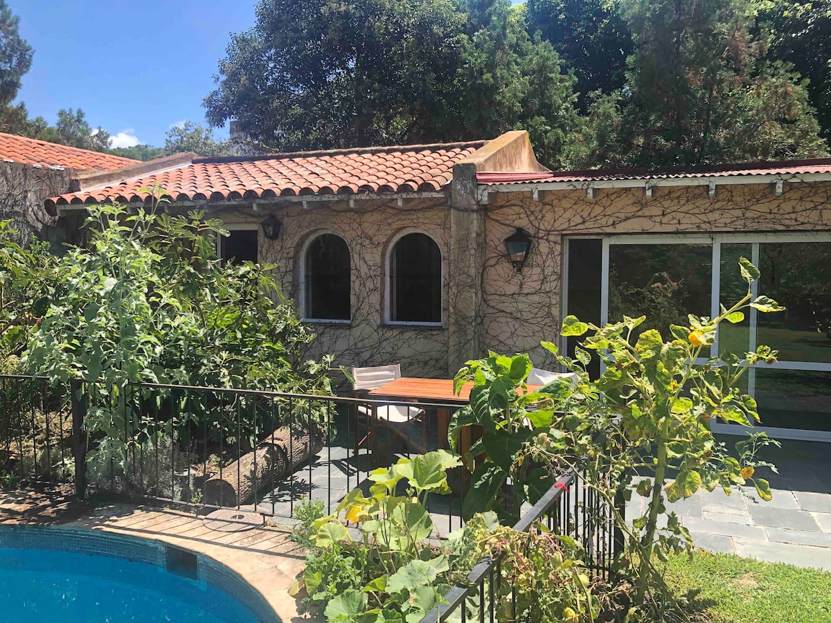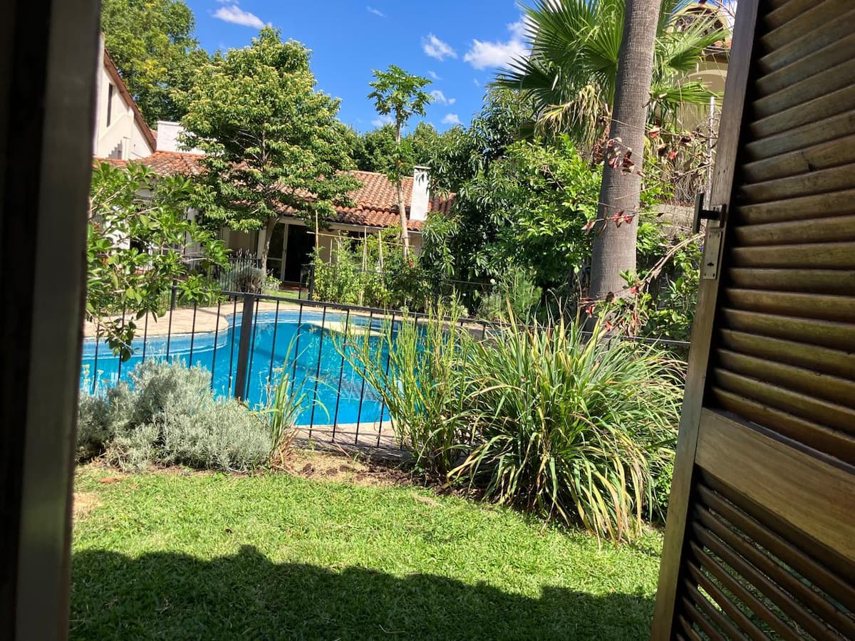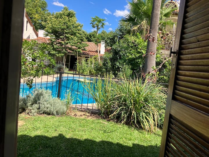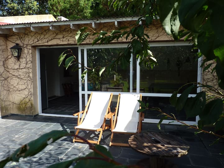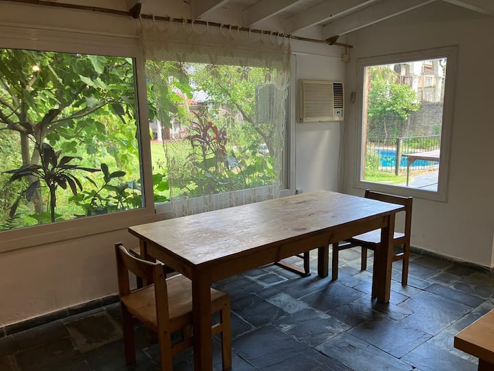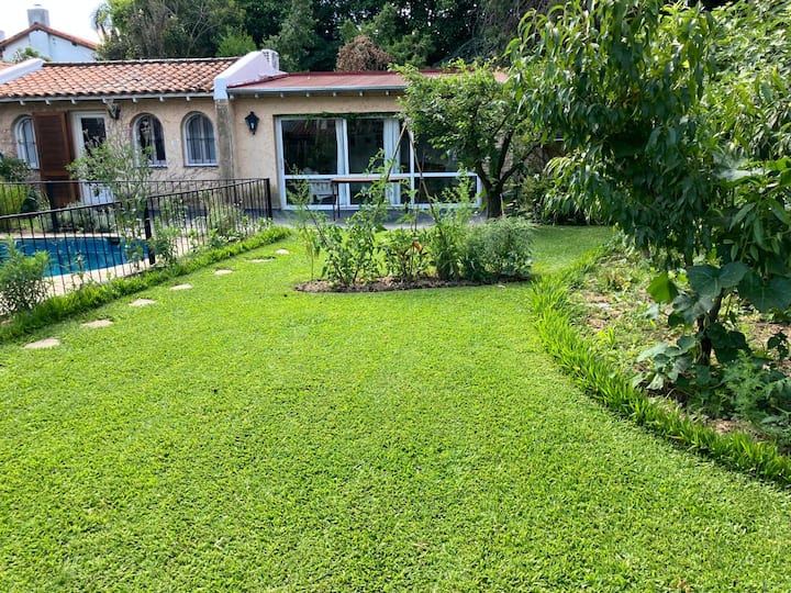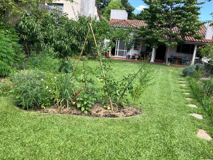 Apartment with 1 bedroom, located at the ground end of the house with a private entrance. Access includes a shared quincho with a microwave, electric hornito, refrigerator, electric stove and an electric griddle, and there is a pool for use on hot days. The property also has a garden with several fruit trees, and availability of fruit and vegetables varies by season.