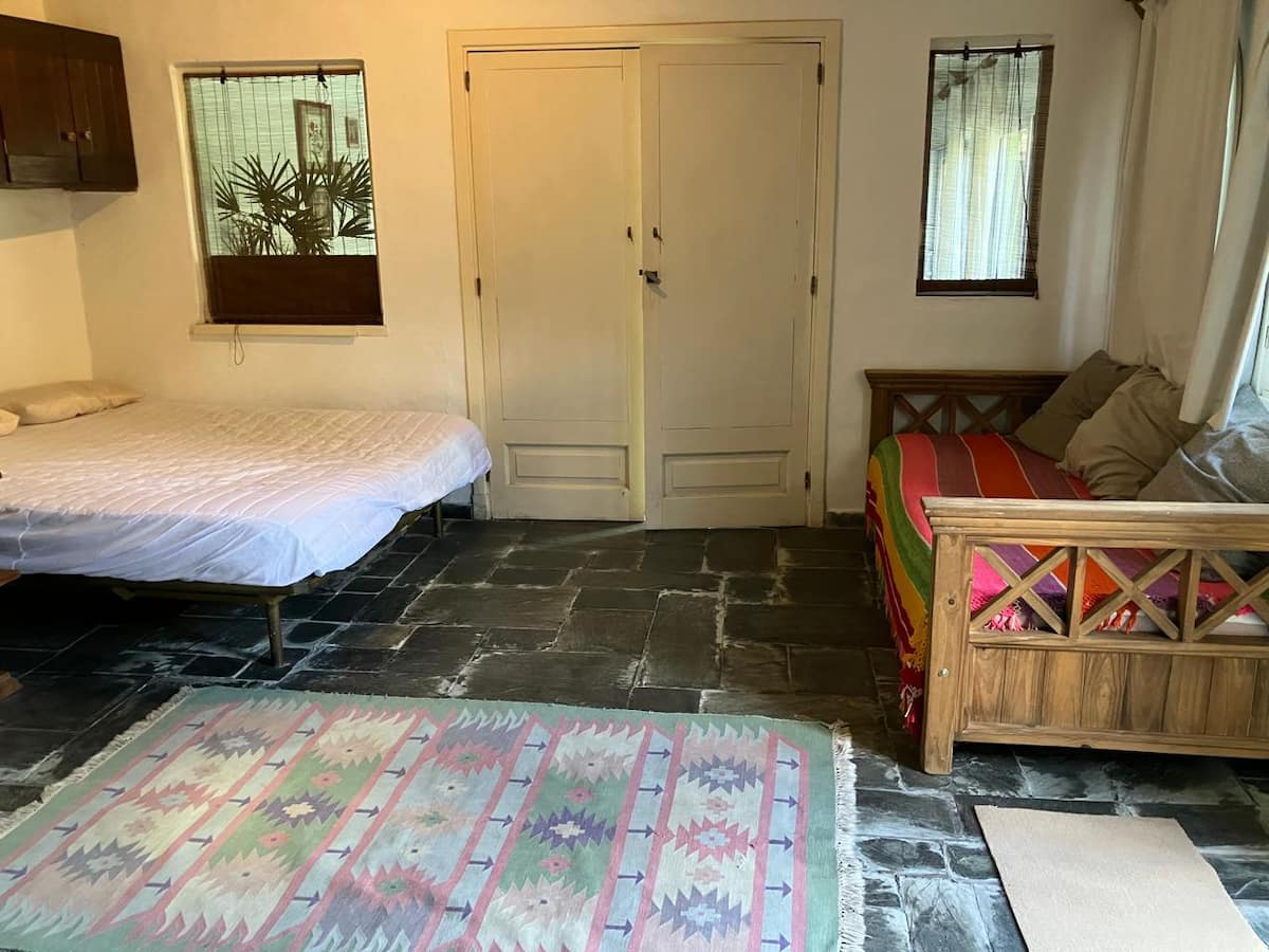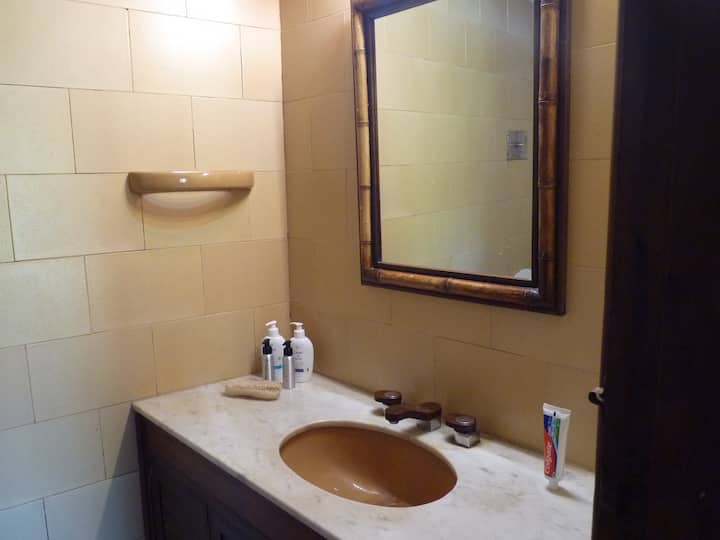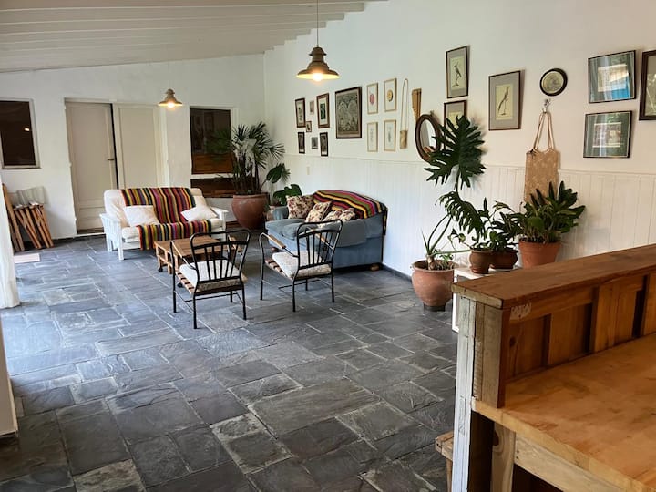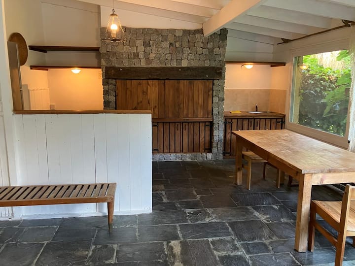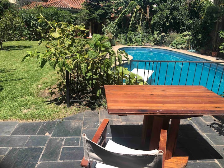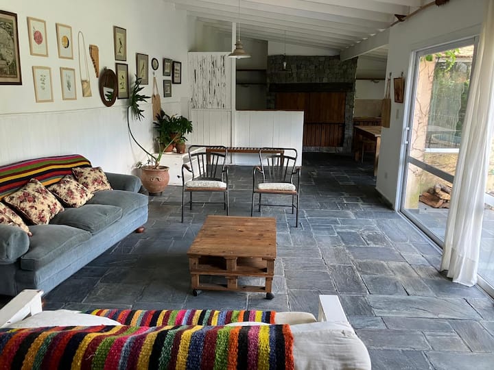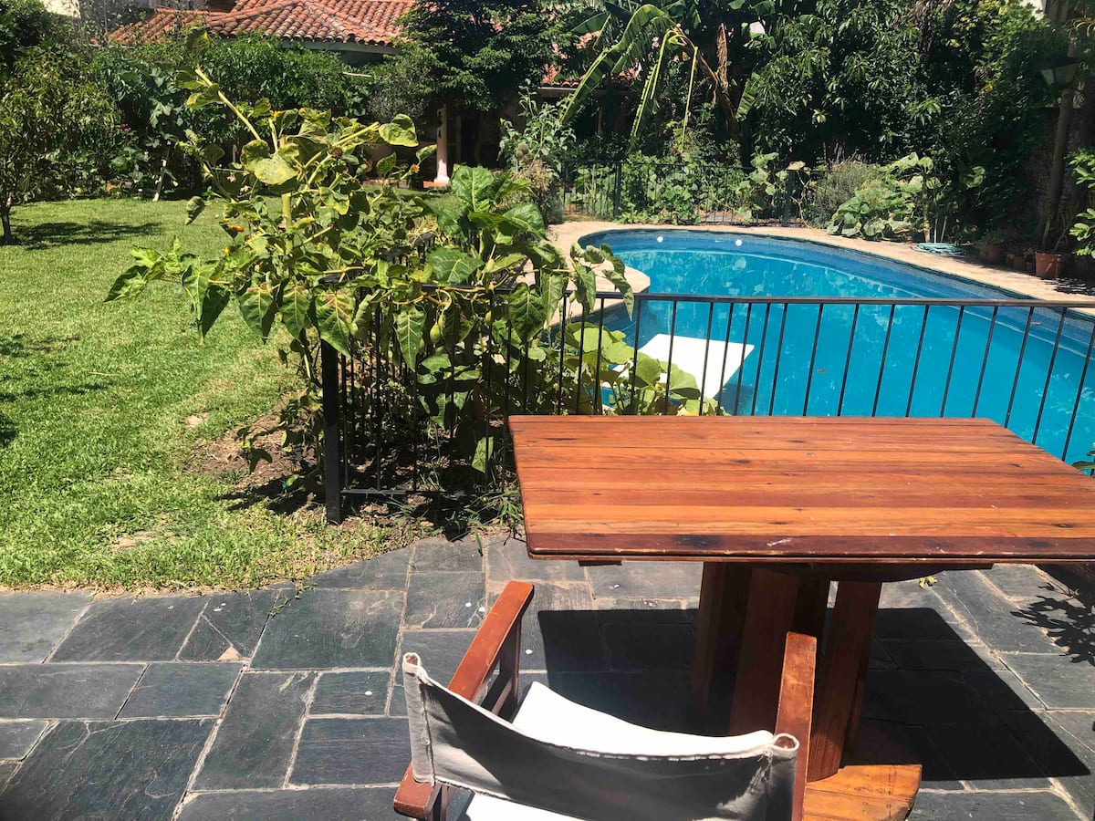 Apartment with 1 bedroom, located at the ground end of the house with a private entrance. Access includes a shared quincho with a microwave, electric hornito, refrigerator, electric stove and an electric griddle, and there is a pool for use on hot days. The property also has a garden with several fruit trees, and availability of fruit and vegetables varies by season.