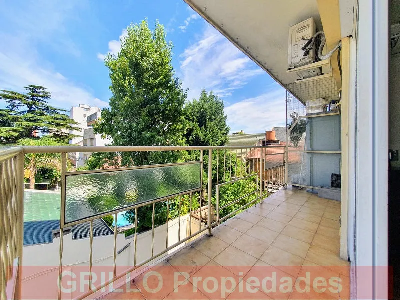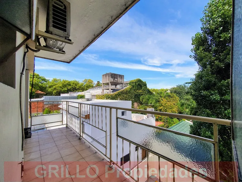 Studio apartment with independent kitchen and built-in wardrobe, 35 m² total (30 m² covered) on the 2nd floor at the rear (courtyard-facing). It has air conditioning and gas water heater; wood-plastified flooring in the living-dining area. There is a 5 m² balcony with open views and light. Building with 6 floors and 5 units per floor; building fees are described as low and include AySA (water). No pets. Rental term is 2 years with quarterly step-ups; rent is due between the 1st and 5th of each m