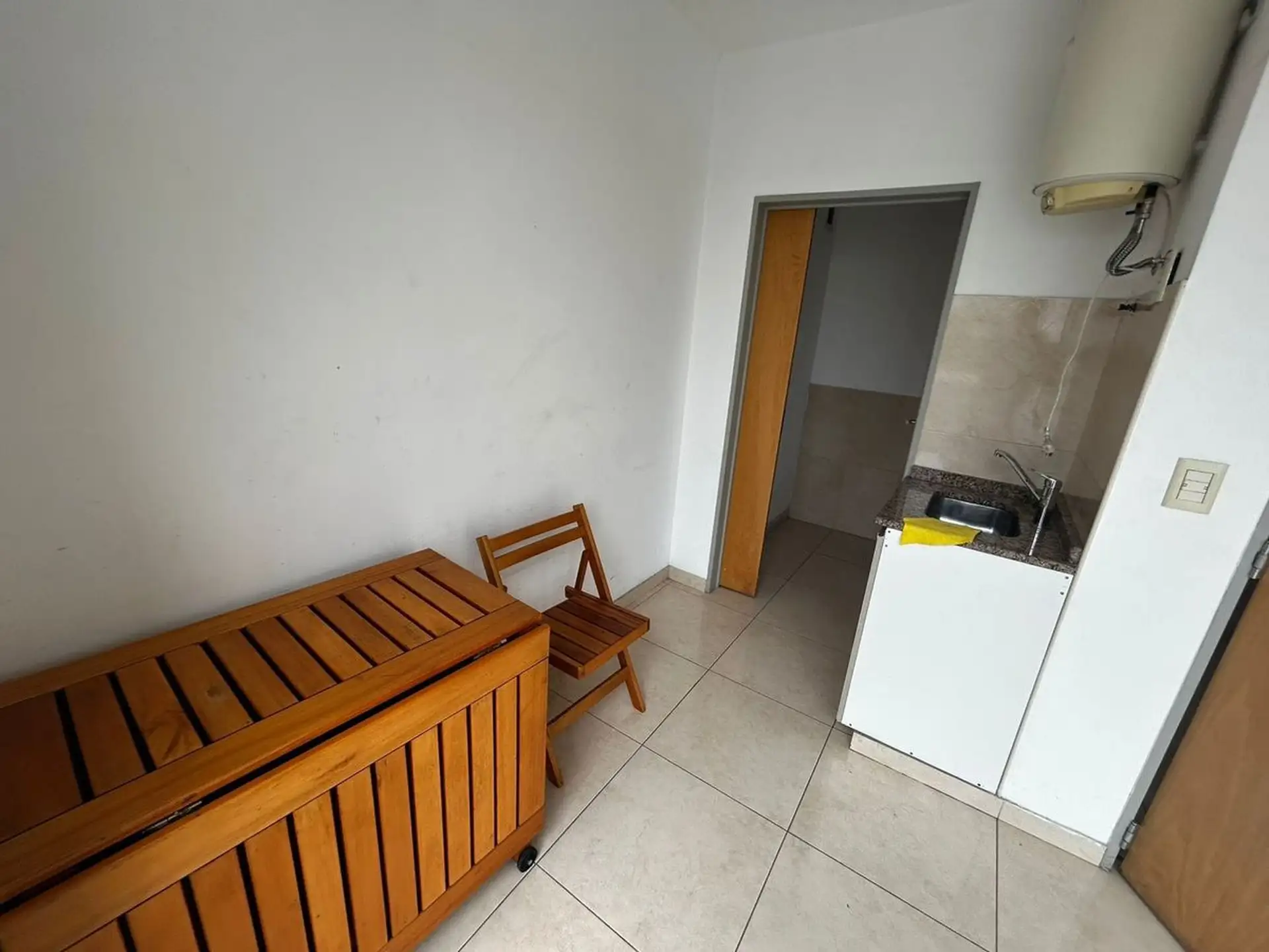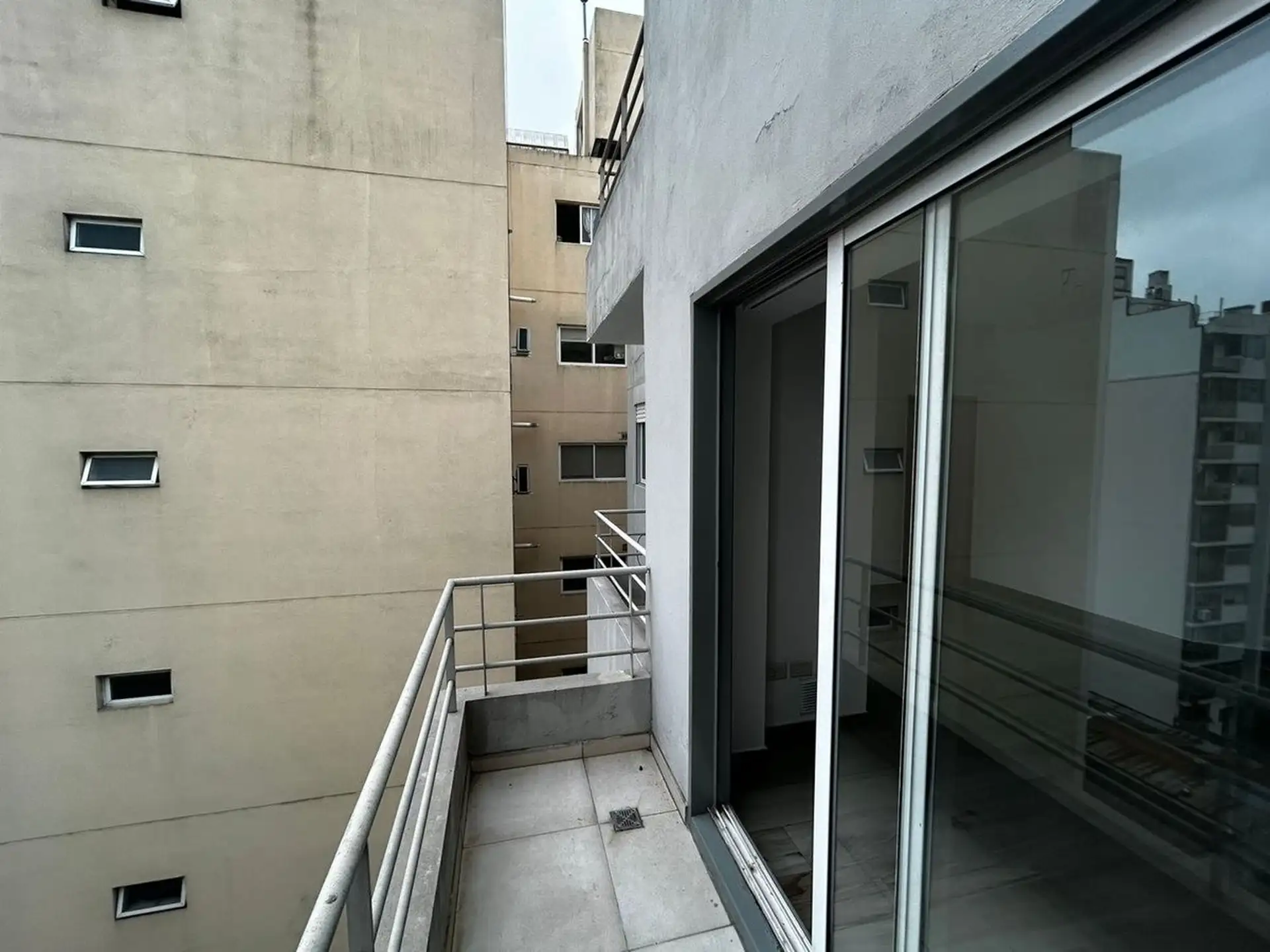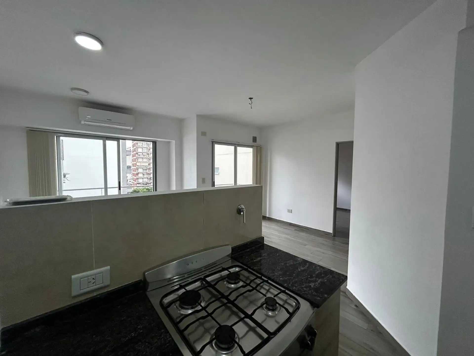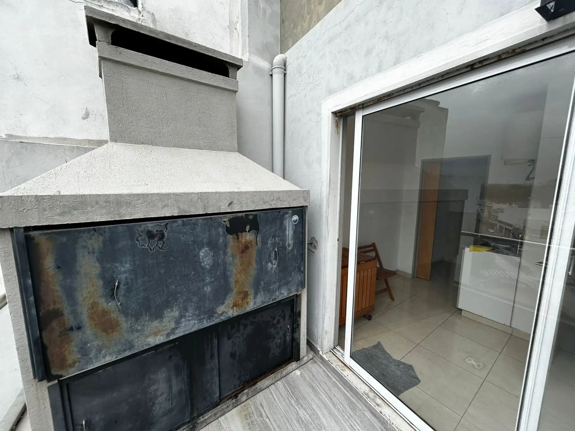 Two-room apartment on the 8th floor in Villa del Parque, west-facing and courtyard-facing (contrafrente). It has 1 bedroom and a large living-dining area with 2 balconies. The building has SUM, solarium, a grill area (parrilla), and a generator. The unit includes a Orbis stainless-steel kitchen with built-in lower cabinets and pantry, granite countertops, an inox sink, connection for a washer (lavarropas), full bathroom with Ferrum fixtures and FV taps, a bedroom wardrobe with 3 doors, and hot/c