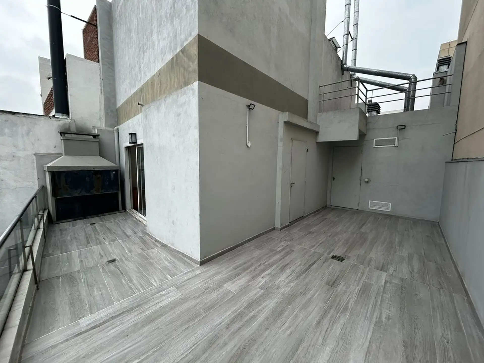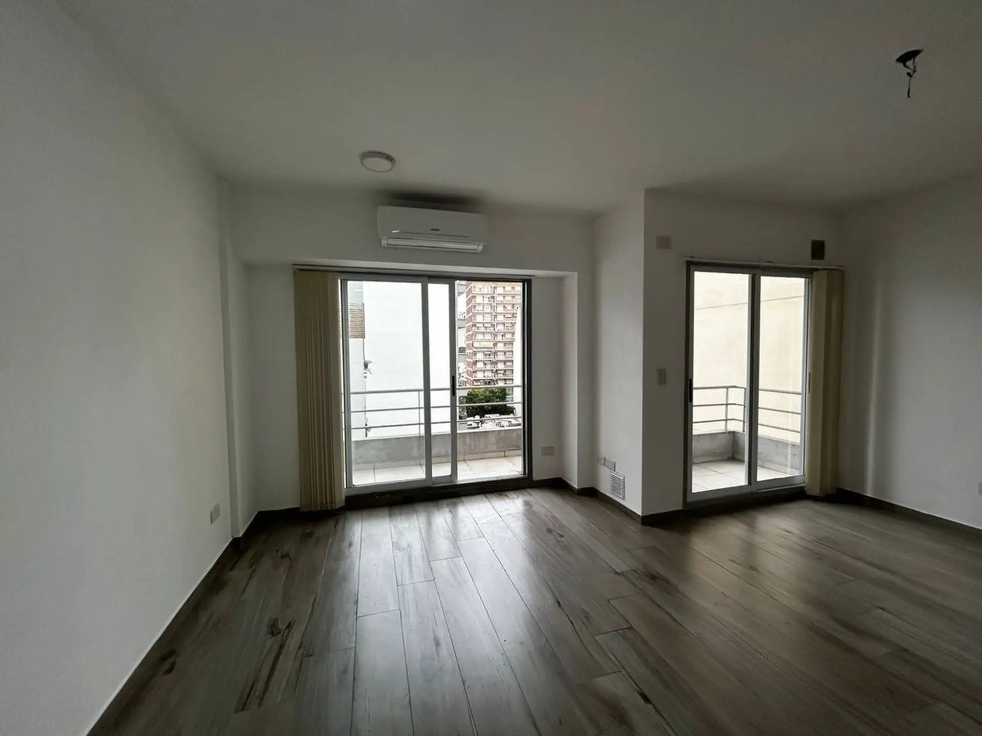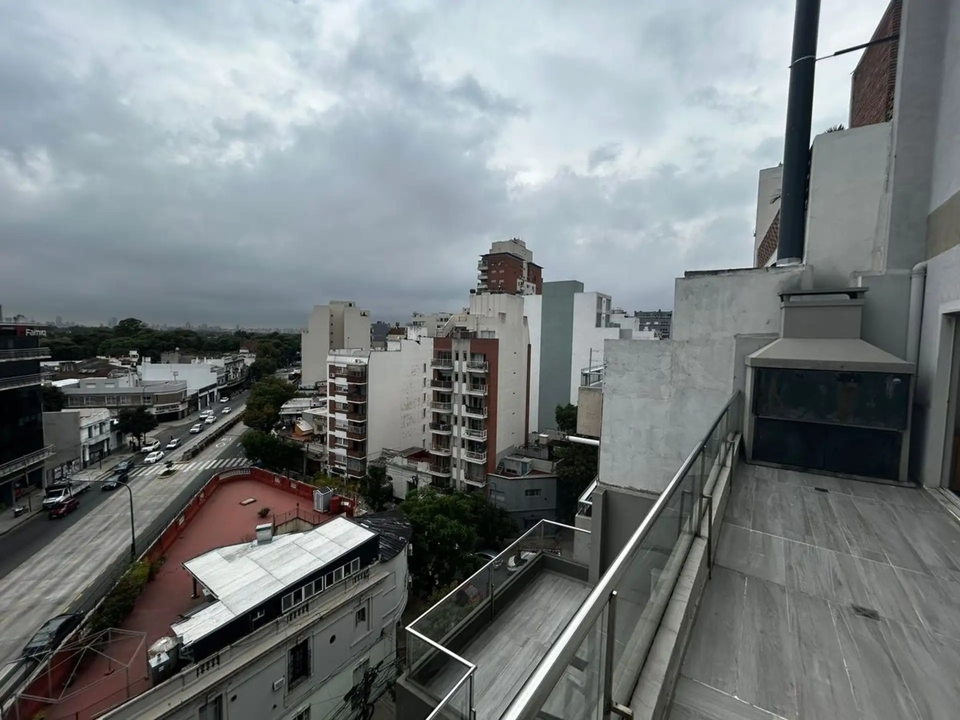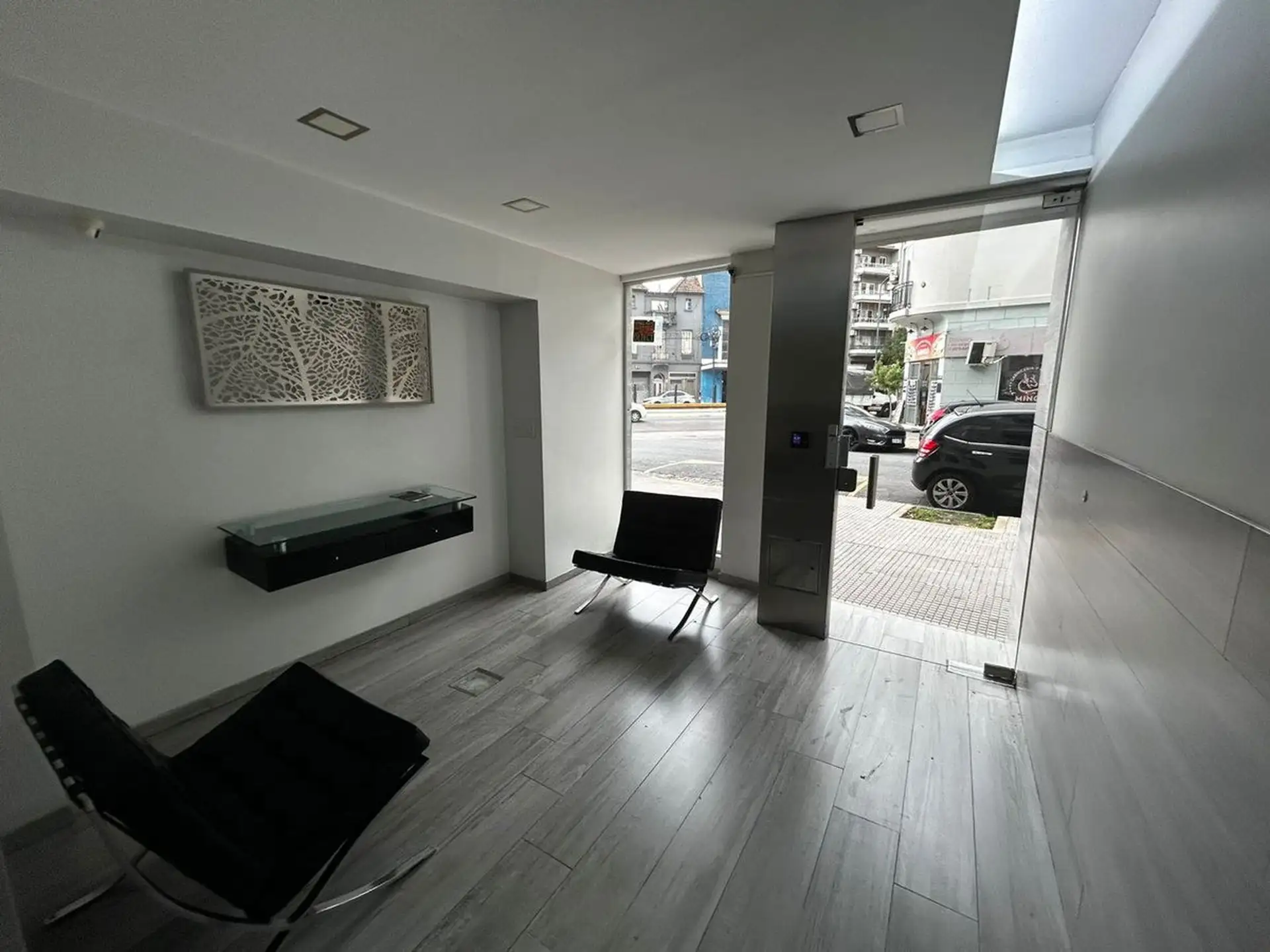 Two-room apartment on the 8th floor in Villa del Parque, west-facing and courtyard-facing (contrafrente). It has 1 bedroom and a large living-dining area with 2 balconies. The building has SUM, solarium, a grill area (parrilla), and a generator. The unit includes a Orbis stainless-steel kitchen with built-in lower cabinets and pantry, granite countertops, an inox sink, connection for a washer (lavarropas), full bathroom with Ferrum fixtures and FV taps, a bedroom wardrobe with 3 doors, and hot/c