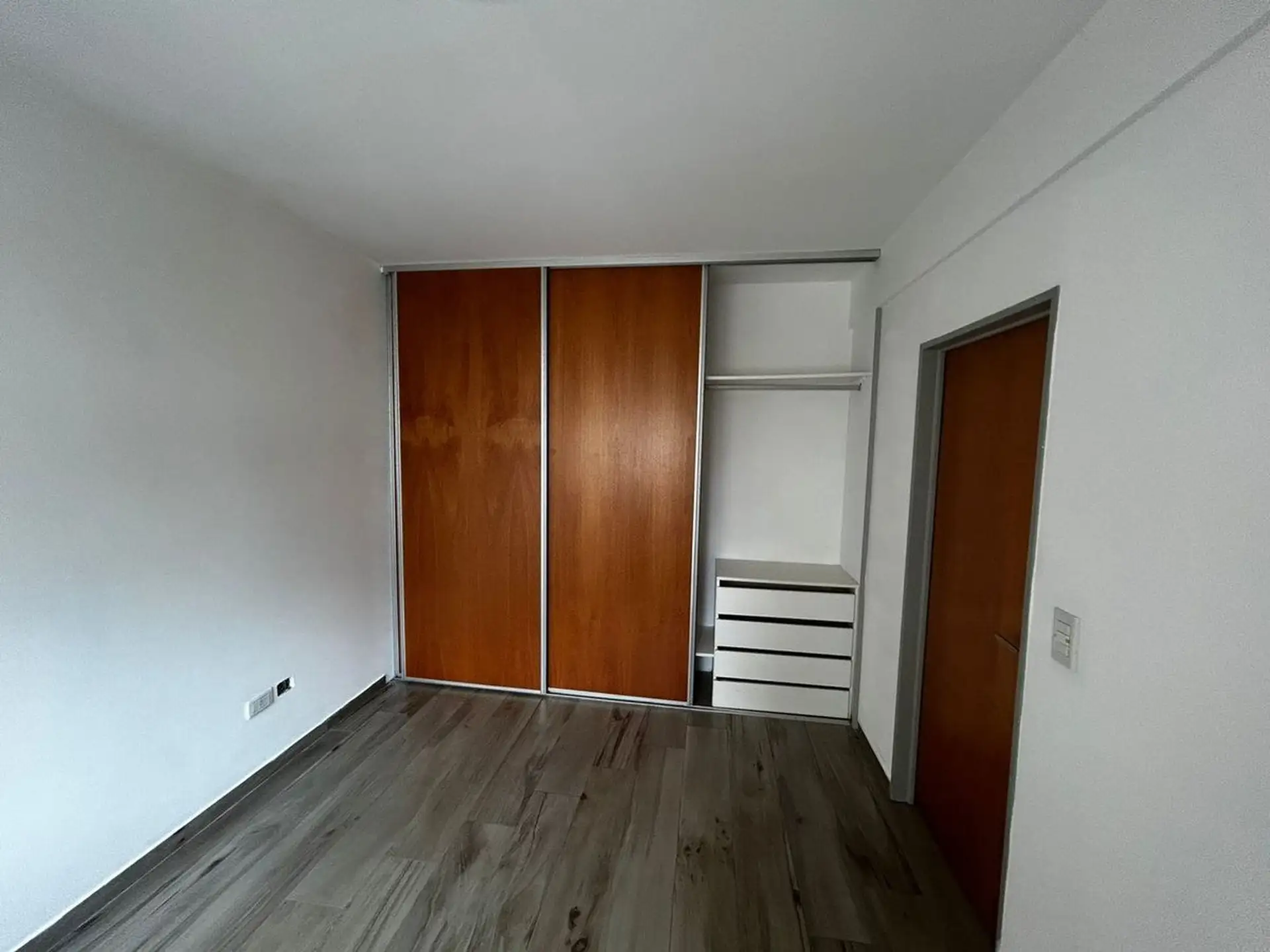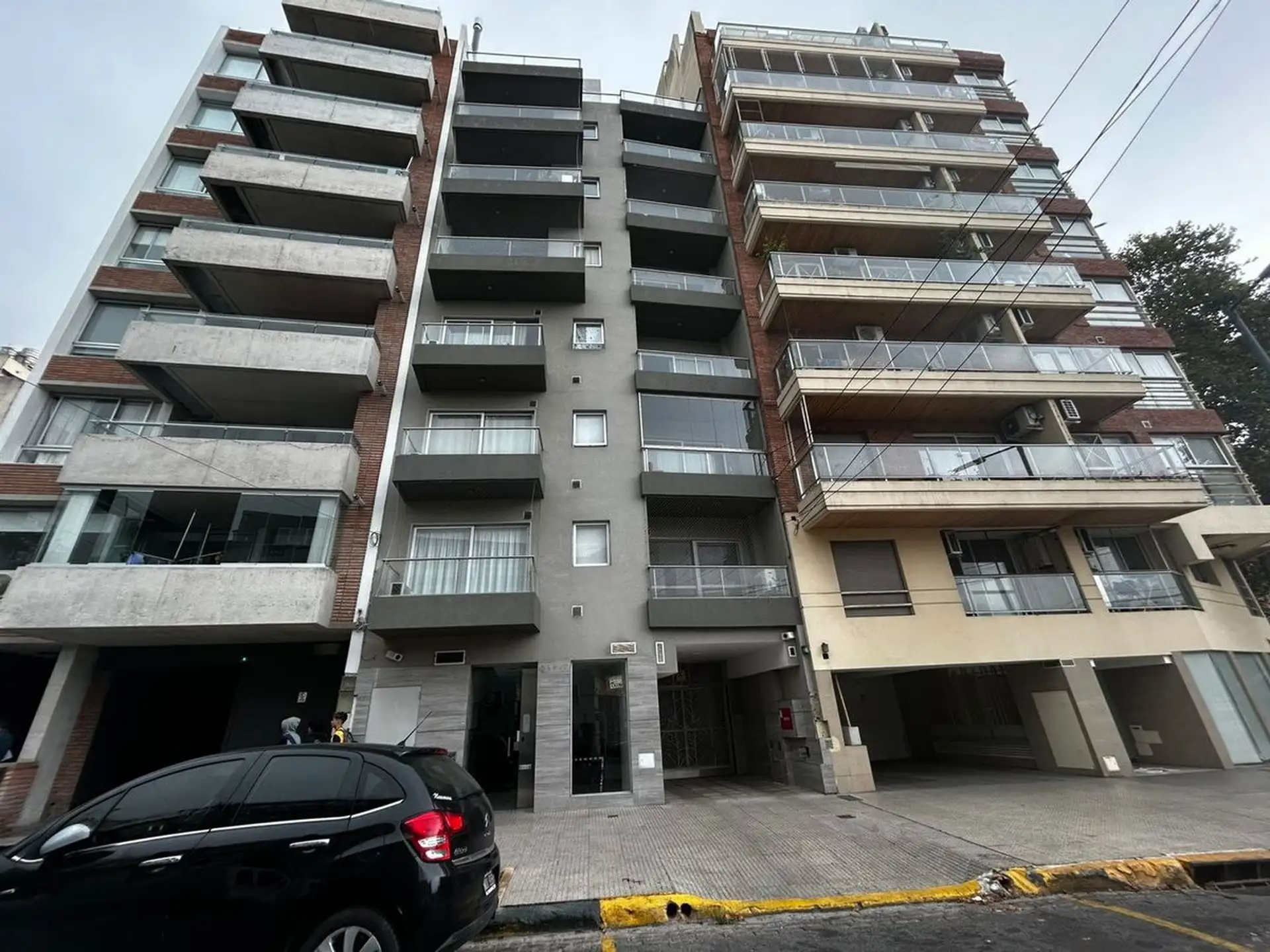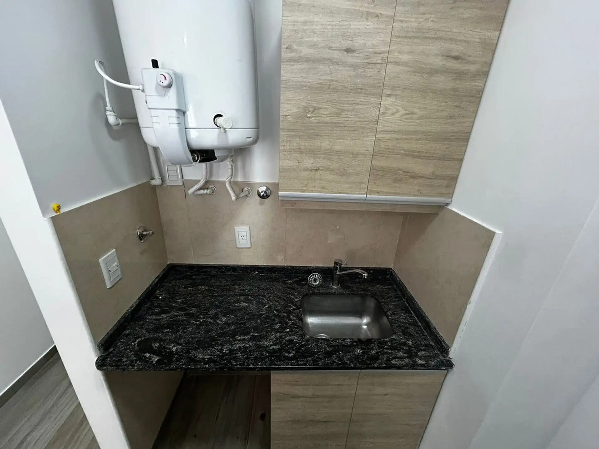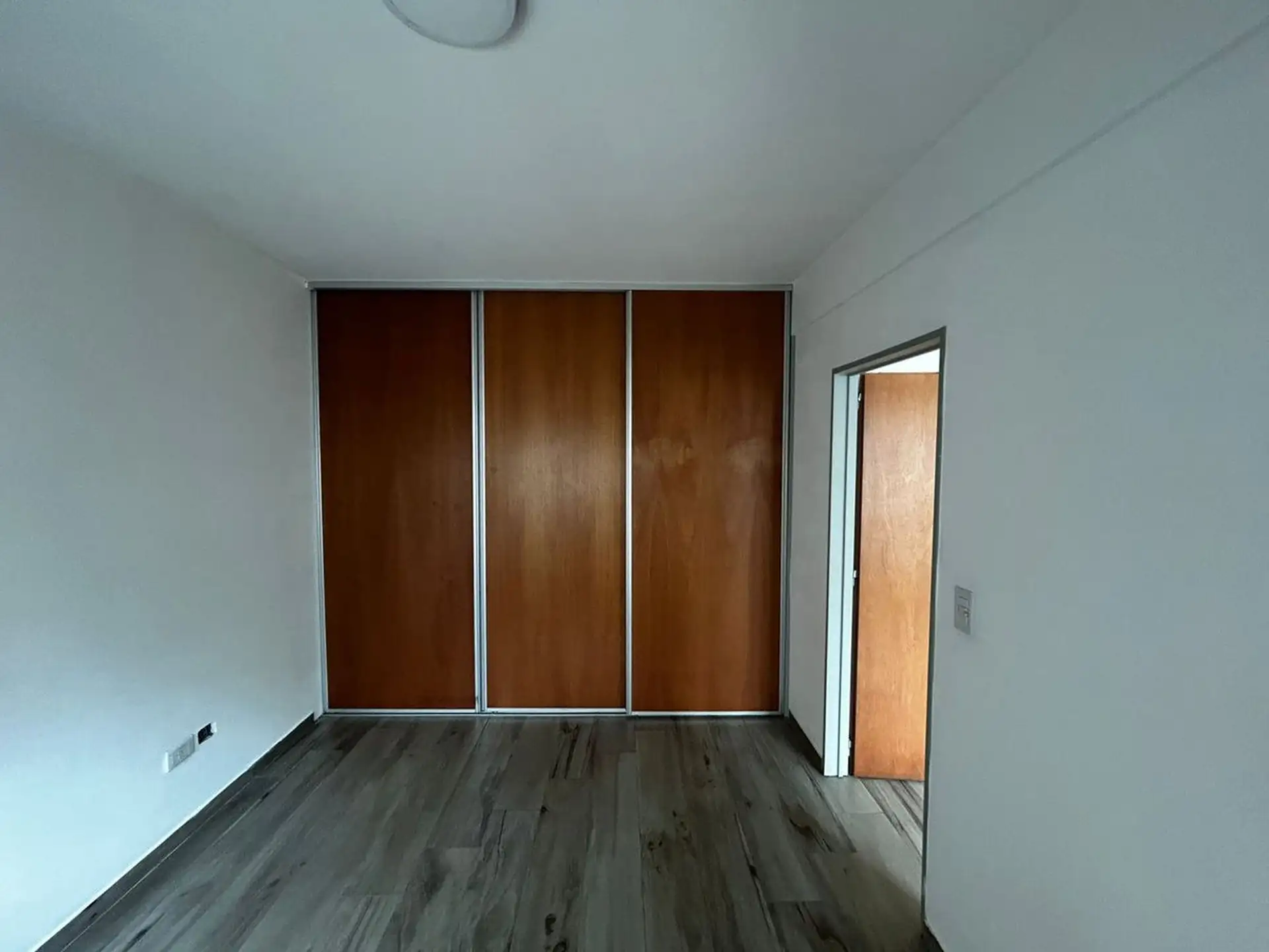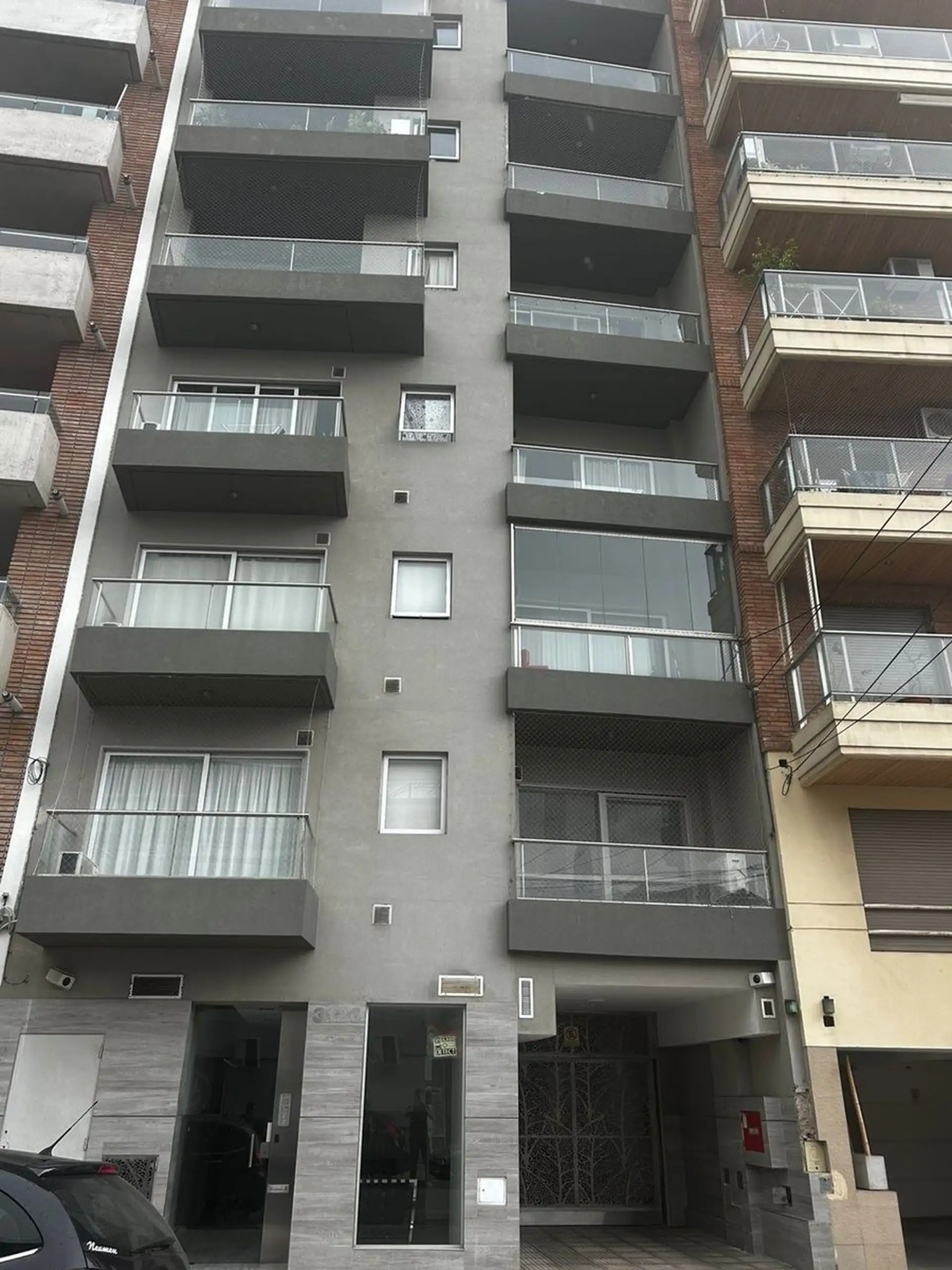 Two-room apartment on the 8th floor in Villa del Parque, west-facing and courtyard-facing (contrafrente). It has 1 bedroom and a large living-dining area with 2 balconies. The building has SUM, solarium, a grill area (parrilla), and a generator. The unit includes a Orbis stainless-steel kitchen with built-in lower cabinets and pantry, granite countertops, an inox sink, connection for a washer (lavarropas), full bathroom with Ferrum fixtures and FV taps, a bedroom wardrobe with 3 doors, and hot/c