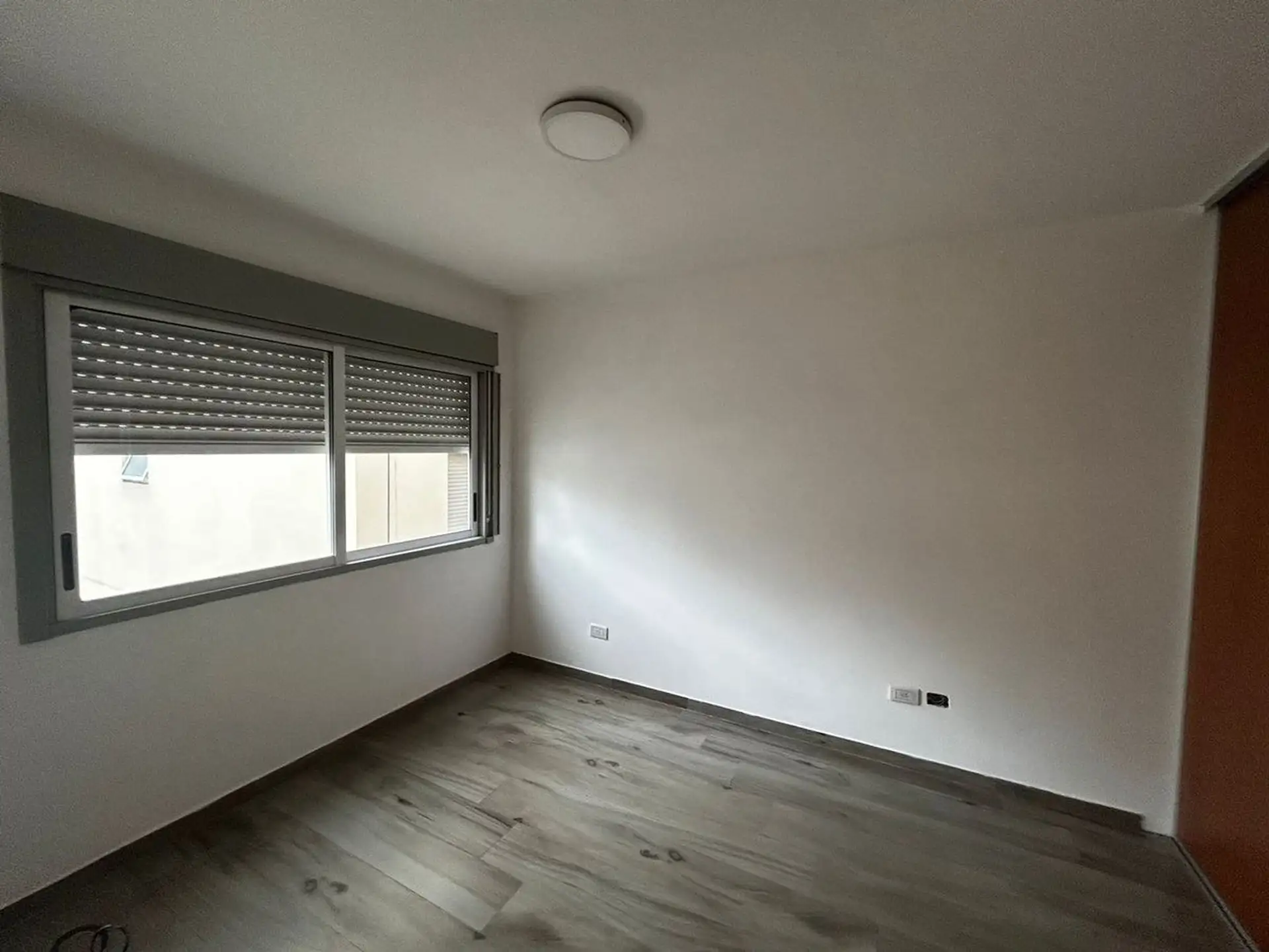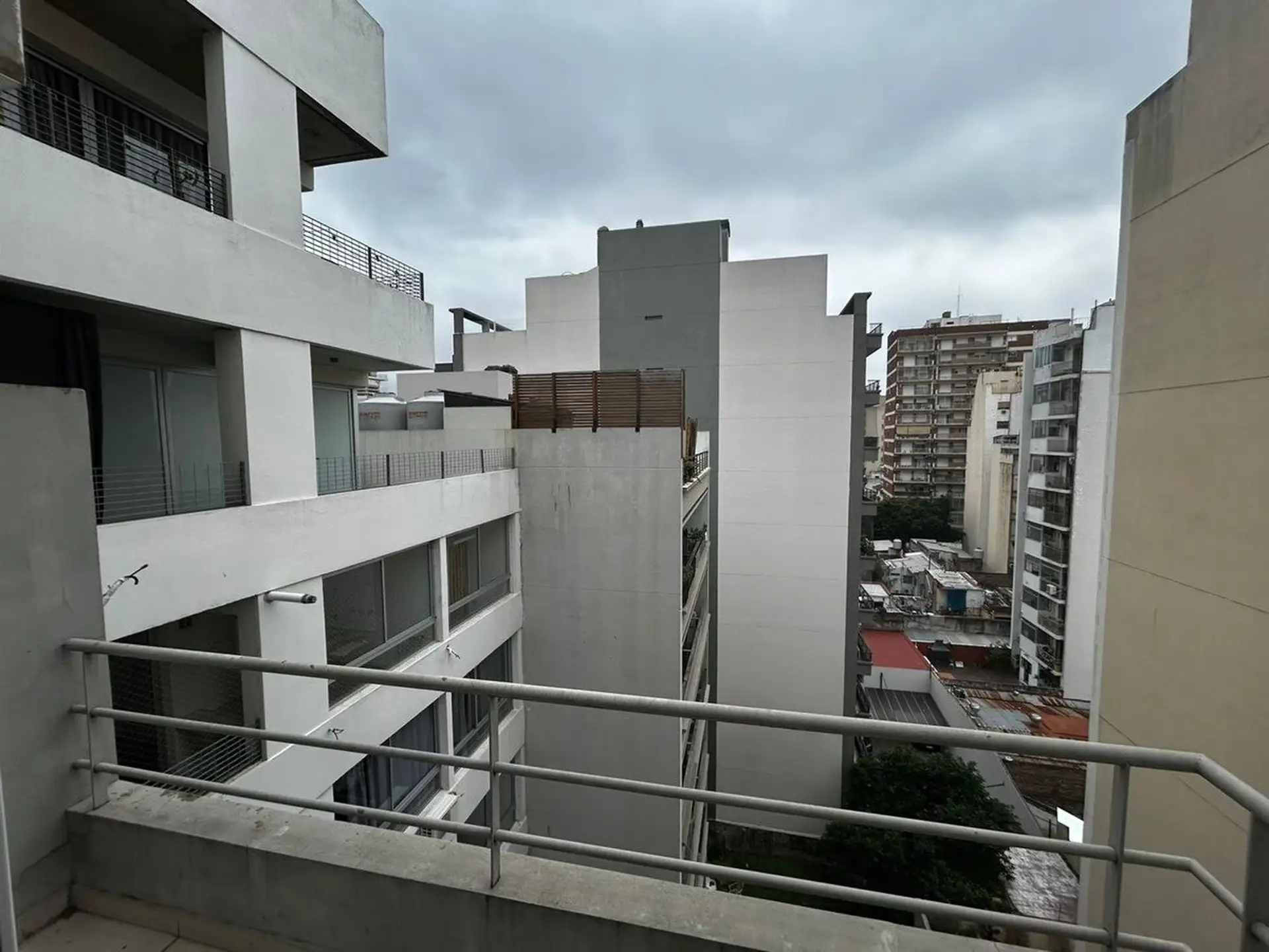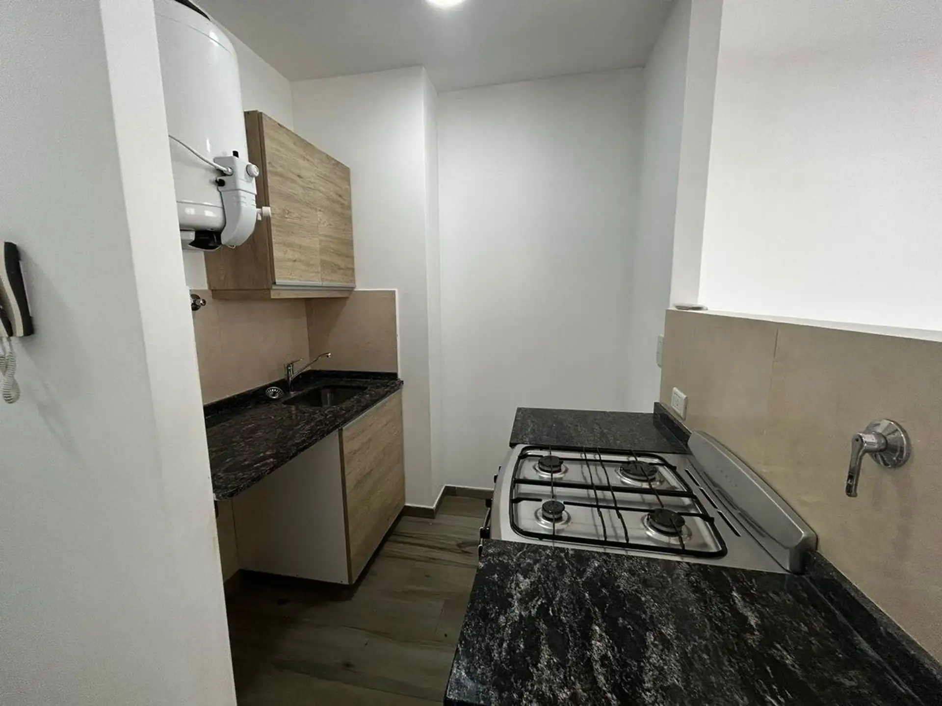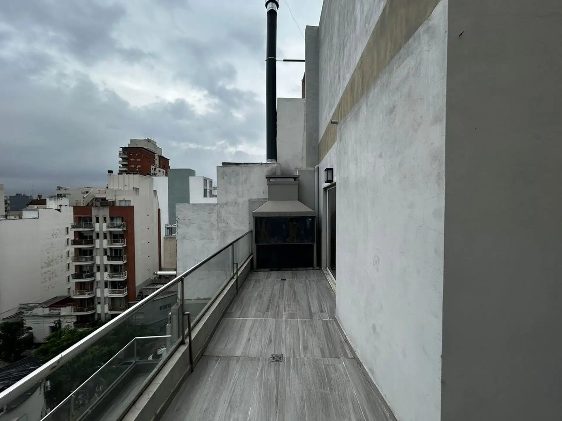 Two-room apartment on the 8th floor in Villa del Parque, west-facing and courtyard-facing (contrafrente). It has 1 bedroom and a large living-dining area with 2 balconies. The building has SUM, solarium, a grill area (parrilla), and a generator. The unit includes a Orbis stainless-steel kitchen with built-in lower cabinets and pantry, granite countertops, an inox sink, connection for a washer (lavarropas), full bathroom with Ferrum fixtures and FV taps, a bedroom wardrobe with 3 doors, and hot/c