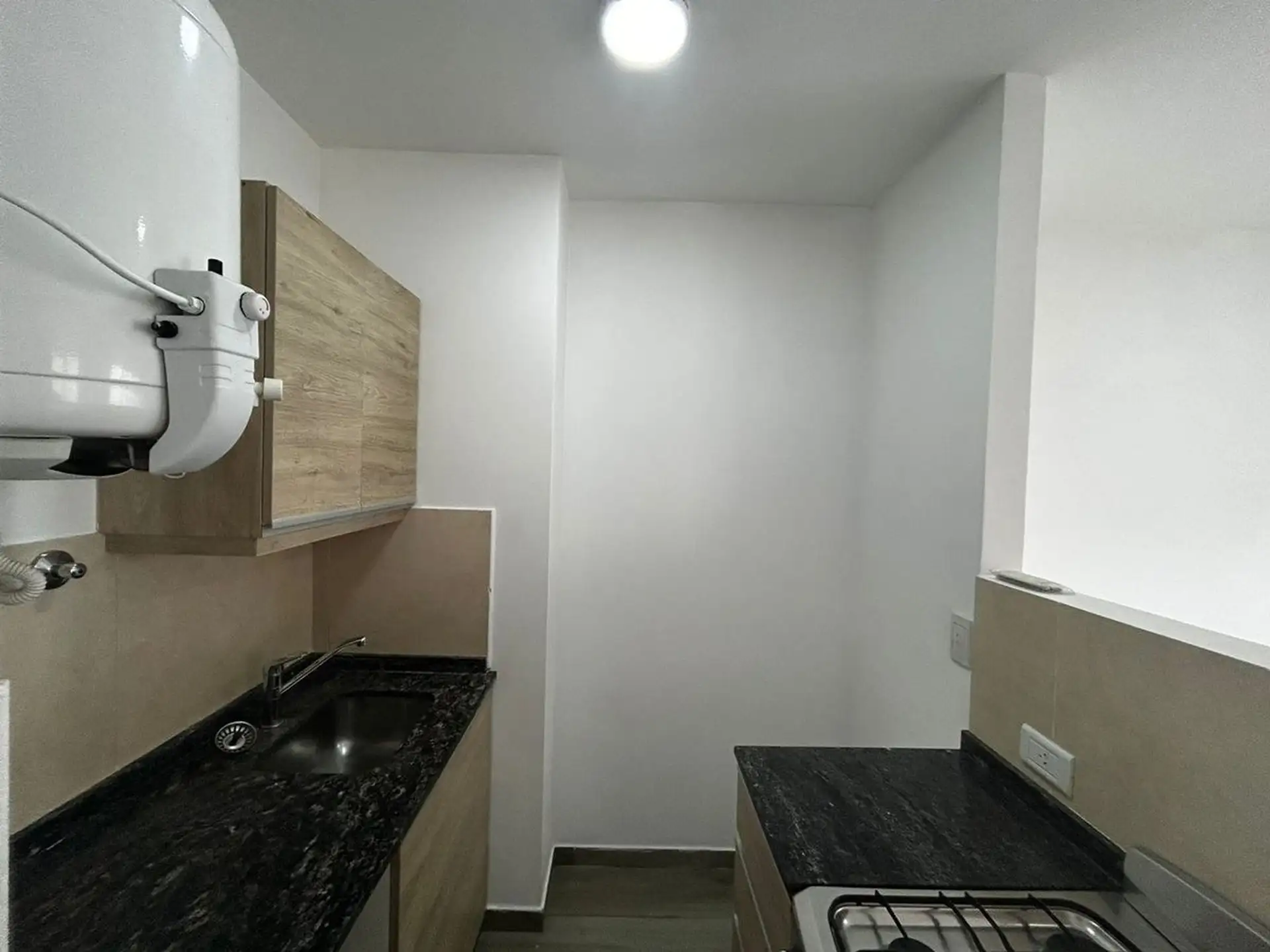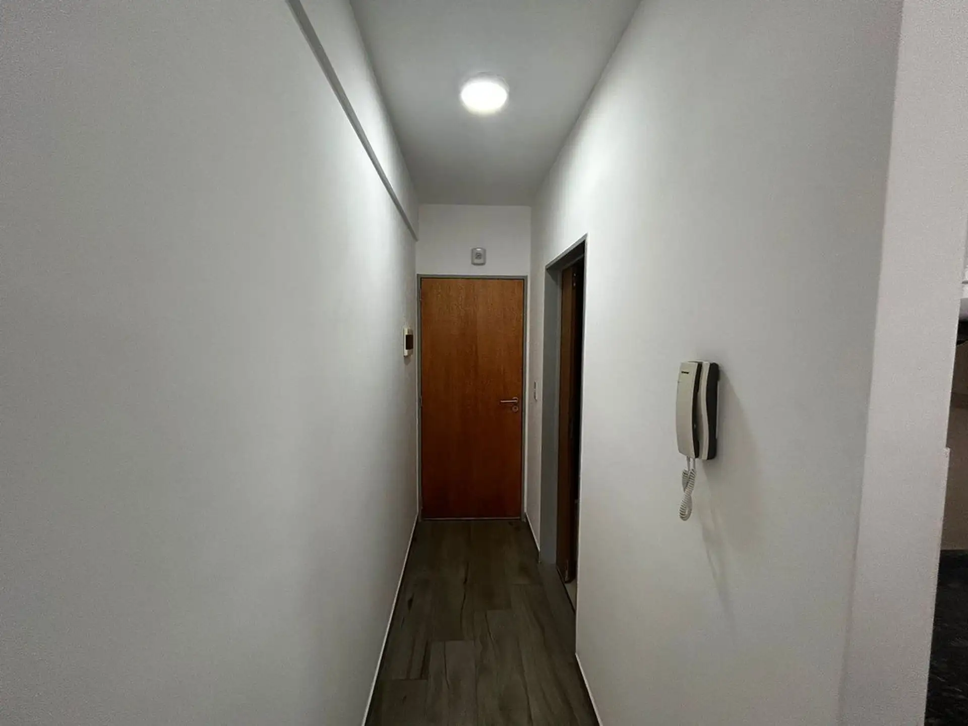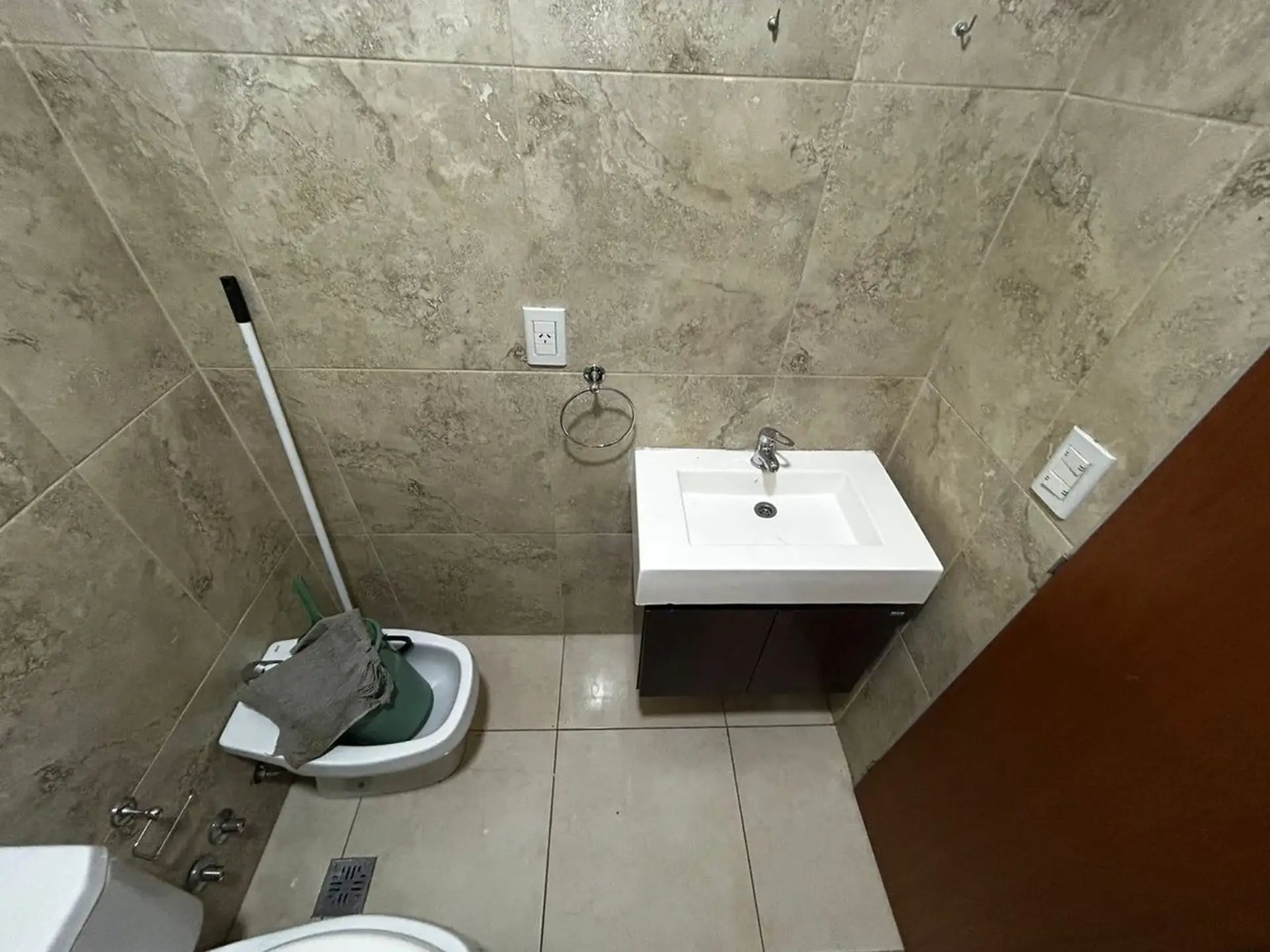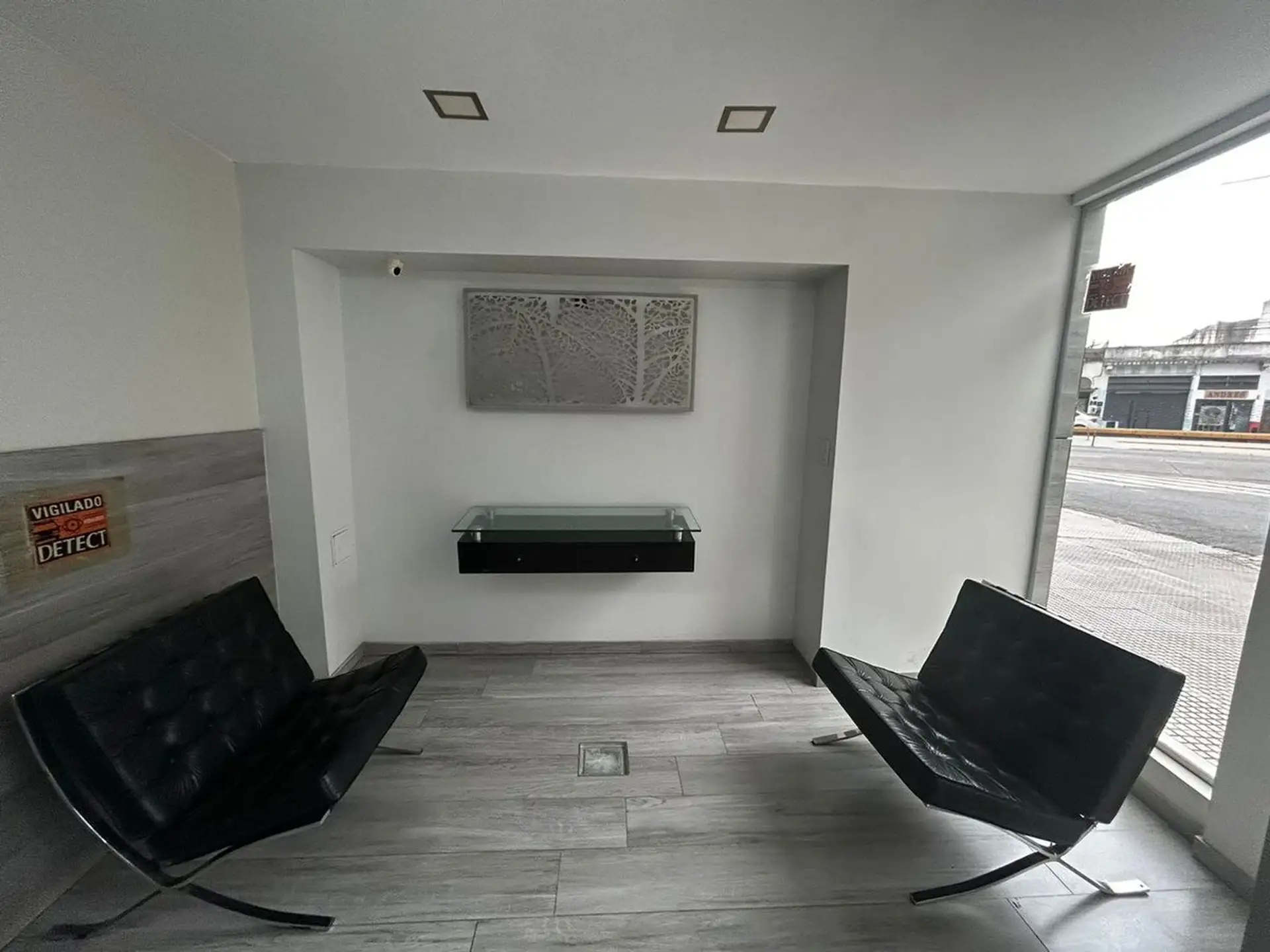 Two-room apartment on the 8th floor in Villa del Parque, west-facing and courtyard-facing (contrafrente). It has 1 bedroom and a large living-dining area with 2 balconies. The building has SUM, solarium, a grill area (parrilla), and a generator. The unit includes a Orbis stainless-steel kitchen with built-in lower cabinets and pantry, granite countertops, an inox sink, connection for a washer (lavarropas), full bathroom with Ferrum fixtures and FV taps, a bedroom wardrobe with 3 doors, and hot/c