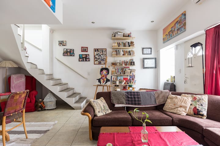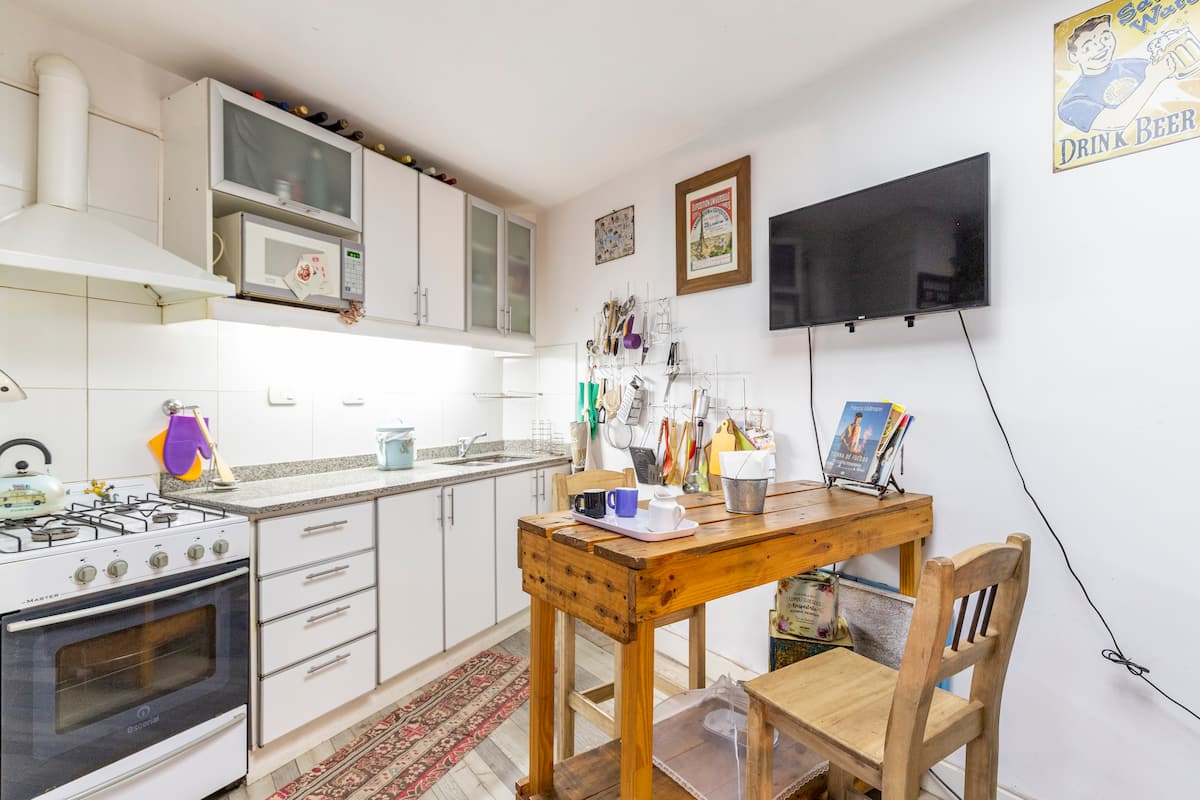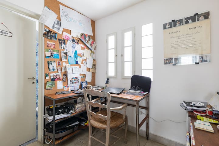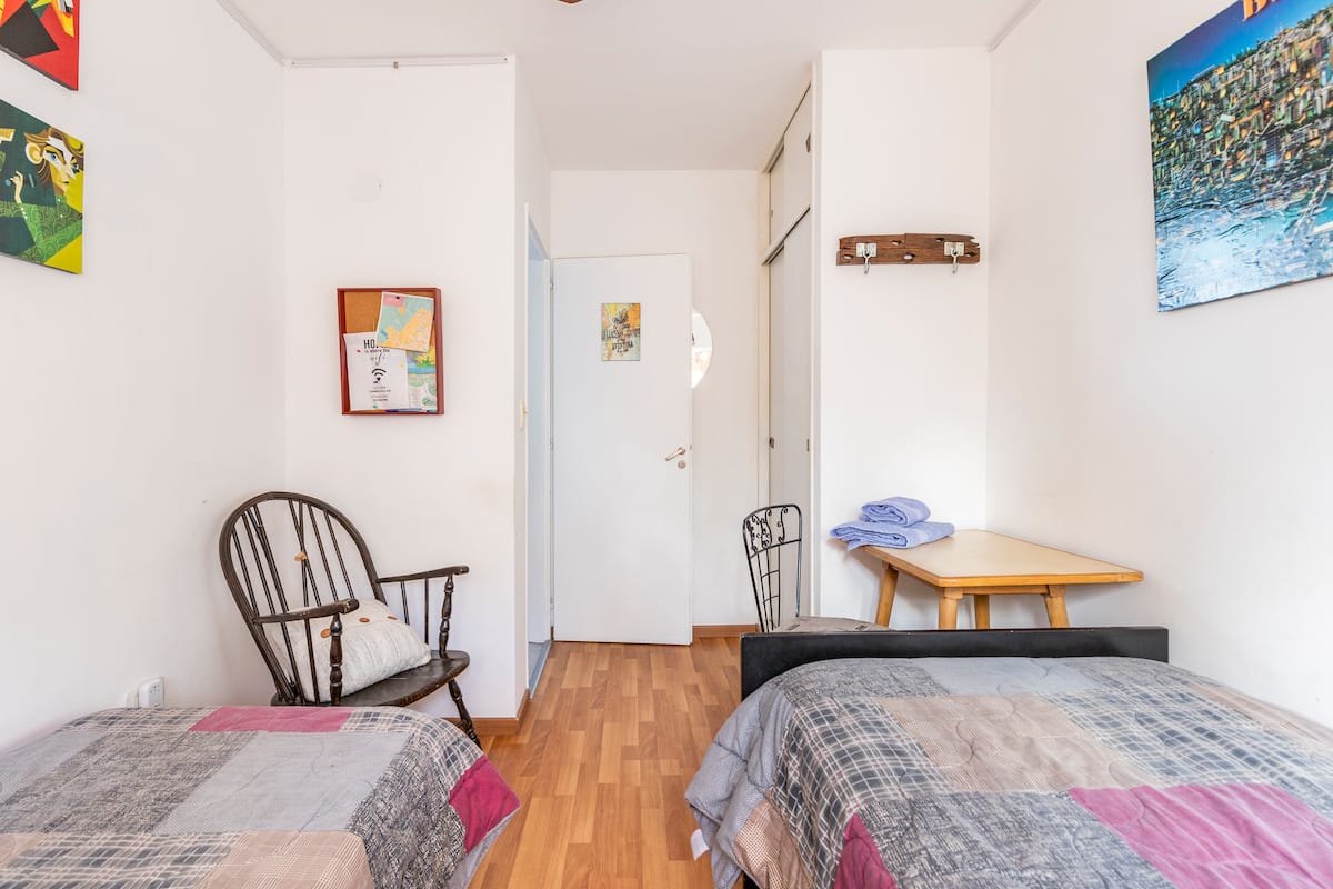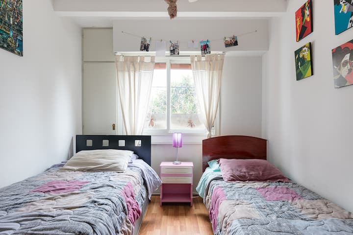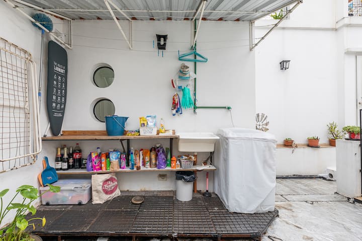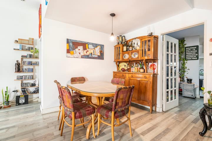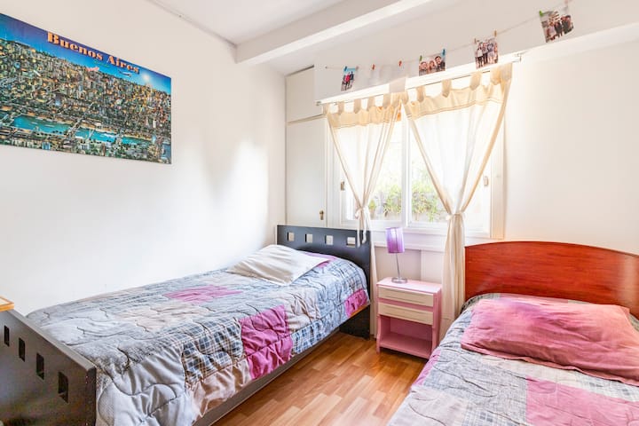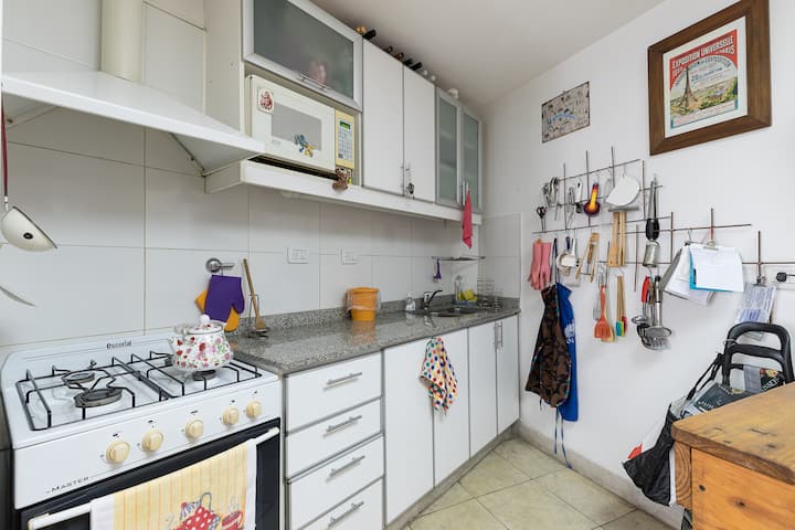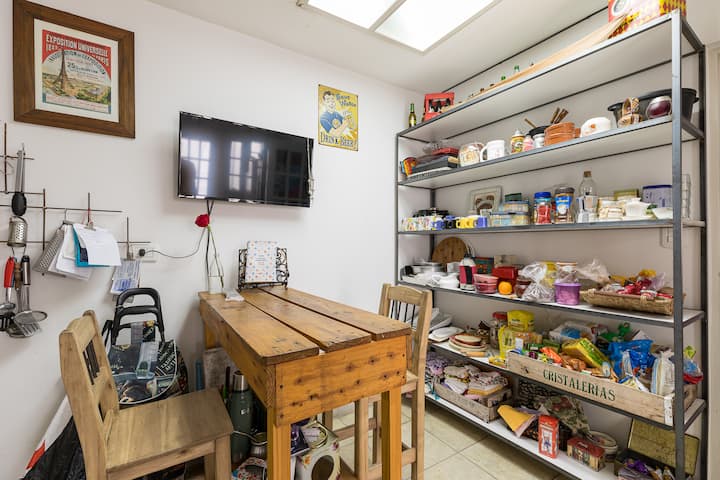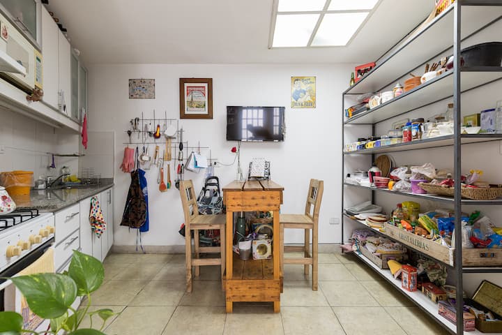 Apartment in Agronomía, with shared use of the kitchen, living room and a terrace. The private room is on the first floor, while the bathroom is on the main floor. The room has a fan and WiFi, and the living room has air conditioning; cable TV is available in the living room with Netflix access. Kitchen and laundry facilities include a washing machine and an ironing board, with a laundry area available. A cleaning service is included every 7 days of stay, and free bikes are available nearby.