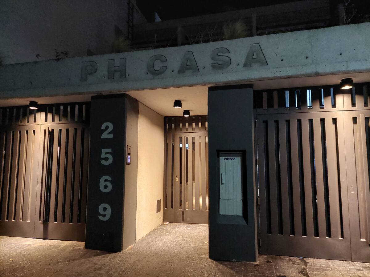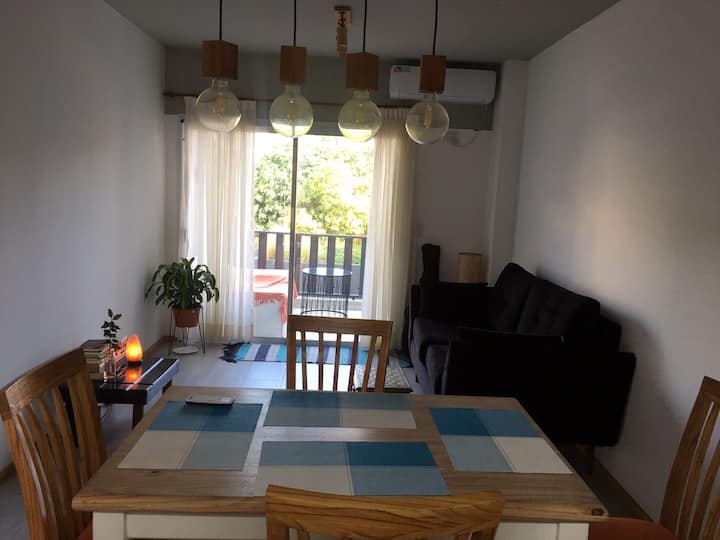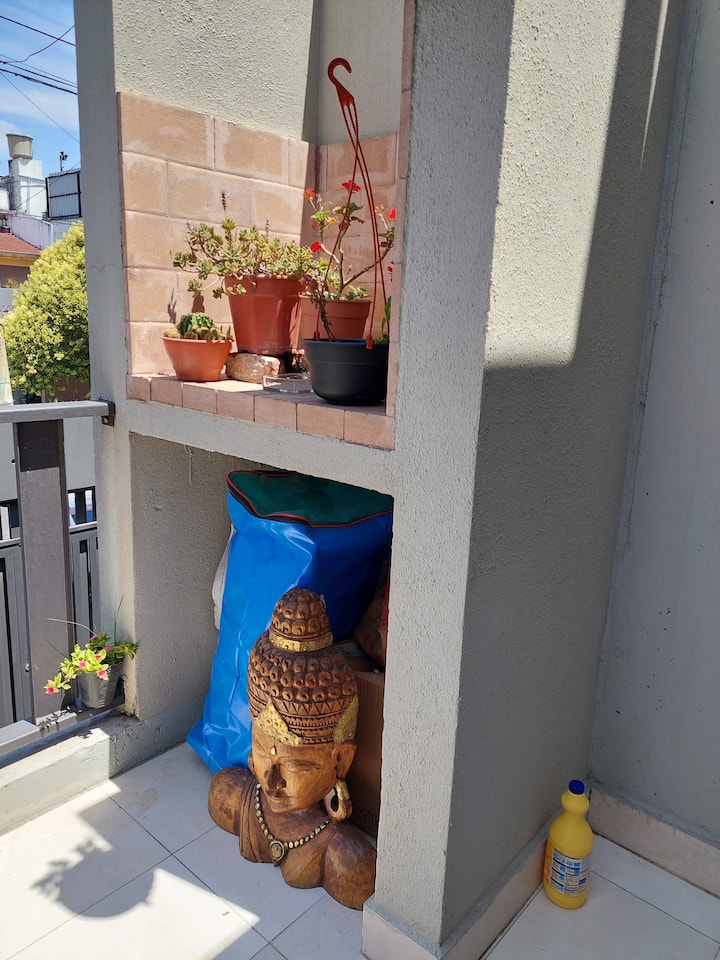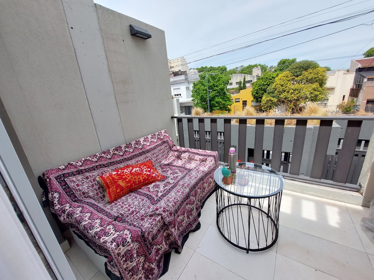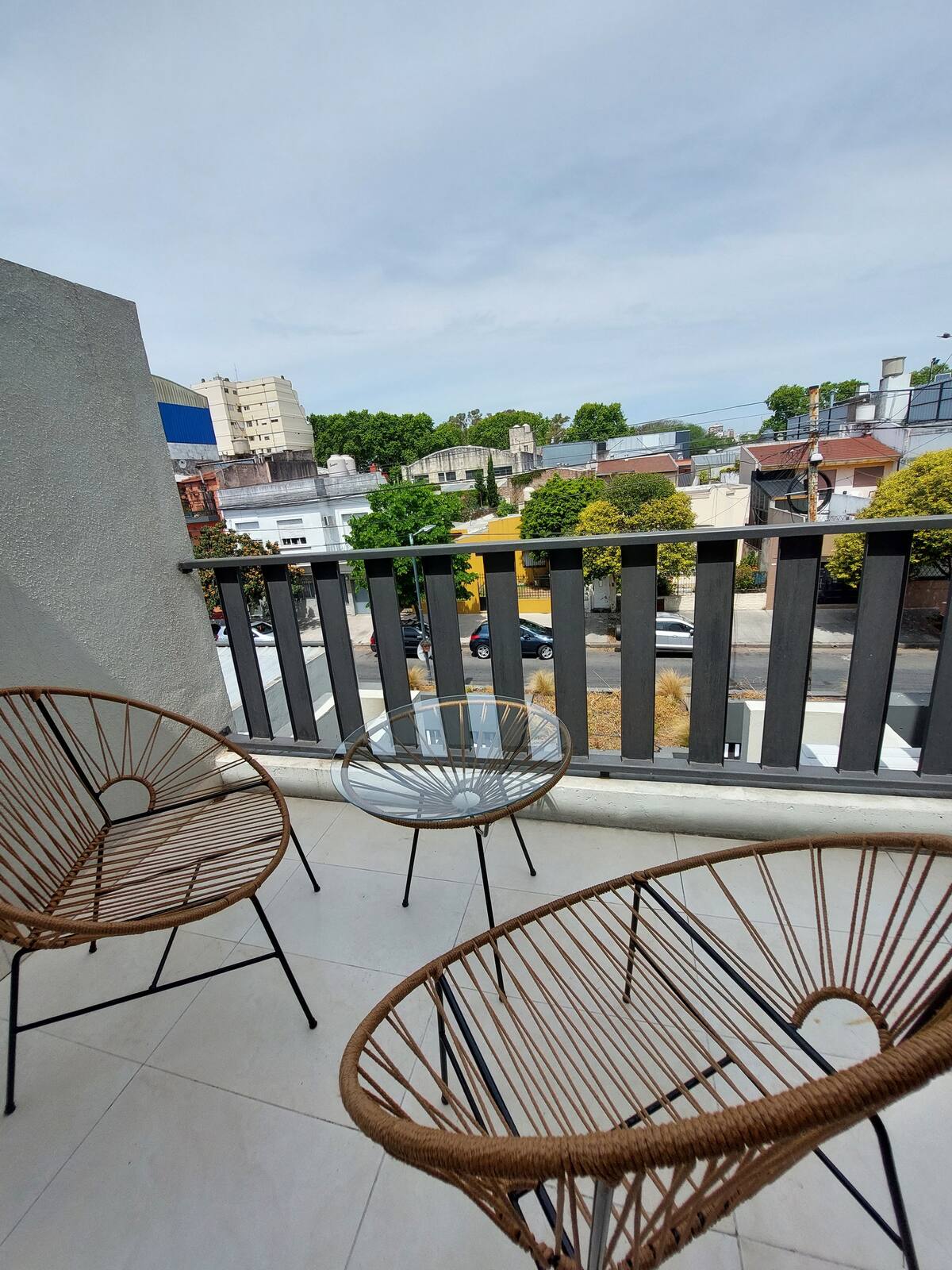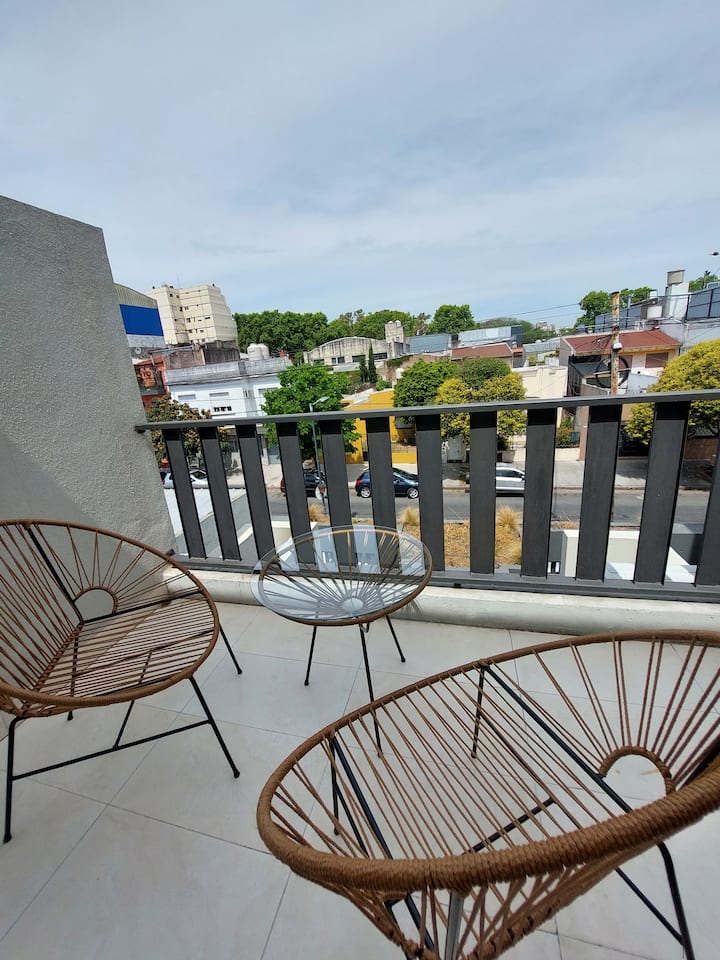 Two-room duplex apartment in Agronomía. It spans two floors and includes a service bathroom, a kitchen/dining area and a living room with sofa, plus a balcony terrace with table and grill. The upper floor has a bedroom with a 2-seater bed, dressing/placard space, a full bathroom with bathtub and a second balcony terrace, with air conditioning/heating on both floors and a portable fan. Parking is available on the street.