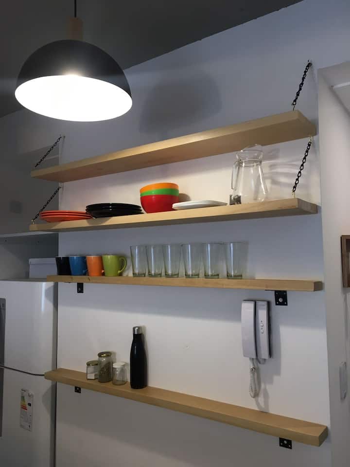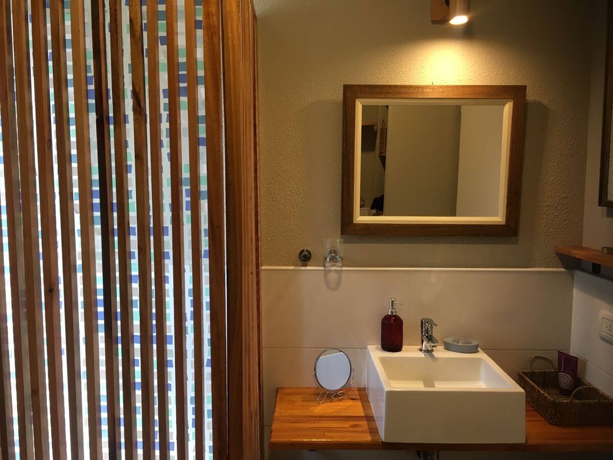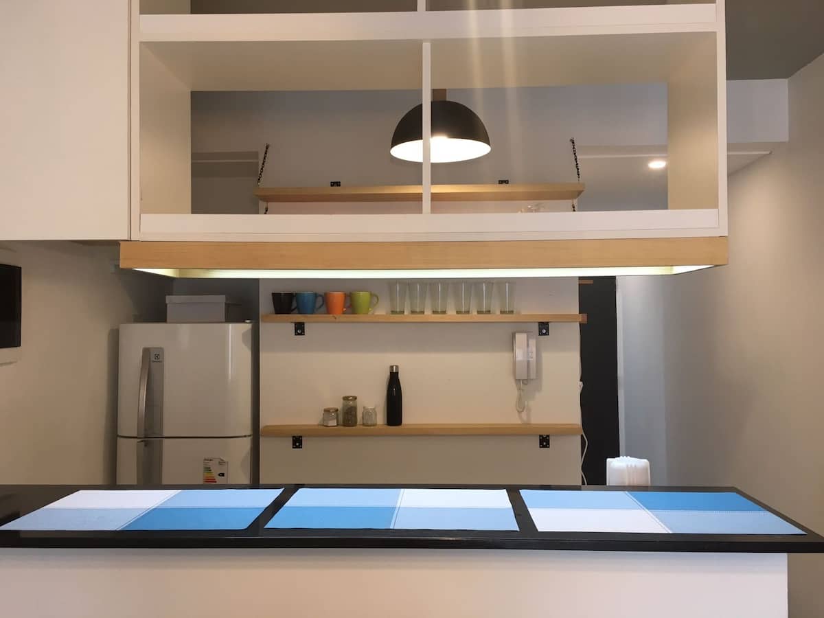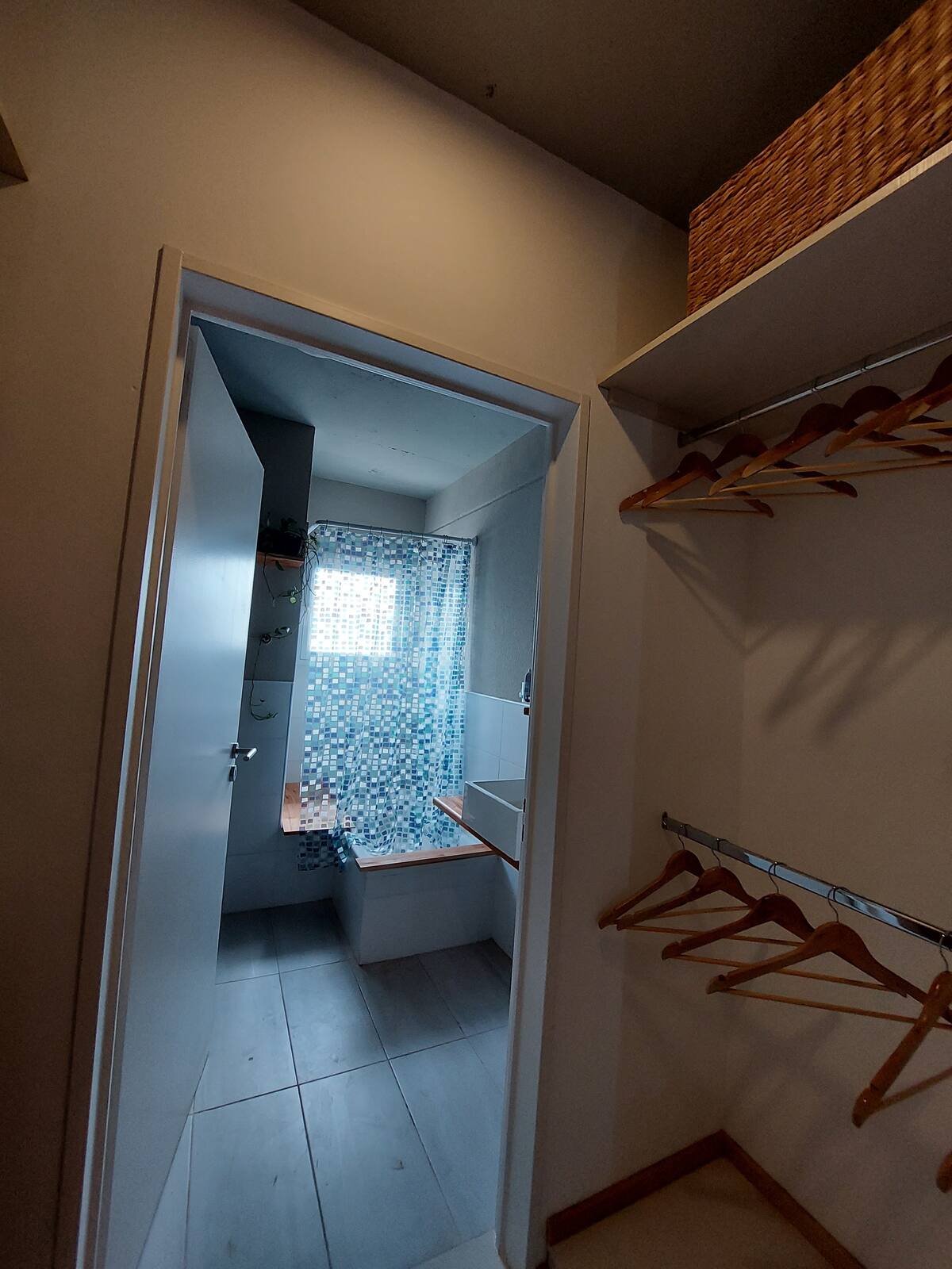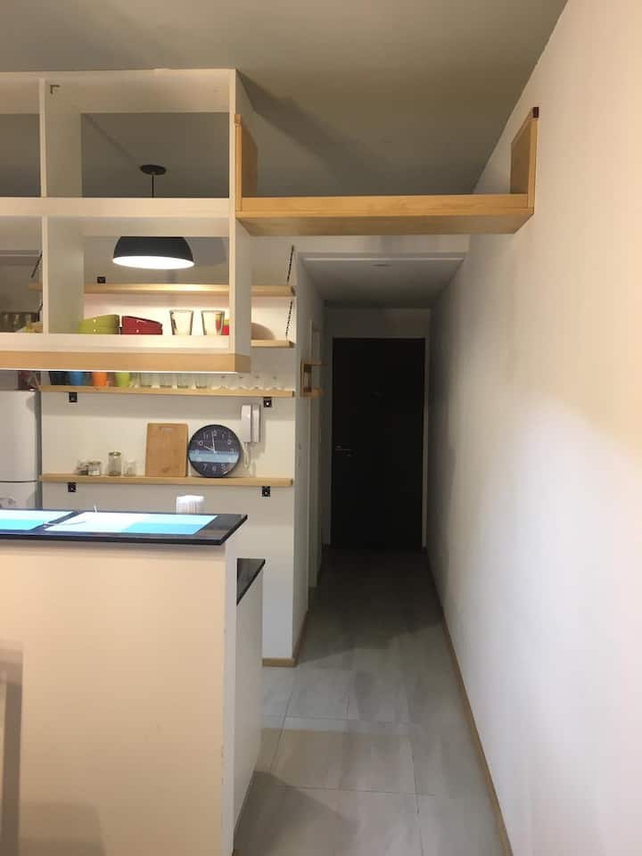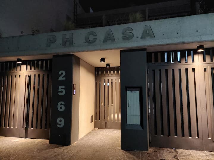 Two-room duplex apartment in Agronomía. It spans two floors and includes a service bathroom, a kitchen/dining area and a living room with sofa, plus a balcony terrace with table and grill. The upper floor has a bedroom with a 2-seater bed, dressing/placard space, a full bathroom with bathtub and a second balcony terrace, with air conditioning/heating on both floors and a portable fan. Parking is available on the street.