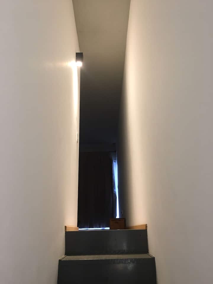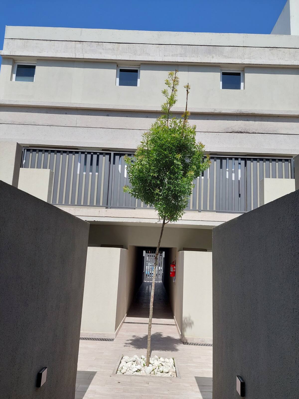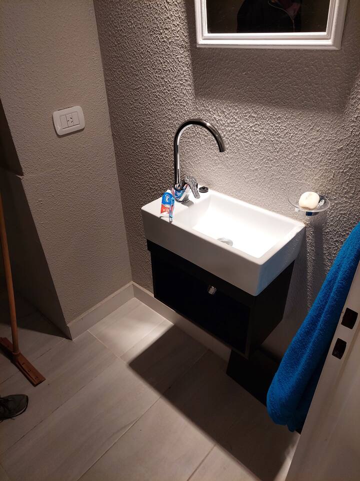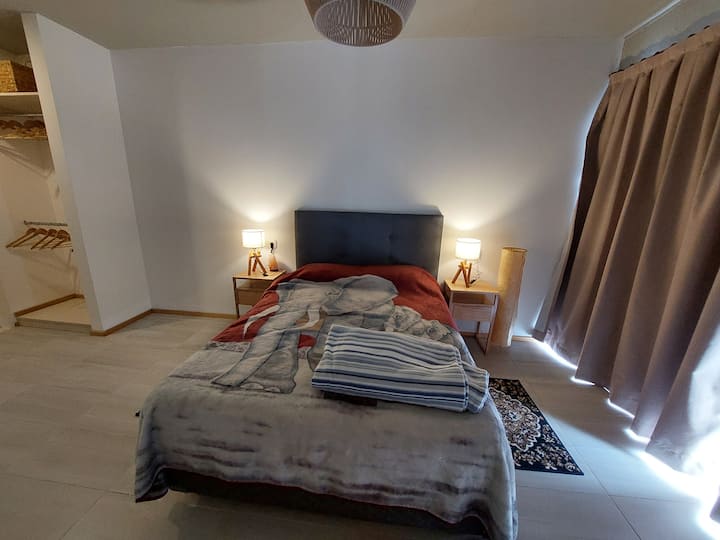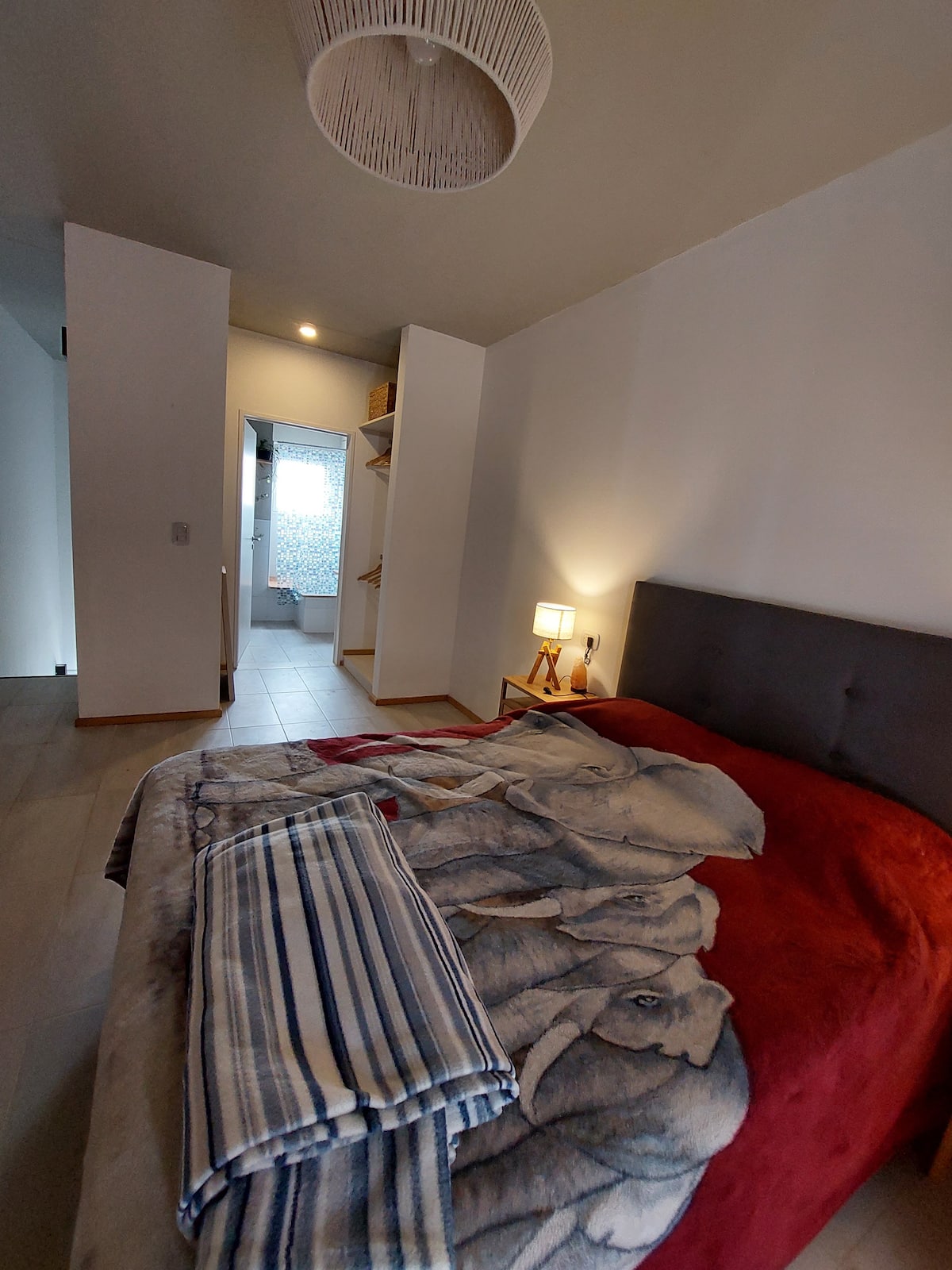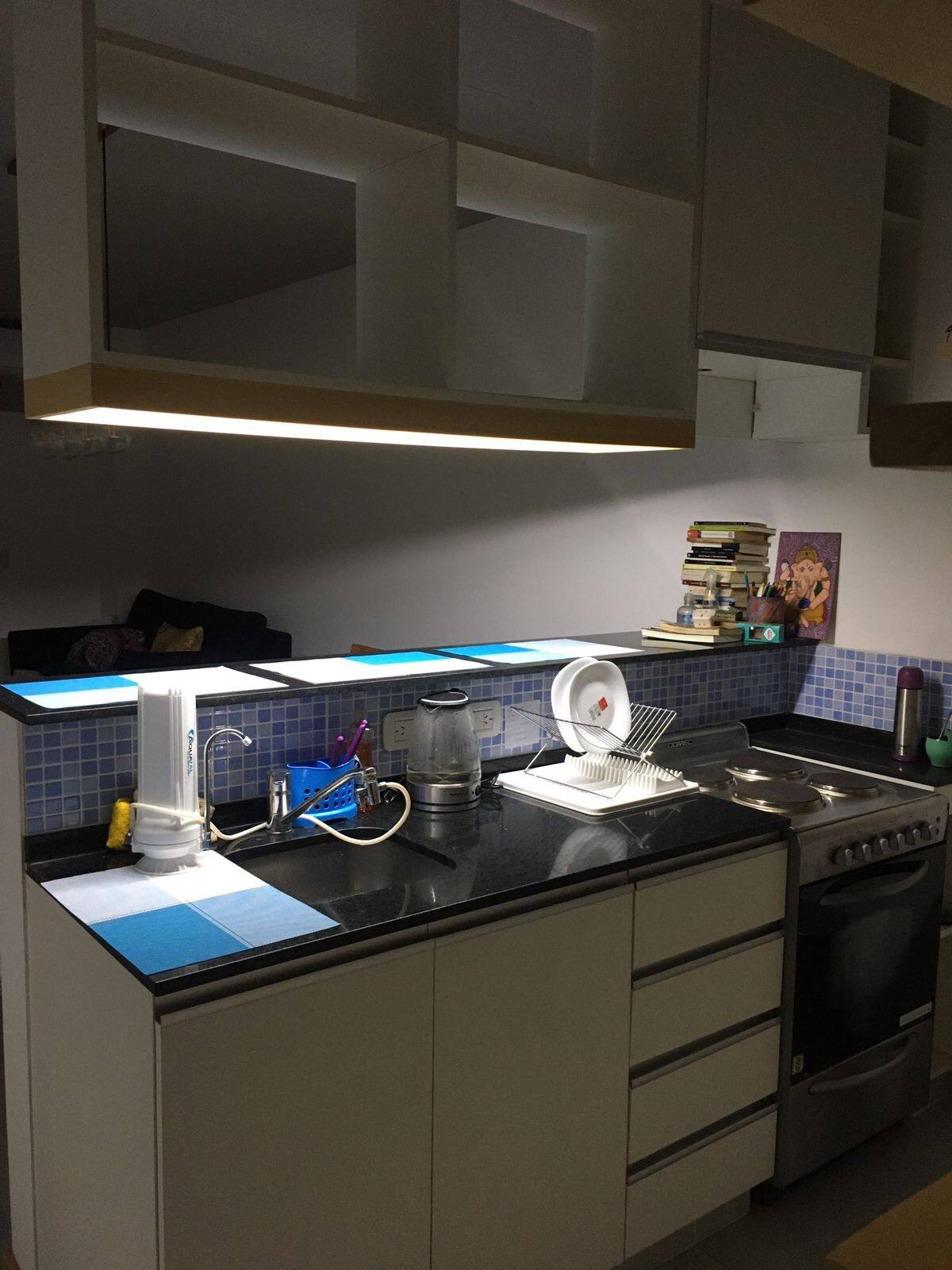 Two-room duplex apartment in Agronomía. It spans two floors and includes a service bathroom, a kitchen/dining area and a living room with sofa, plus a balcony terrace with table and grill. The upper floor has a bedroom with a 2-seater bed, dressing/placard space, a full bathroom with bathtub and a second balcony terrace, with air conditioning/heating on both floors and a portable fan. Parking is available on the street.