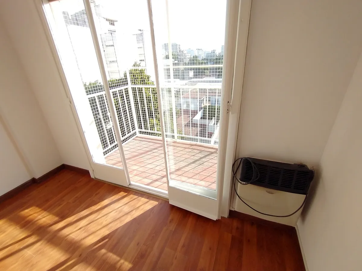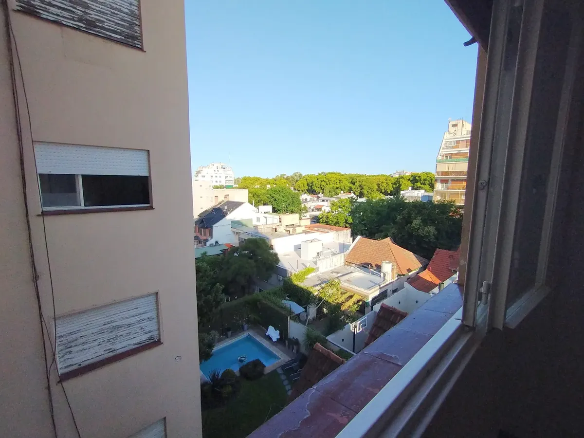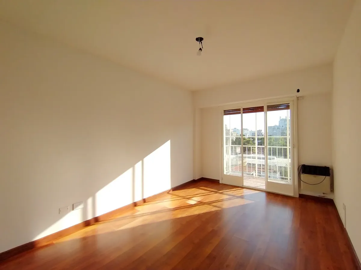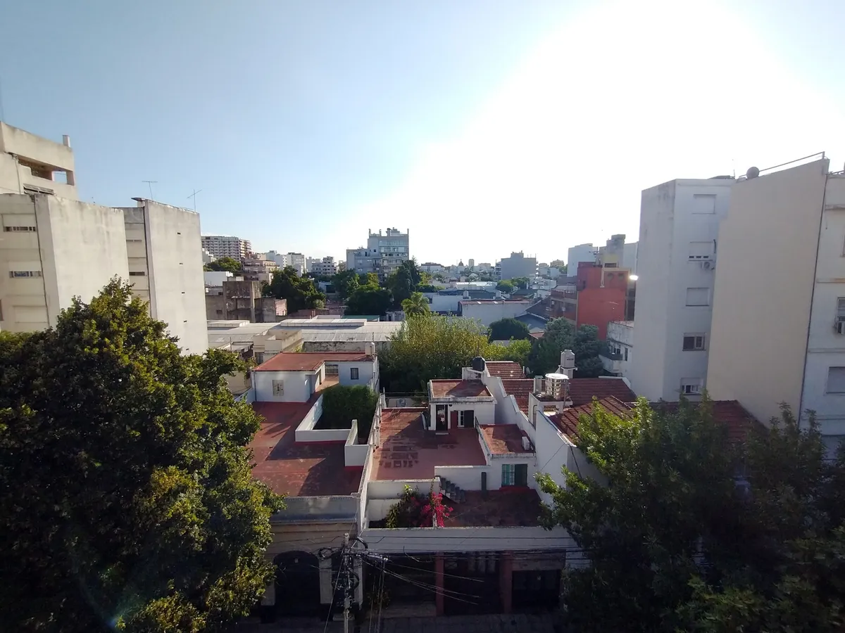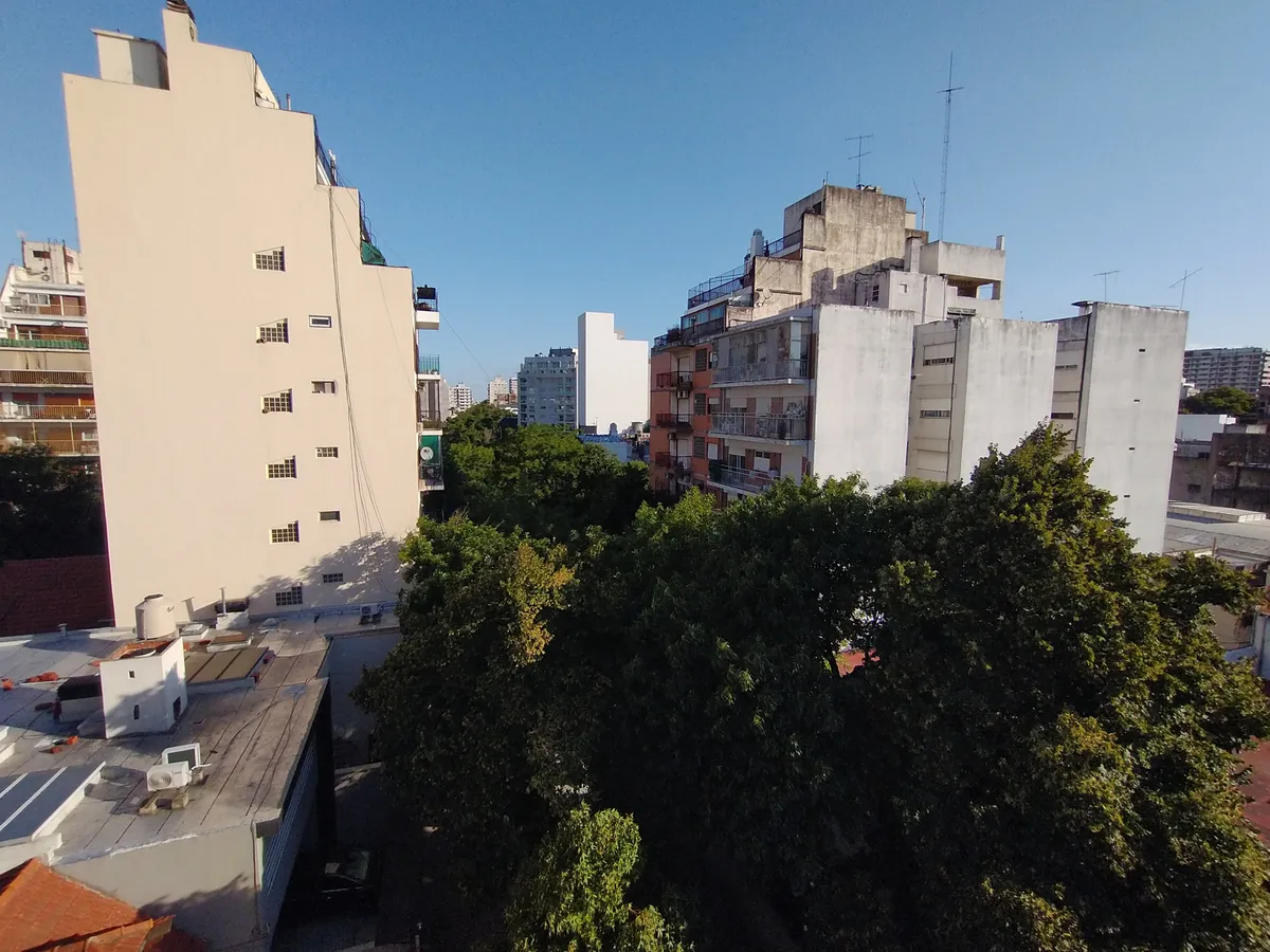 Two-room apartment (1 bedroom) renovated and located on the 5th floor, street-facing with a front balcony and open tree-lined views. The unit has a living-dining room with balcony access, a separate kitchen, and an integrated laundry area with a front window, plus gas cooking (brand-new). Hot water is provided by a calefón; the bathroom has natural ventilation. The bedroom includes a fitted wardrobe; there are new electrical installations, floating laminate floors, and a gas heater with a balanc