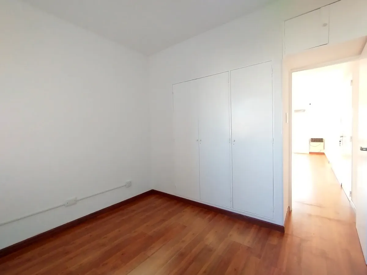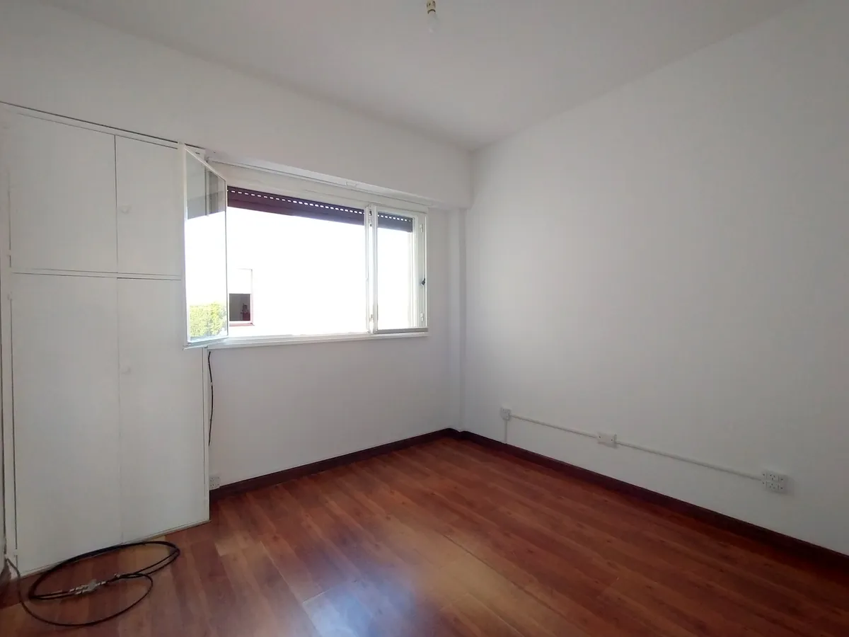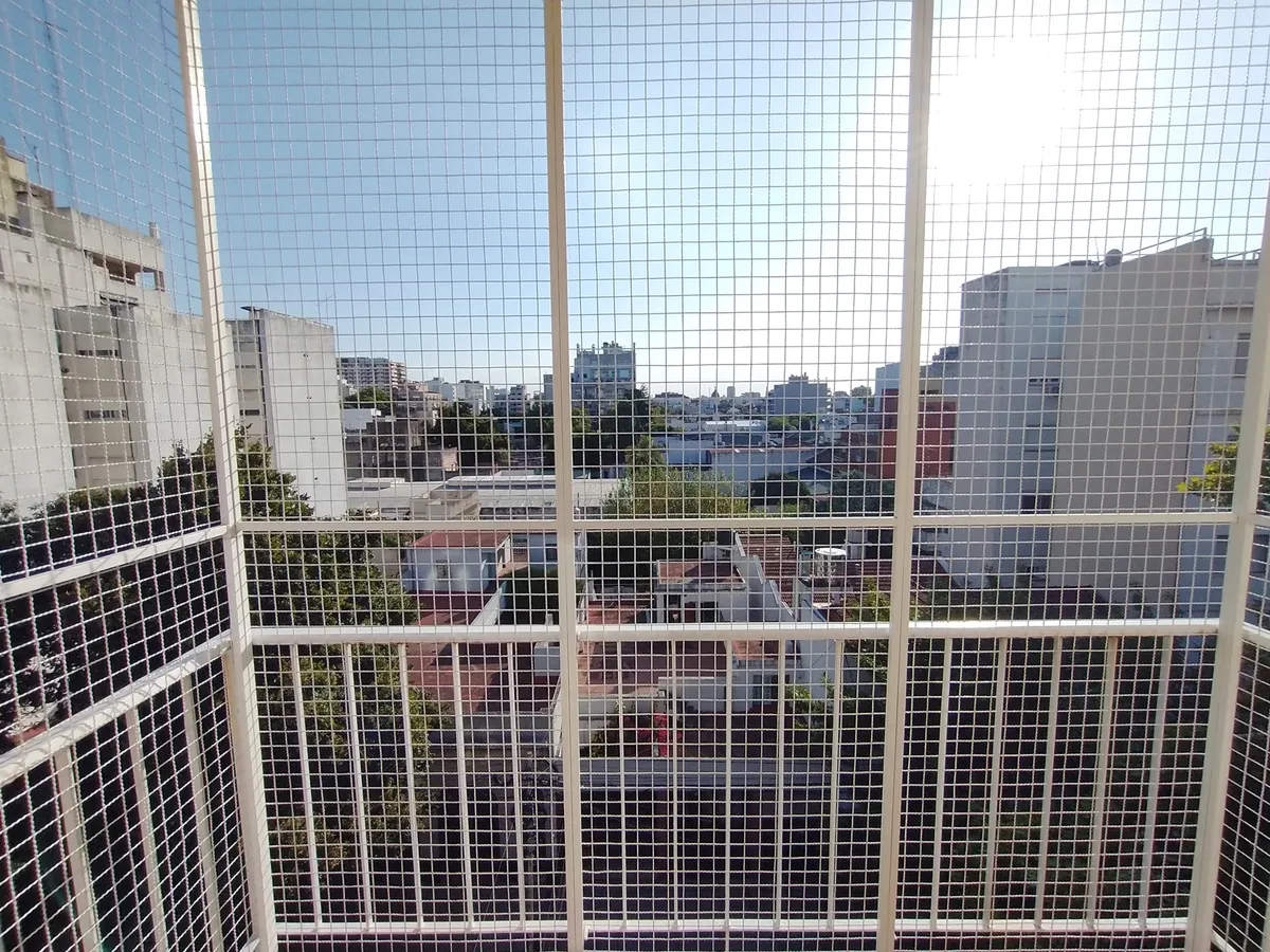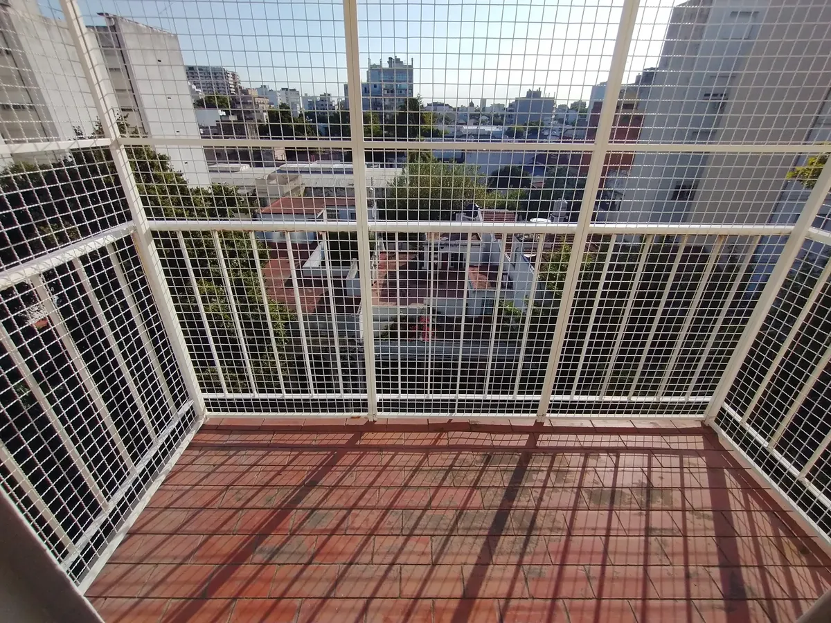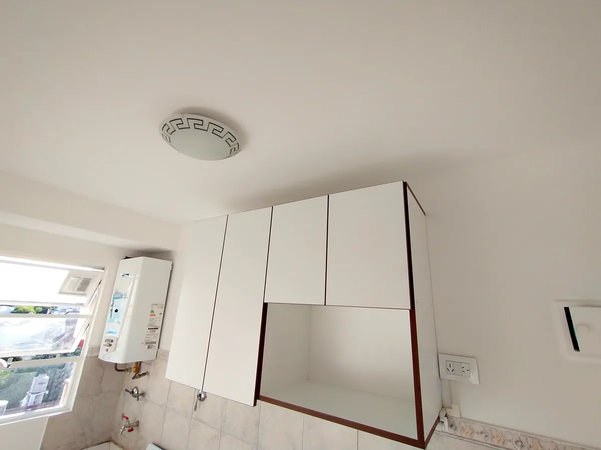 Two-room apartment (1 bedroom) renovated and located on the 5th floor, street-facing with a front balcony and open tree-lined views. The unit has a living-dining room with balcony access, a separate kitchen, and an integrated laundry area with a front window, plus gas cooking (brand-new). Hot water is provided by a calefón; the bathroom has natural ventilation. The bedroom includes a fitted wardrobe; there are new electrical installations, floating laminate floors, and a gas heater with a balanc