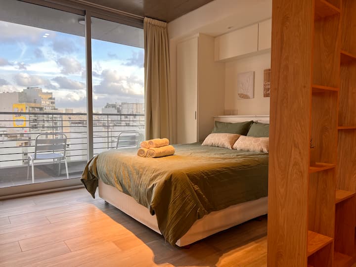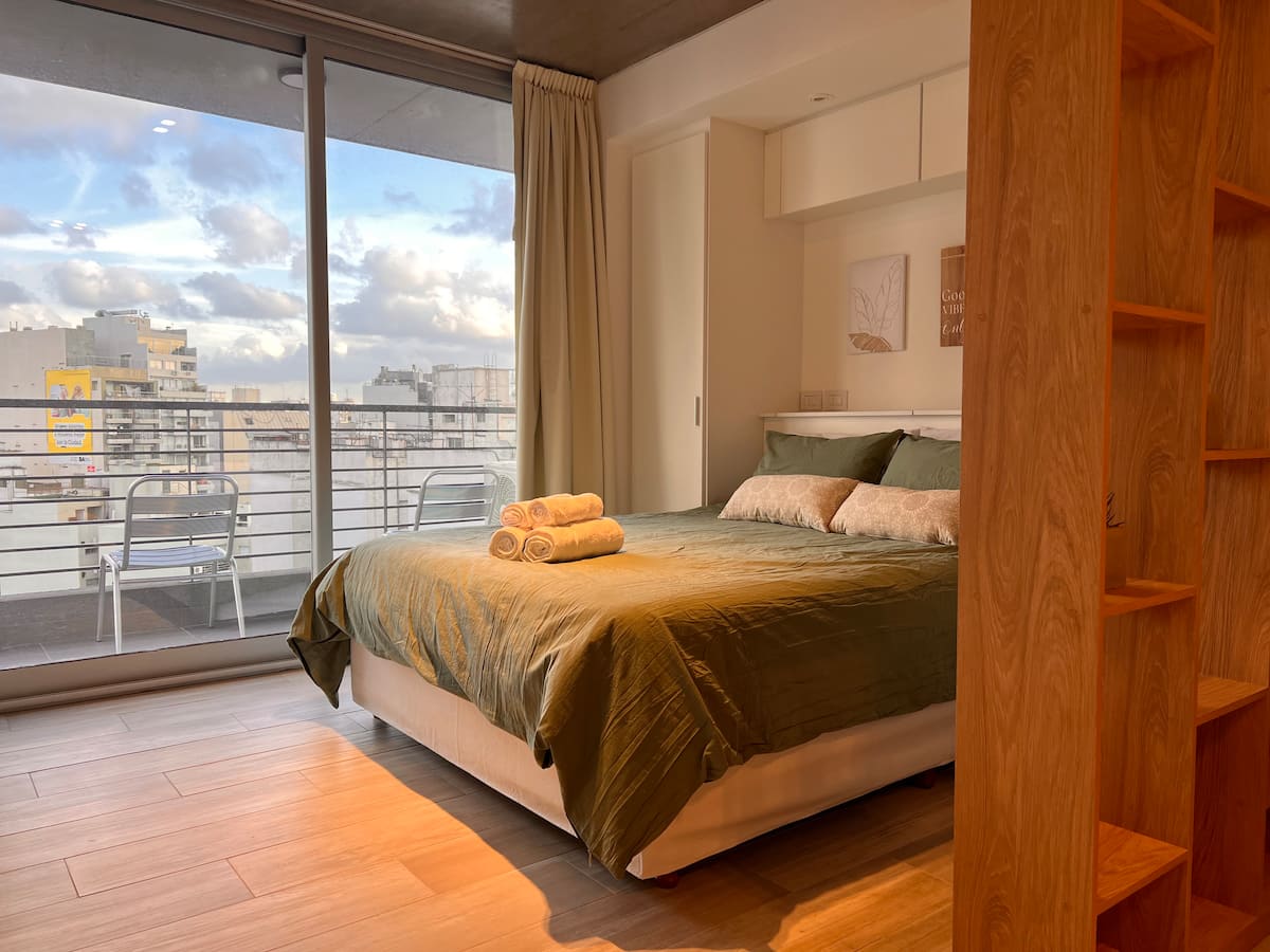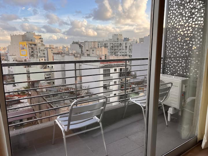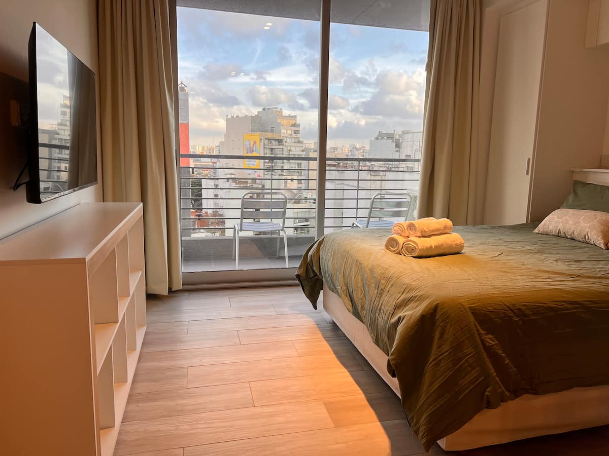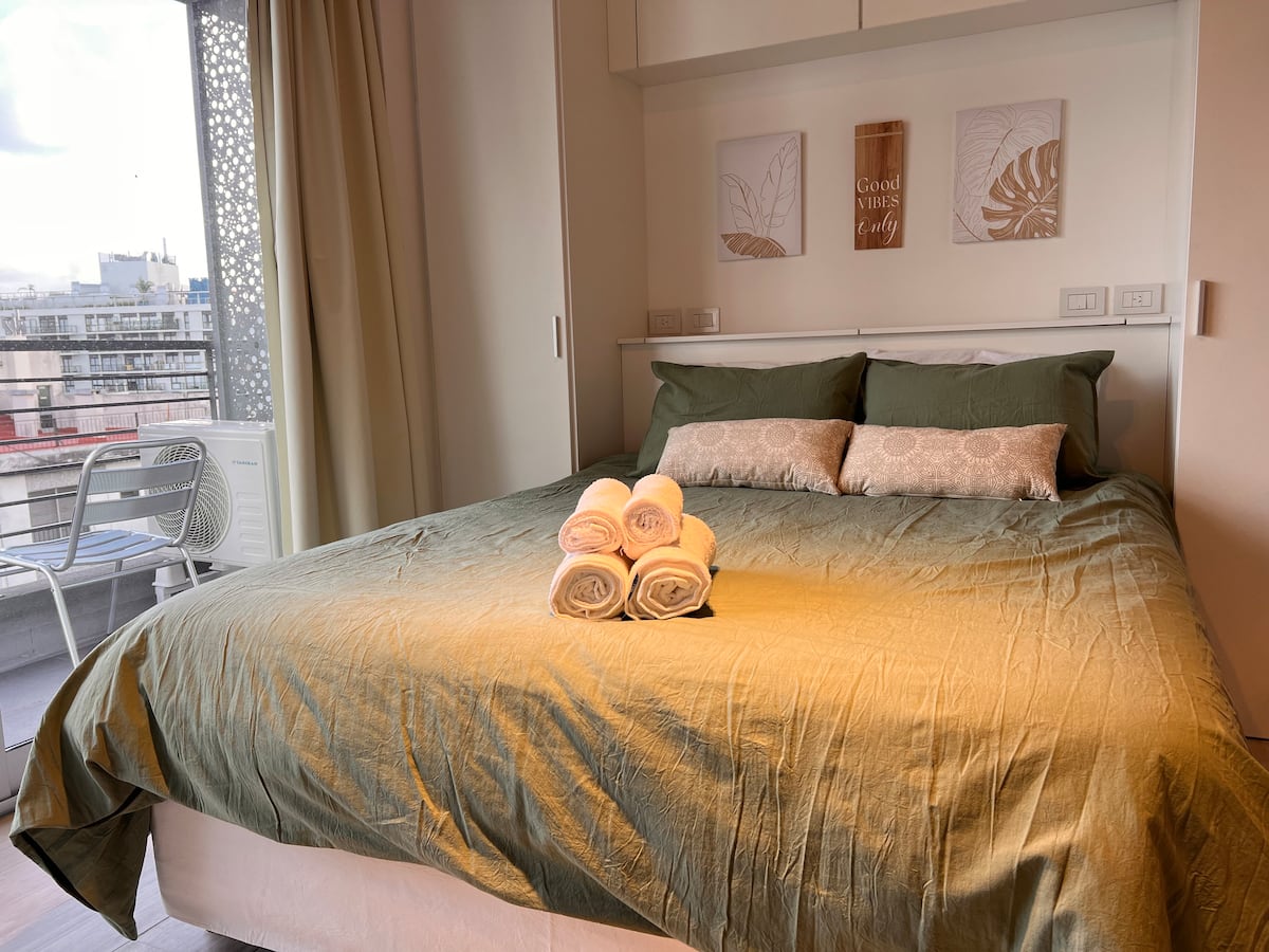 Furnished studio apartment on the 9th floor of a modern building in Almagro, with a balcony. Sleeping arrangements include a queen bed and a sofa that converts into a 1.8-metre-long twin bed, plus a fold-out bed that provides another 1.8-metre-long sleeping surface. The listing mentions a high-definition TV, fast WiFi, and accommodation for up to four people.