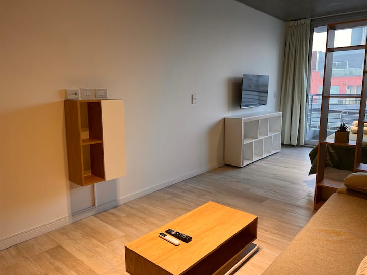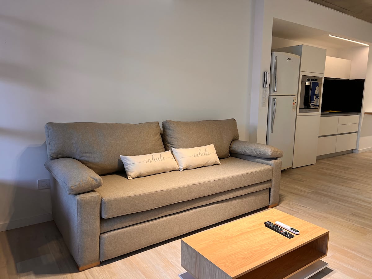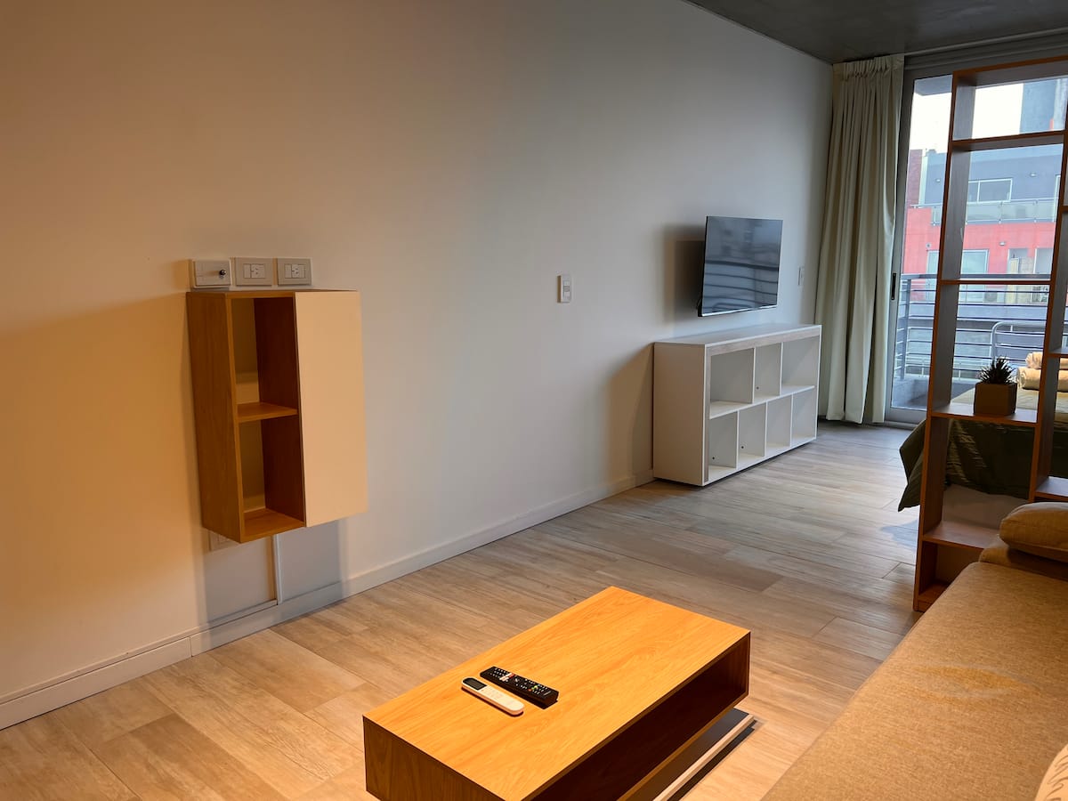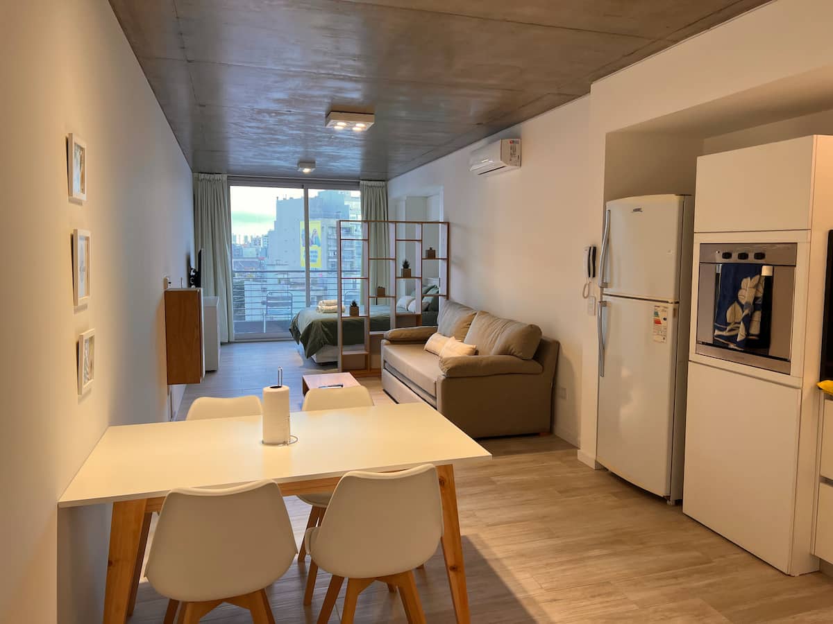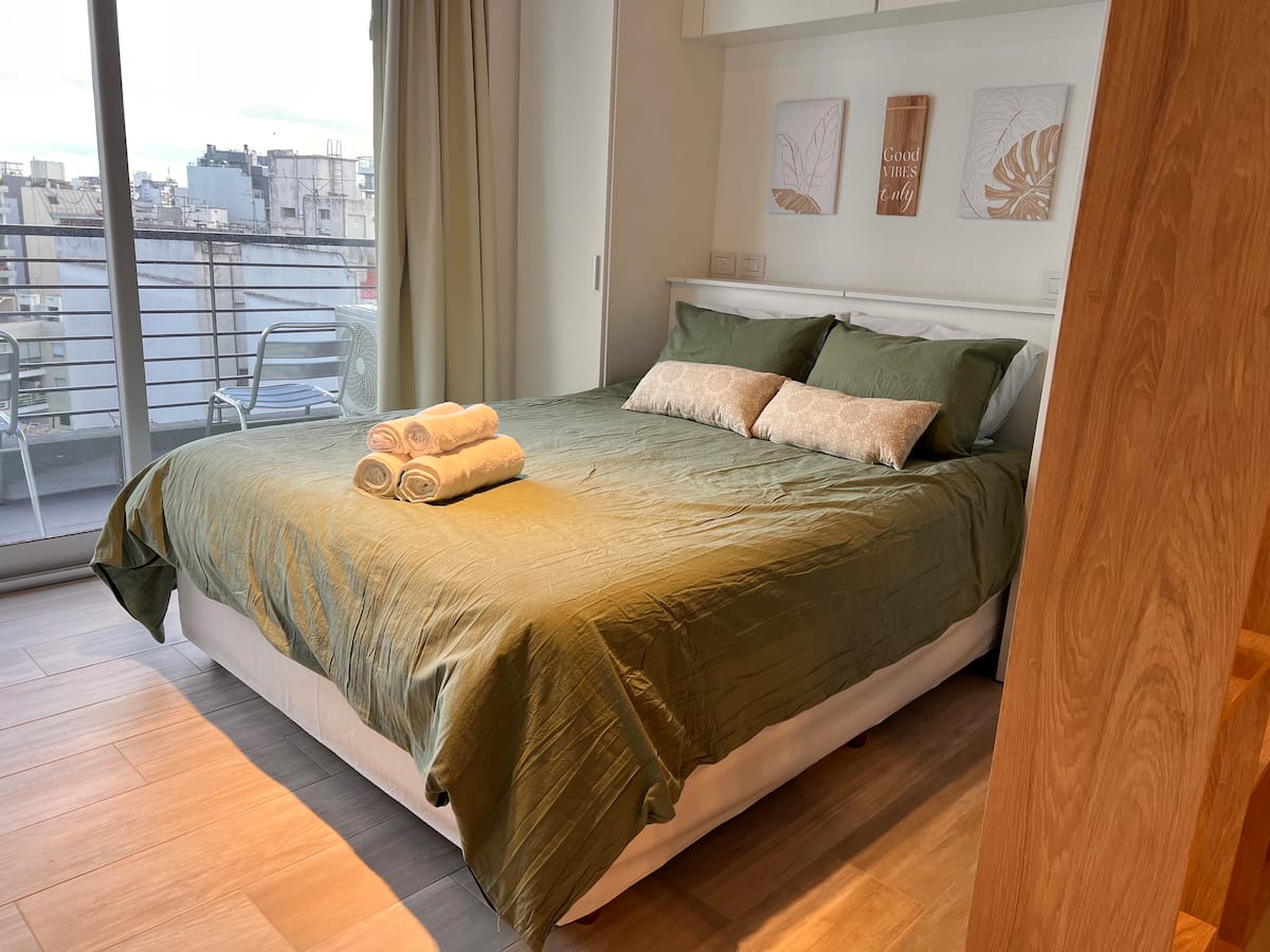 Furnished studio apartment on the 9th floor of a modern building in Almagro, with a balcony. Sleeping arrangements include a queen bed and a sofa that converts into a 1.8-metre-long twin bed, plus a fold-out bed that provides another 1.8-metre-long sleeping surface. The listing mentions a high-definition TV, fast WiFi, and accommodation for up to four people.