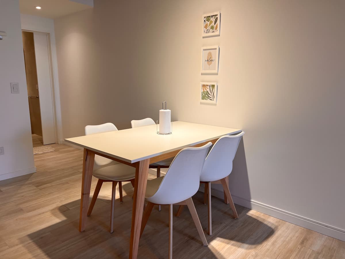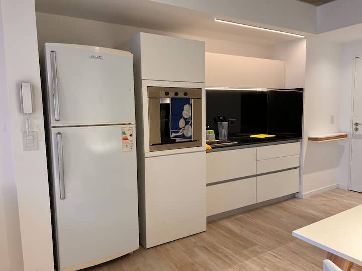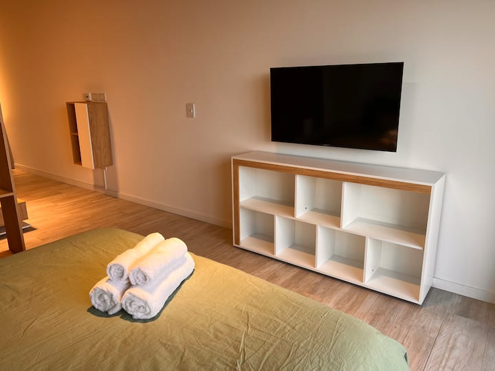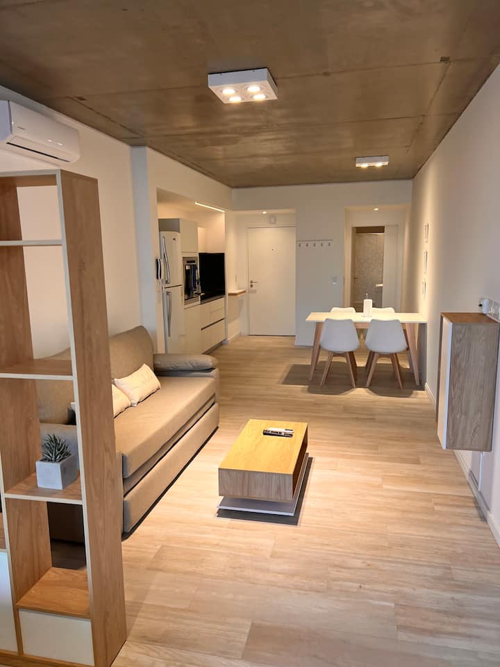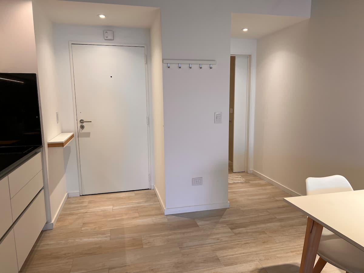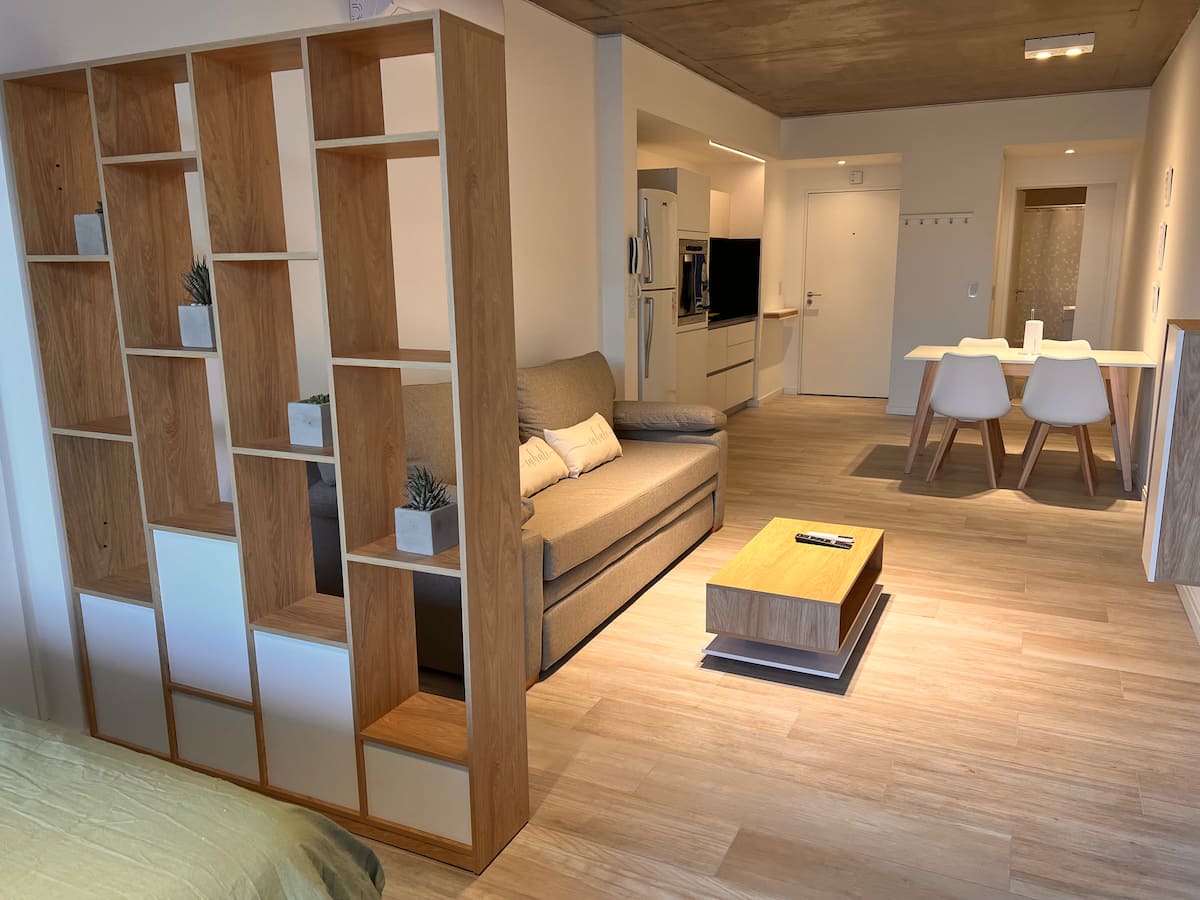 Furnished studio apartment on the 9th floor of a modern building in Almagro, with a balcony. Sleeping arrangements include a queen bed and a sofa that converts into a 1.8-metre-long twin bed, plus a fold-out bed that provides another 1.8-metre-long sleeping surface. The listing mentions a high-definition TV, fast WiFi, and accommodation for up to four people.