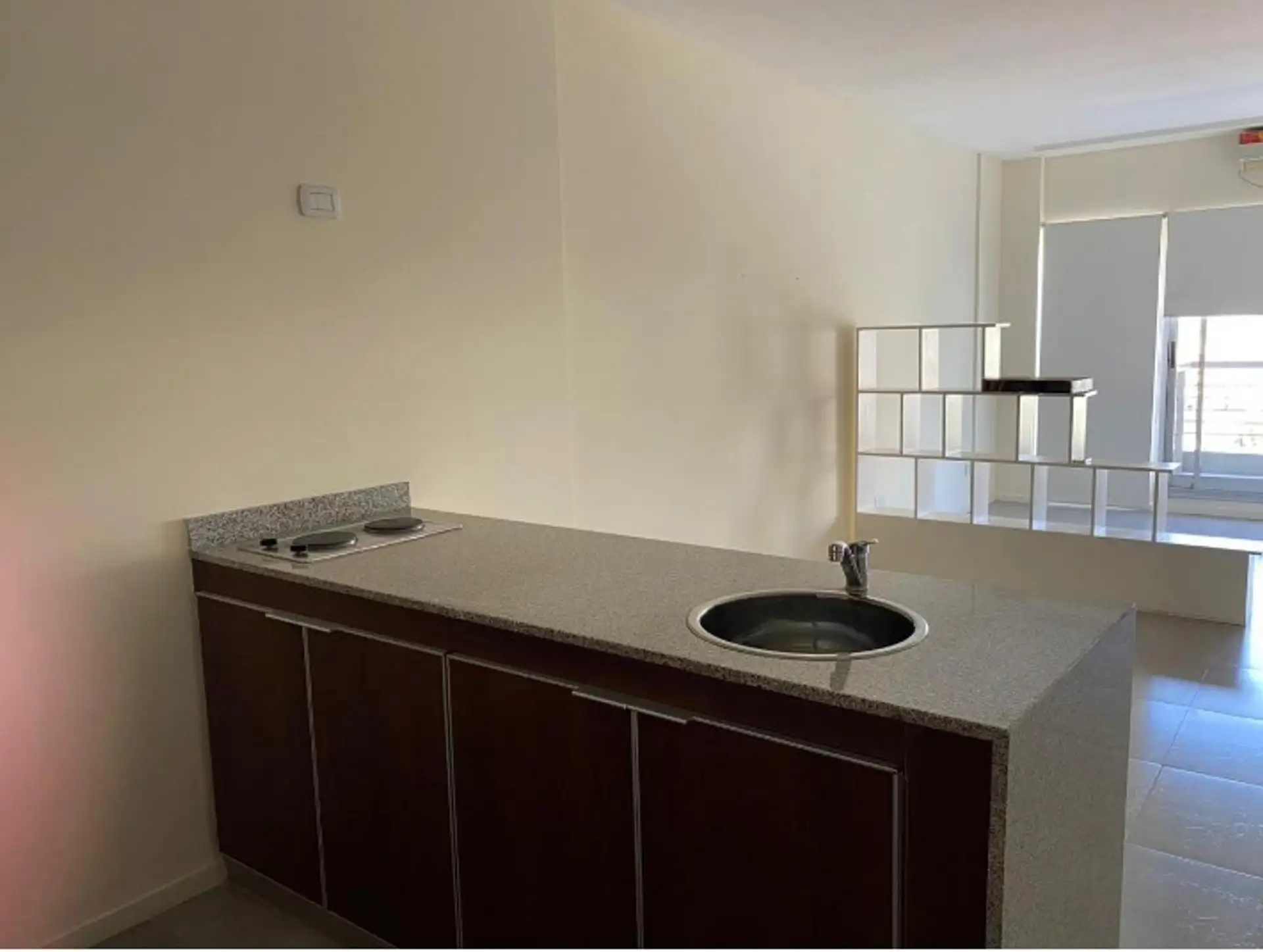 Studio apartment of 40 m² in Almagro. The integrated kitchen has an electric cooktop and space planned for a washing machine. There is a full bathroom with a bathtub, and the main room has a divider that separates sleeping and living areas, with access to a balcony. The apartment has cold/hot air conditioning and the building has a pool. Services: sewer drainage (Cloacas). Building pool access starts in early April.