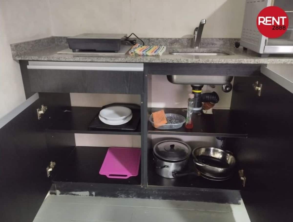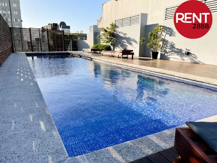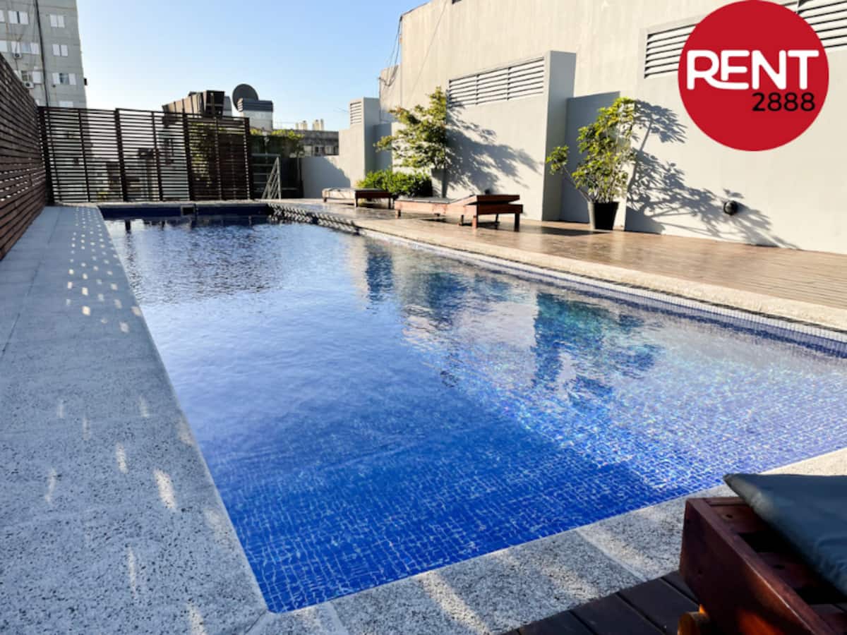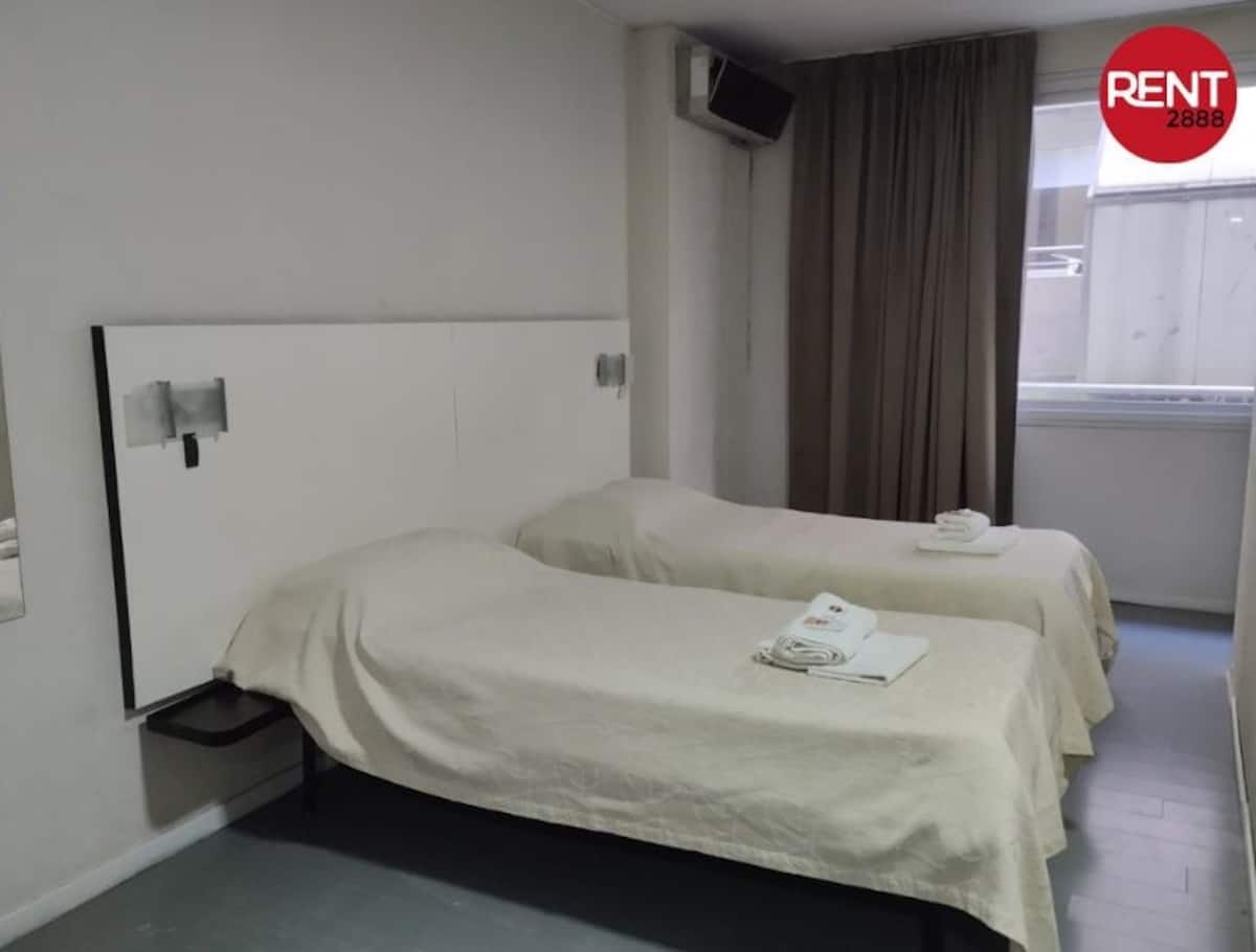 One-room apartment with two single beds, full kitchen, private bathroom and a small internal balcony, in a building opposite Hospital Italiano. The building has 24-hour security, a pool, gym and sauna, plus WiFi and Smart TV; air conditioning provides cooling and heating. Pool and gym access runs from 9am to 9pm, with the pool closed on Mondays for maintenance, and guests can use the laundry room on the 7th floor by purchasing a chip at the front desk.