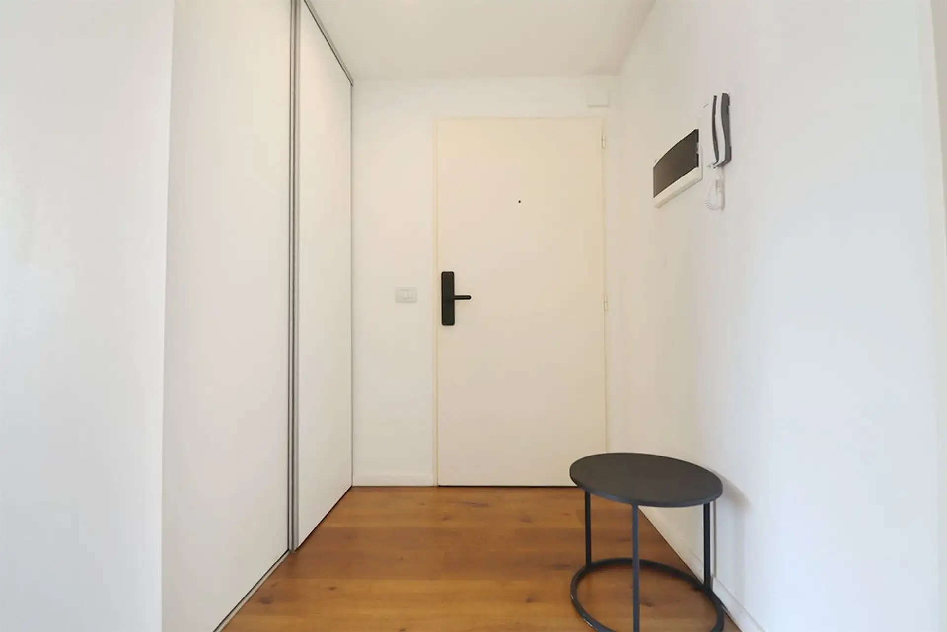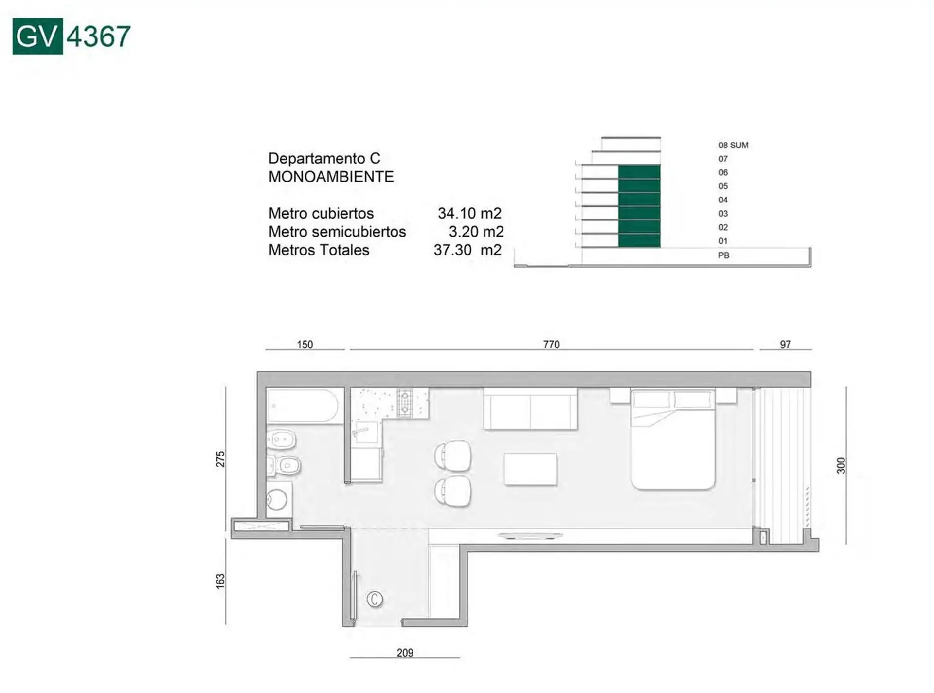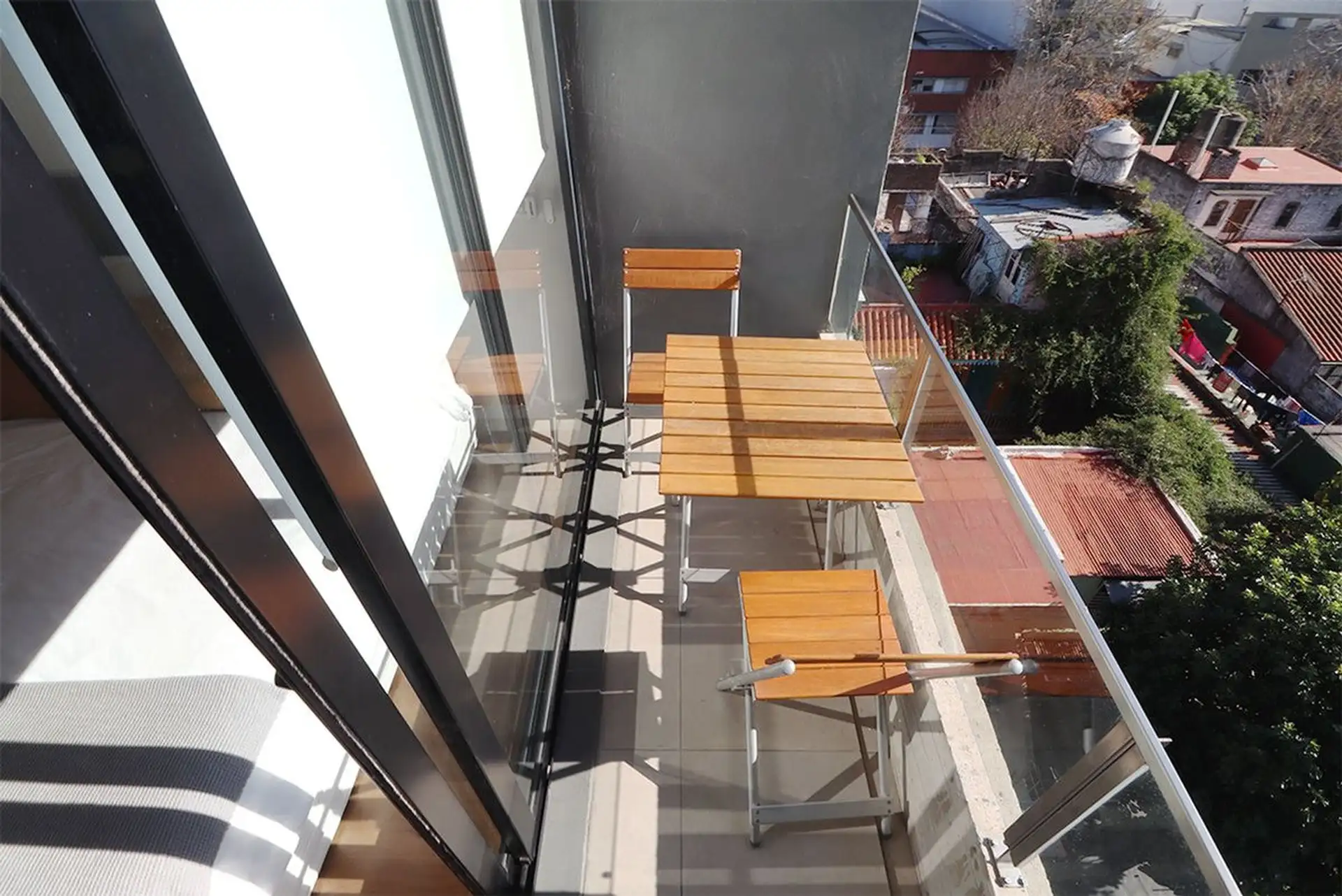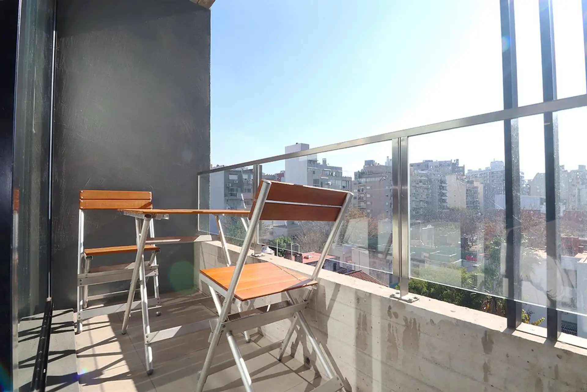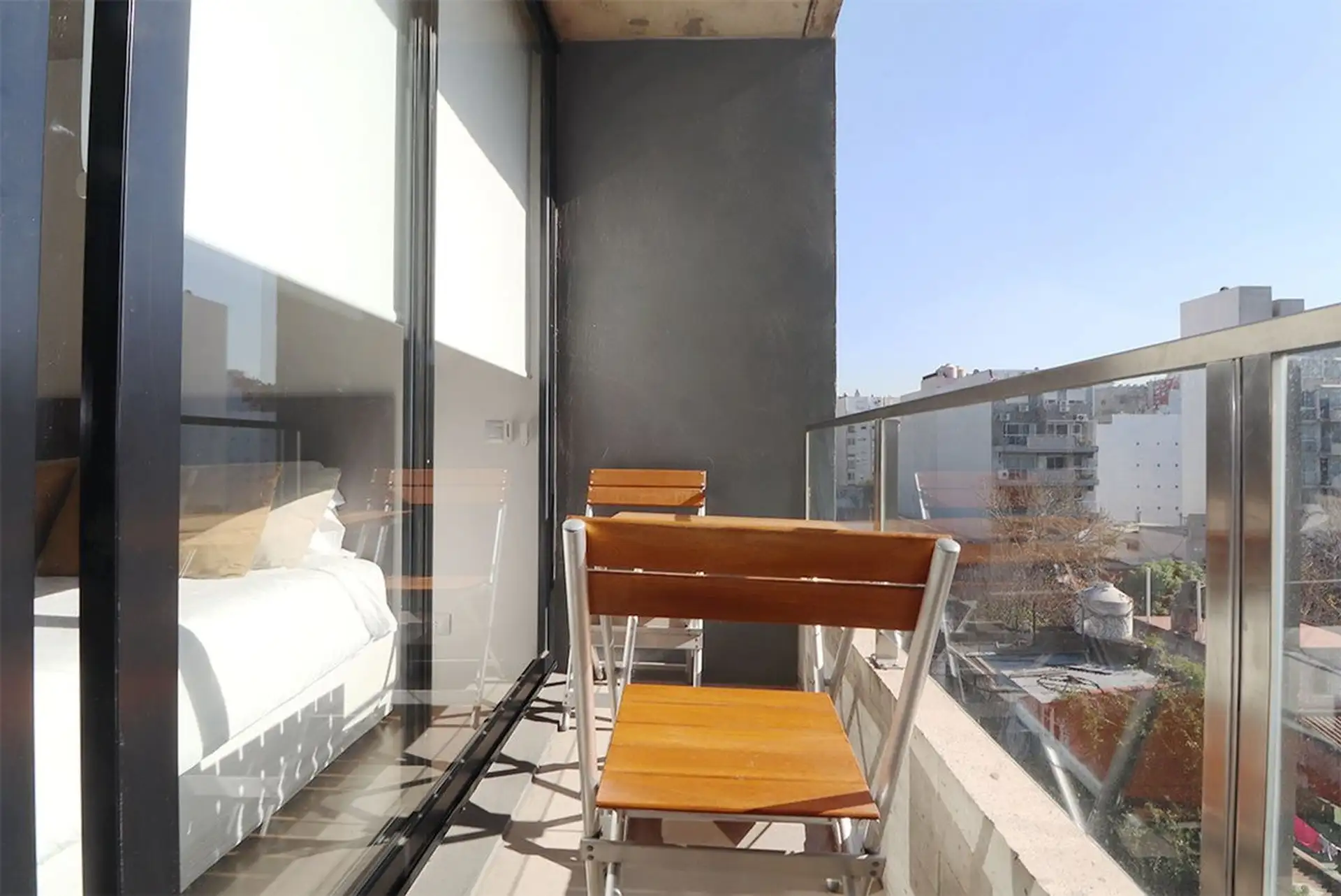 Furnished studio apartment in Almagro on the 5th floor, courtyard-facing with an open view and a balcony. Integrated kitchen with base cabinets and a cooktop, plus a full bathroom. The unit has a closet and heating/cooling air conditioning, with smart lock access; the building has a pool.