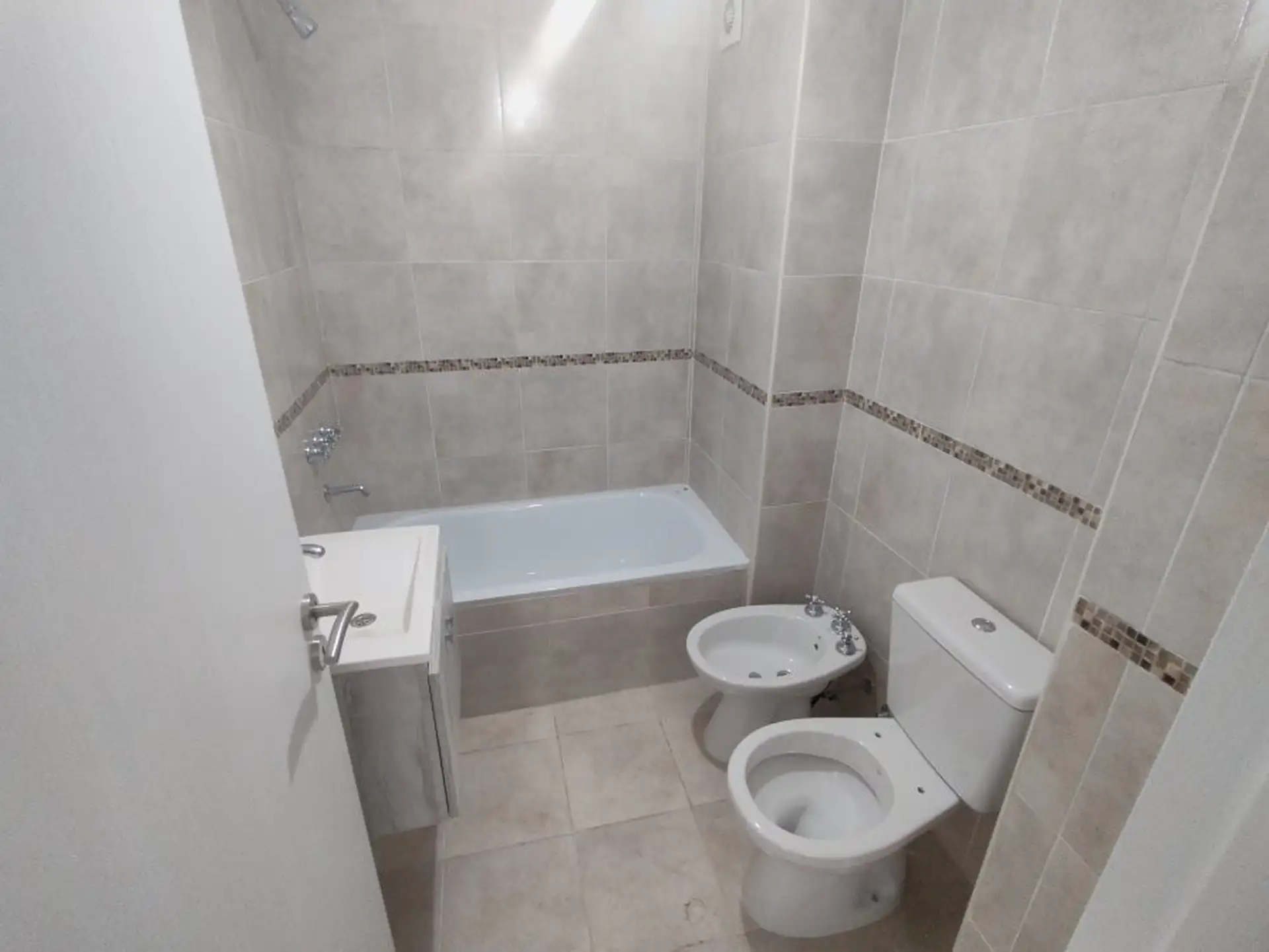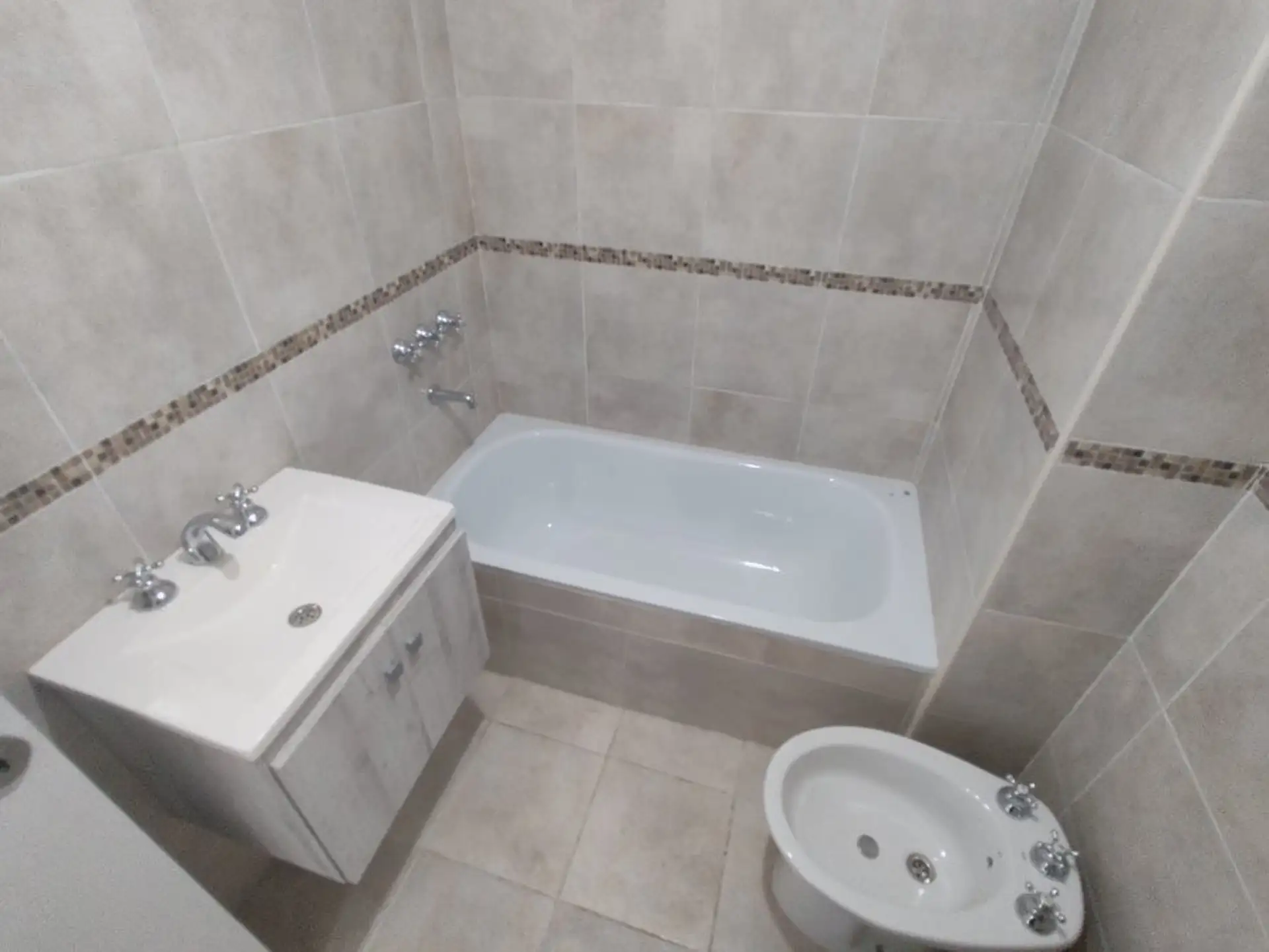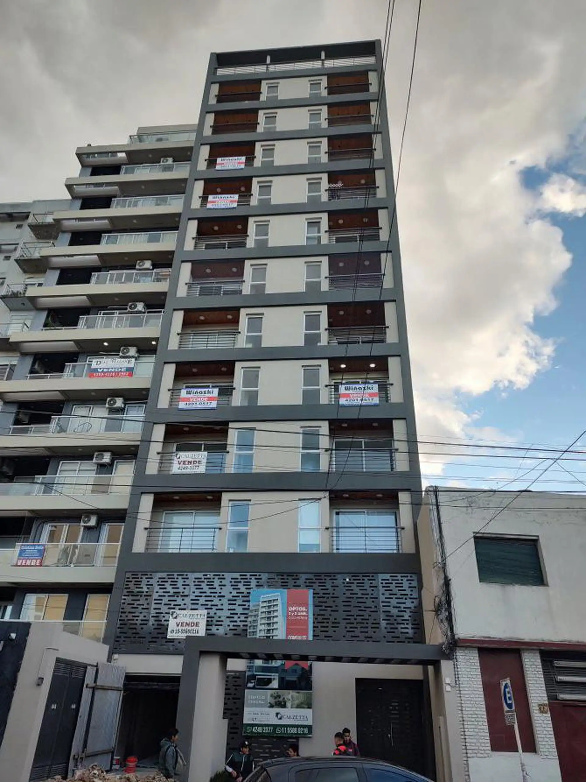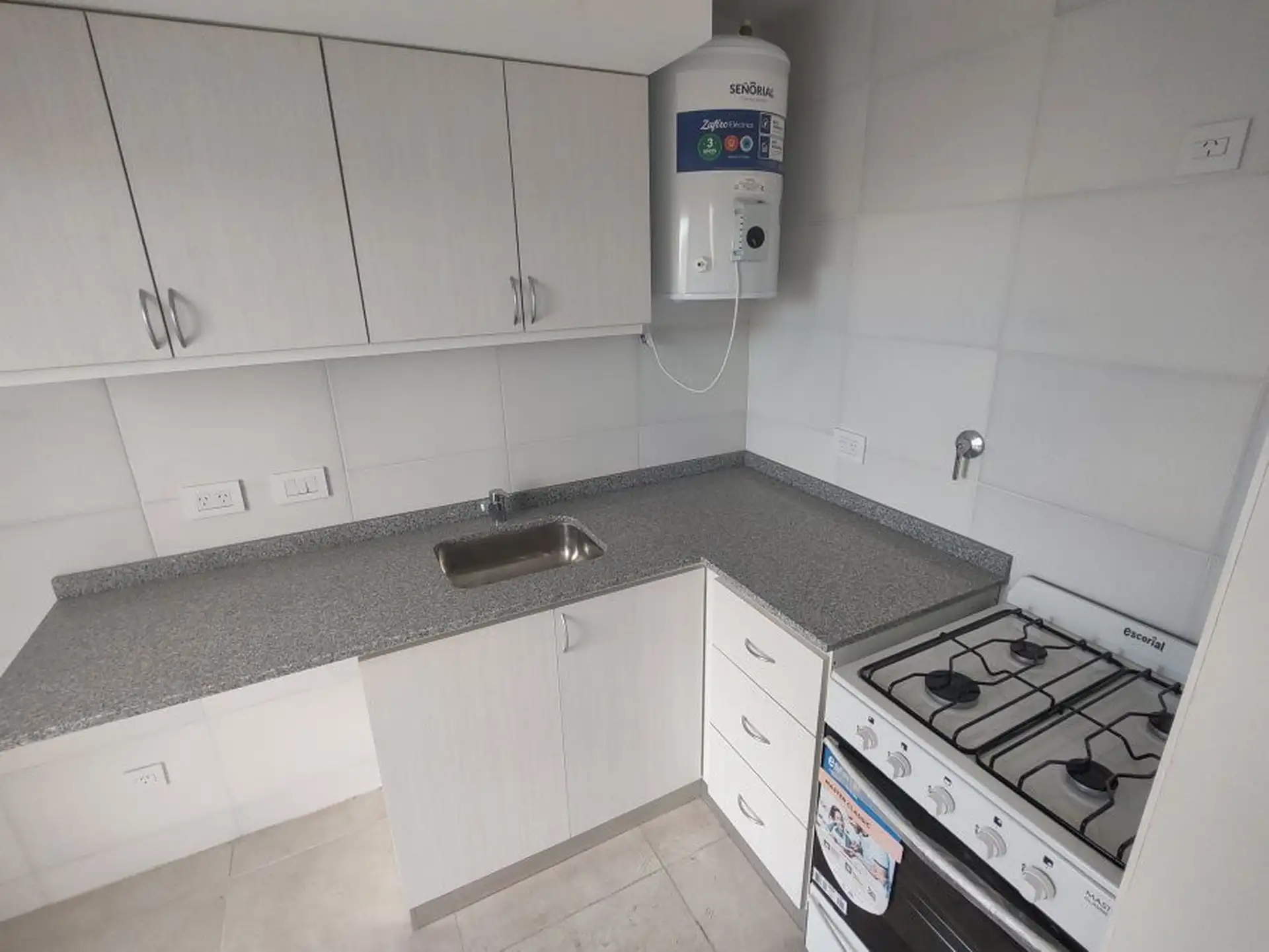 Two-room apartment of approximately 48 m² in the Edificio Chagall on Adolfo Alsina 271, between Av. General Belgrano and Juan Bautista Palaá, in central Avellaneda. The unit has an integrated kitchen-dining area with porcelain tile floors and tiled backsplash, base cabinets with drawers, an overhead cabinet, granite countertop, stainless-steel sink, single-lever faucet, space under the counter for a washing machine, a gas cooktop and water heater, and a door viewer. There is a full bathroom with