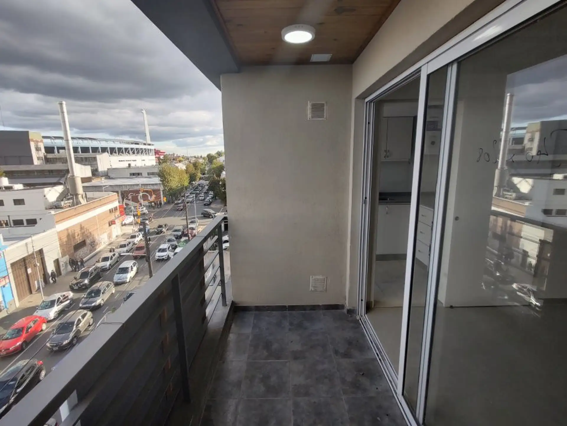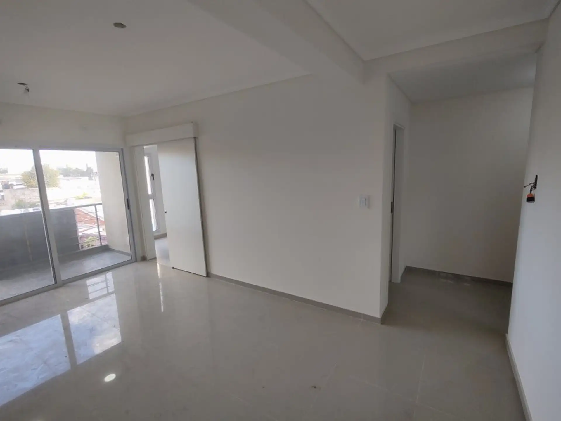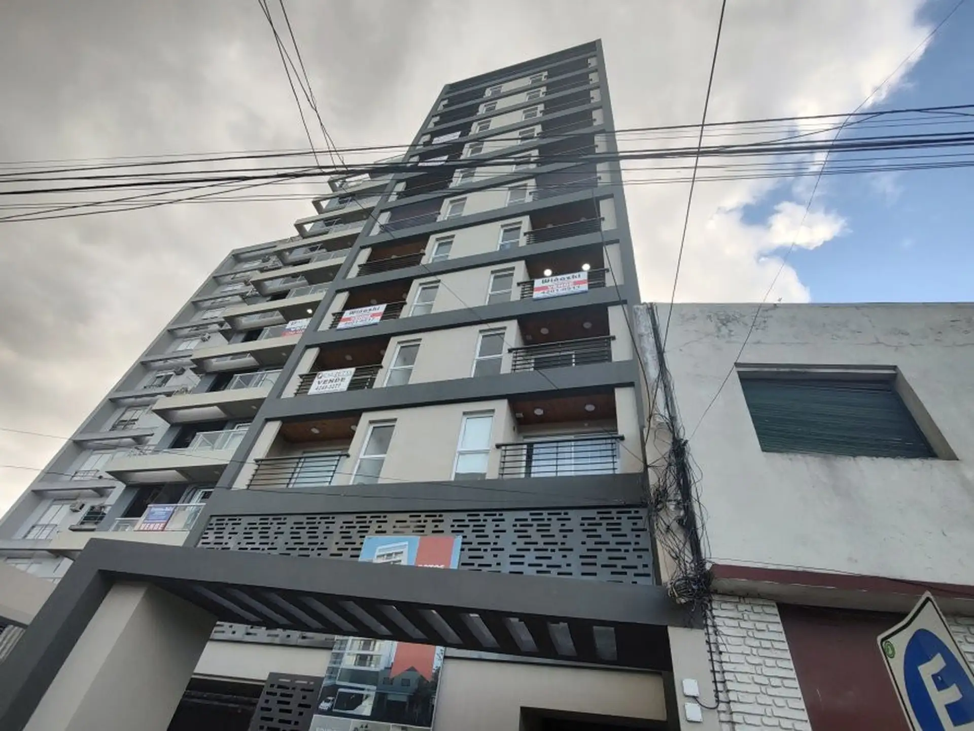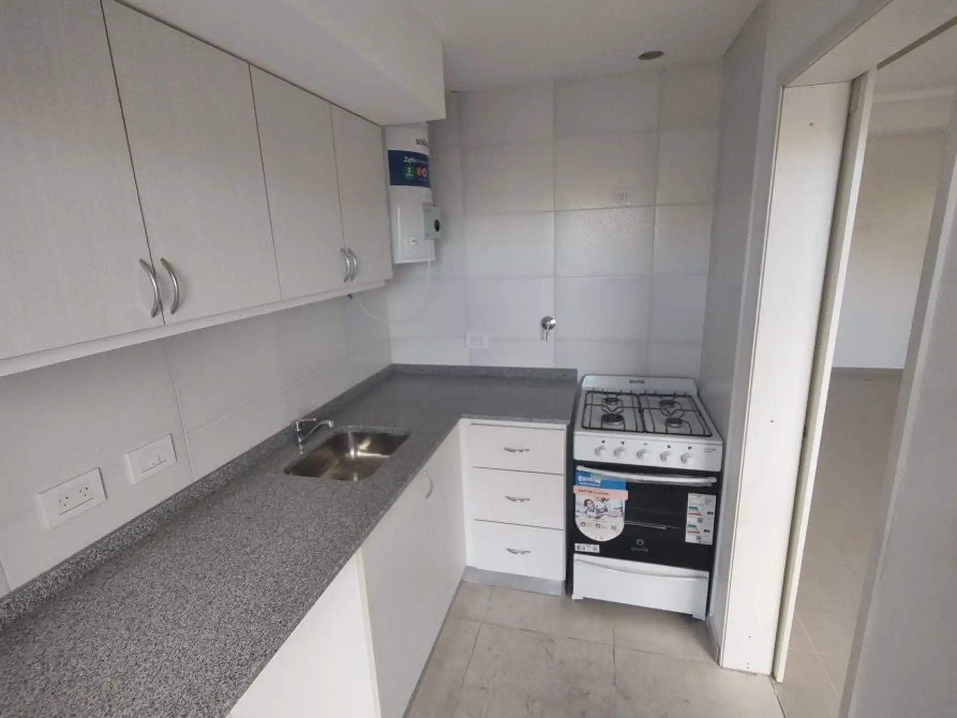 Two-room apartment of approximately 48 m² in the Edificio Chagall on Adolfo Alsina 271, between Av. General Belgrano and Juan Bautista Palaá, in central Avellaneda. The unit has an integrated kitchen-dining area with porcelain tile floors and tiled backsplash, base cabinets with drawers, an overhead cabinet, granite countertop, stainless-steel sink, single-lever faucet, space under the counter for a washing machine, a gas cooktop and water heater, and a door viewer. There is a full bathroom with