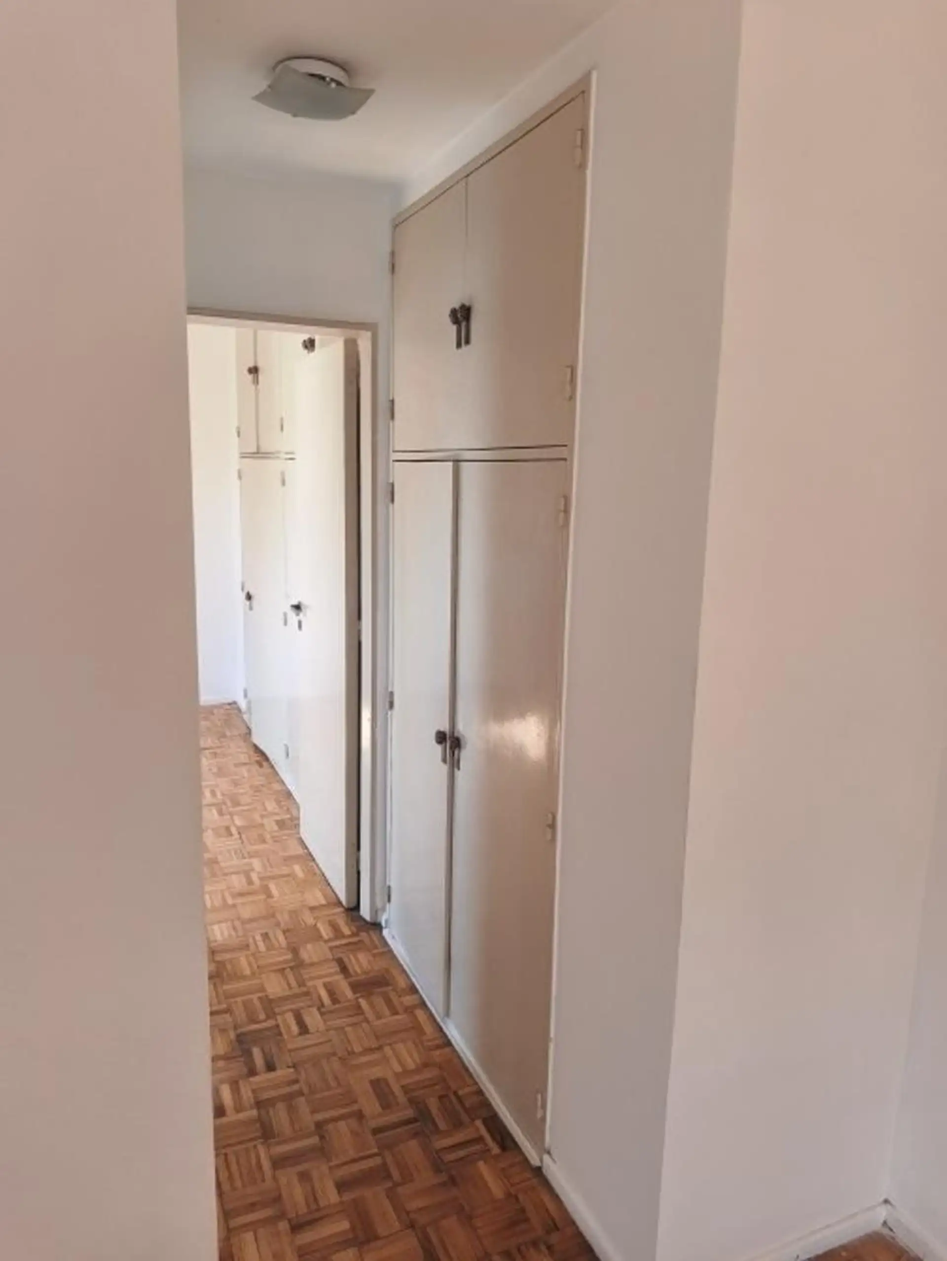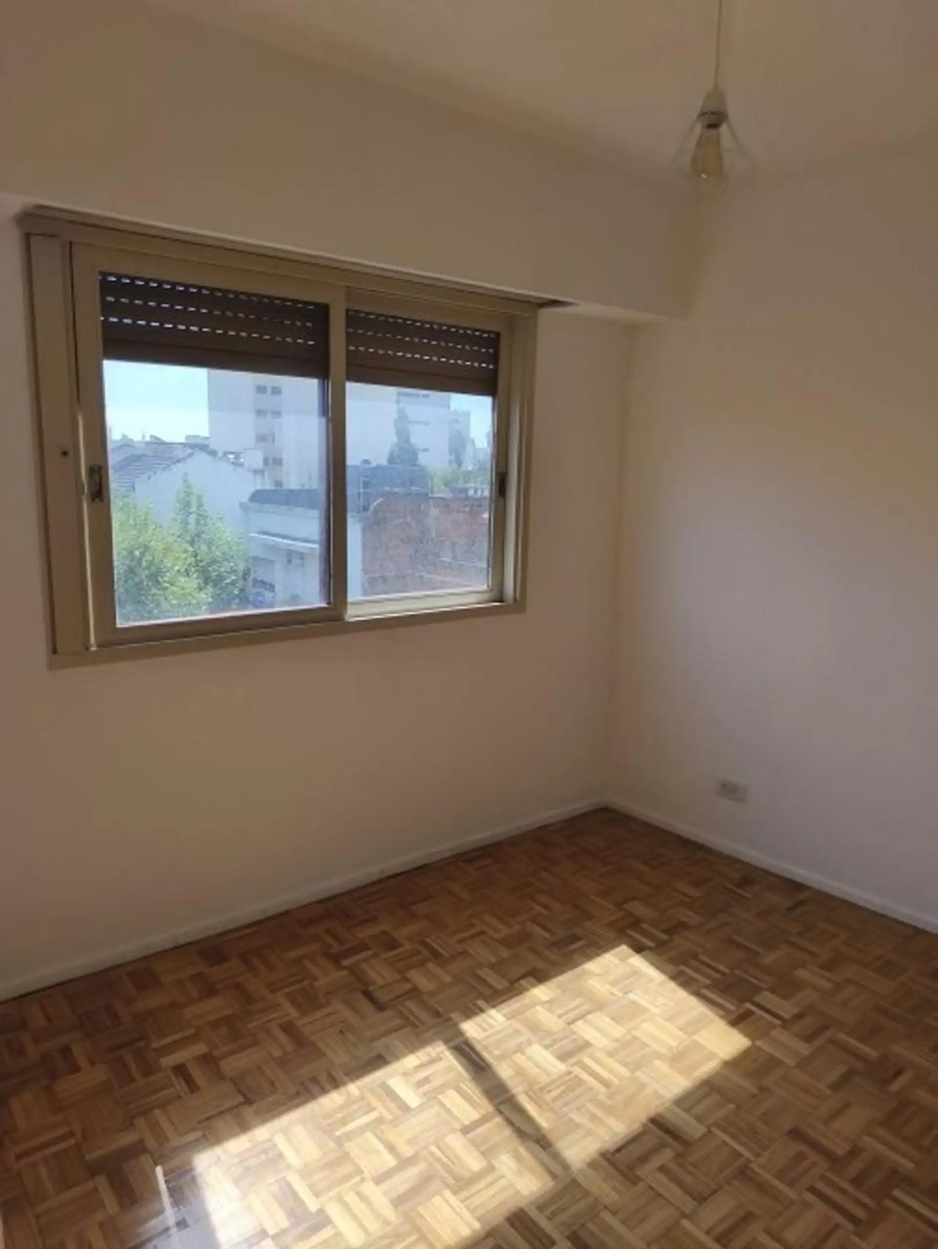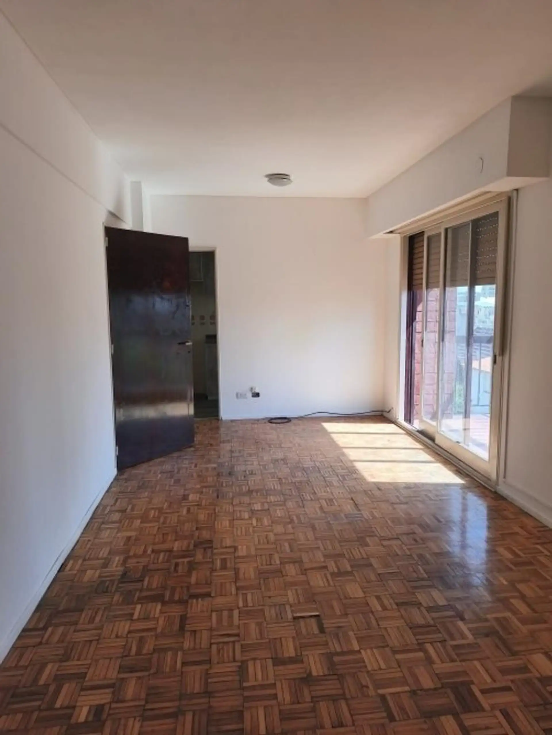 One-bedroom apartment with living-dining area, hardwood floors and a floor-to-ceiling window opening onto a front balcony. Separate kitchen equipped with granite countertop, double sink, single-lever faucet, base cabinets and overhead cabinets, plus a separate laundry area with space for a washing machine and a gas water heater. The bedroom has hardwood flooring, a built-in 4-door wardrobe, an upper storage area and a front-facing window, with a full bathroom and an additional built-in closet in