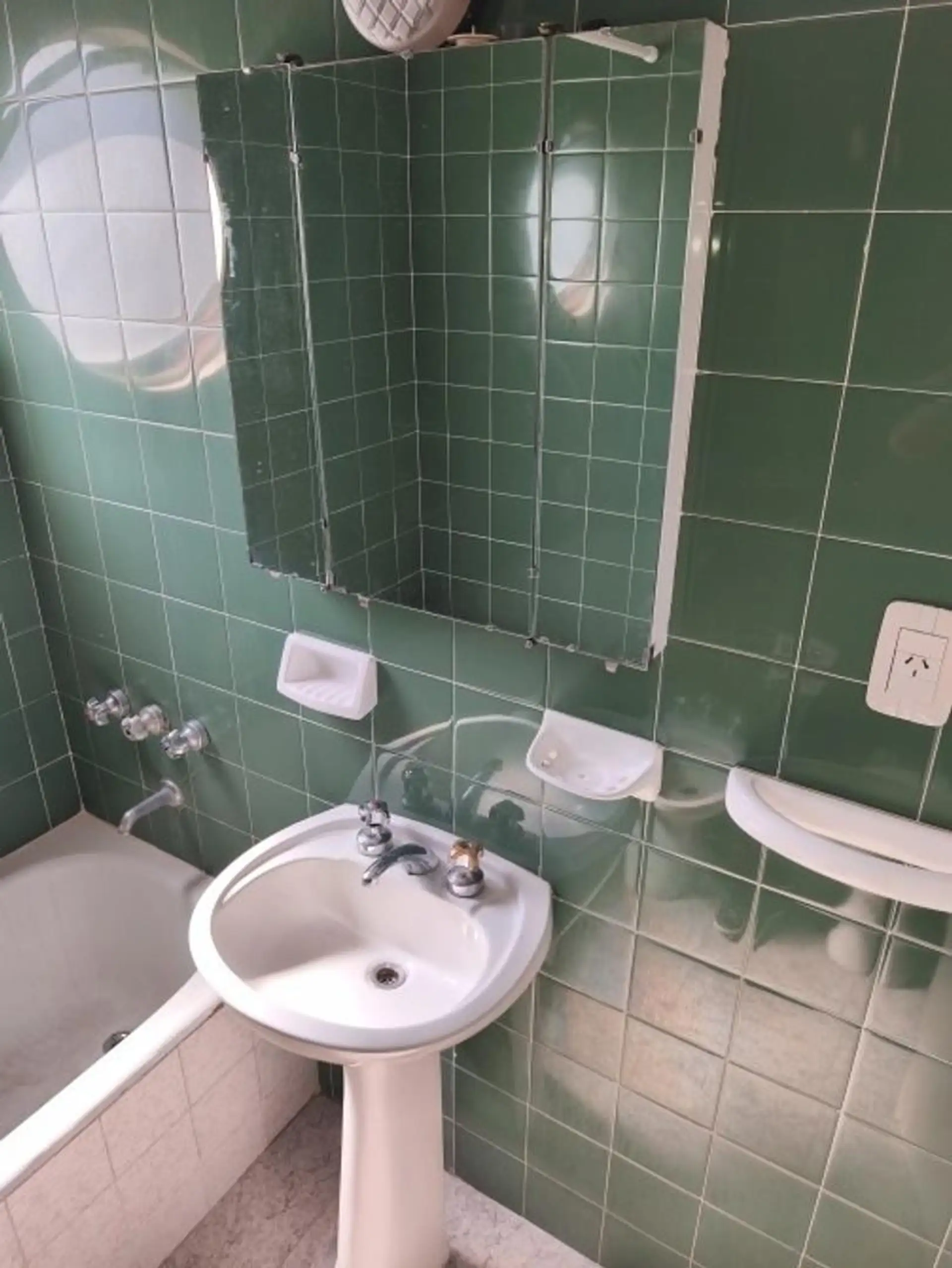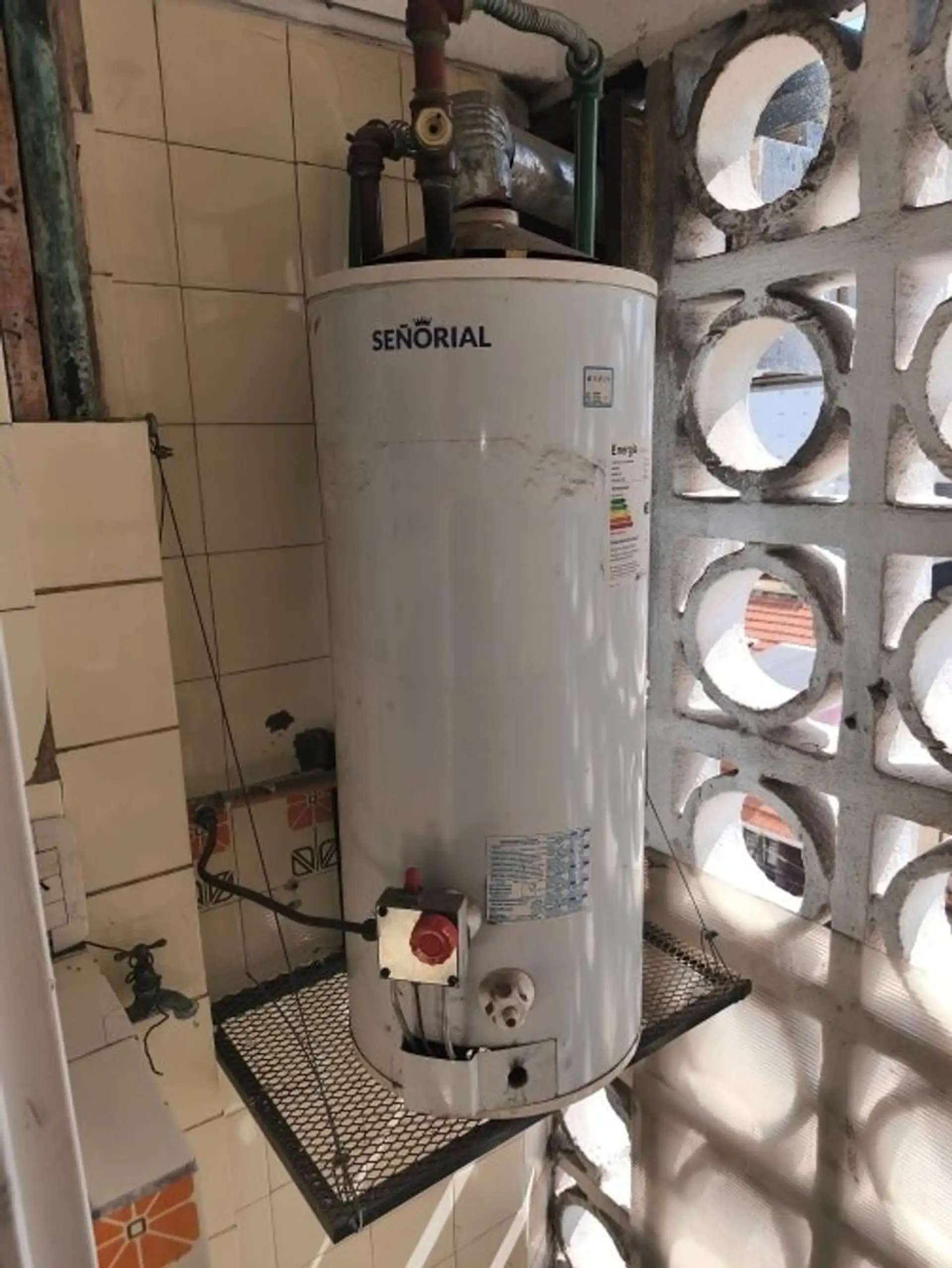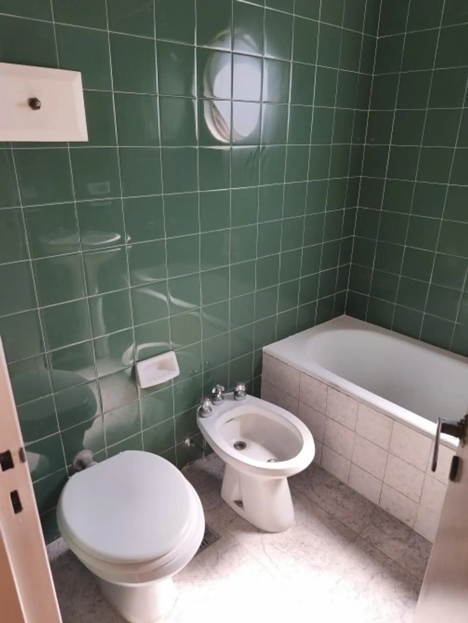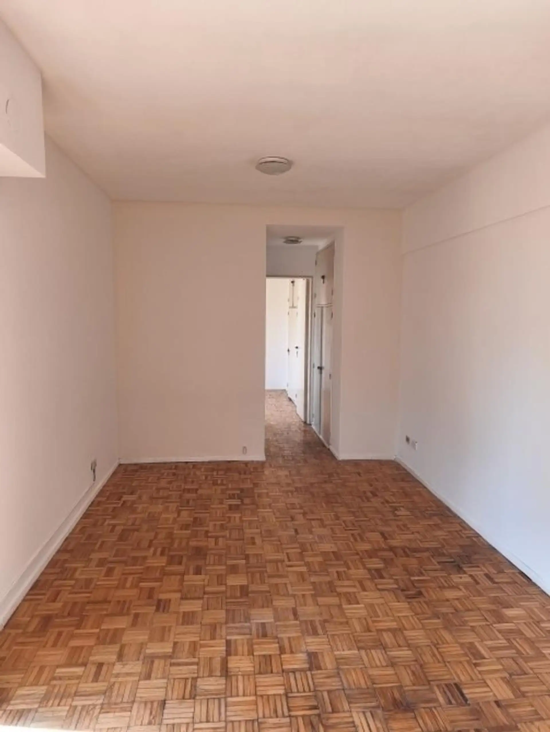 One-bedroom apartment with living-dining area, hardwood floors and a floor-to-ceiling window opening onto a front balcony. Separate kitchen equipped with granite countertop, double sink, single-lever faucet, base cabinets and overhead cabinets, plus a separate laundry area with space for a washing machine and a gas water heater. The bedroom has hardwood flooring, a built-in 4-door wardrobe, an upper storage area and a front-facing window, with a full bathroom and an additional built-in closet in