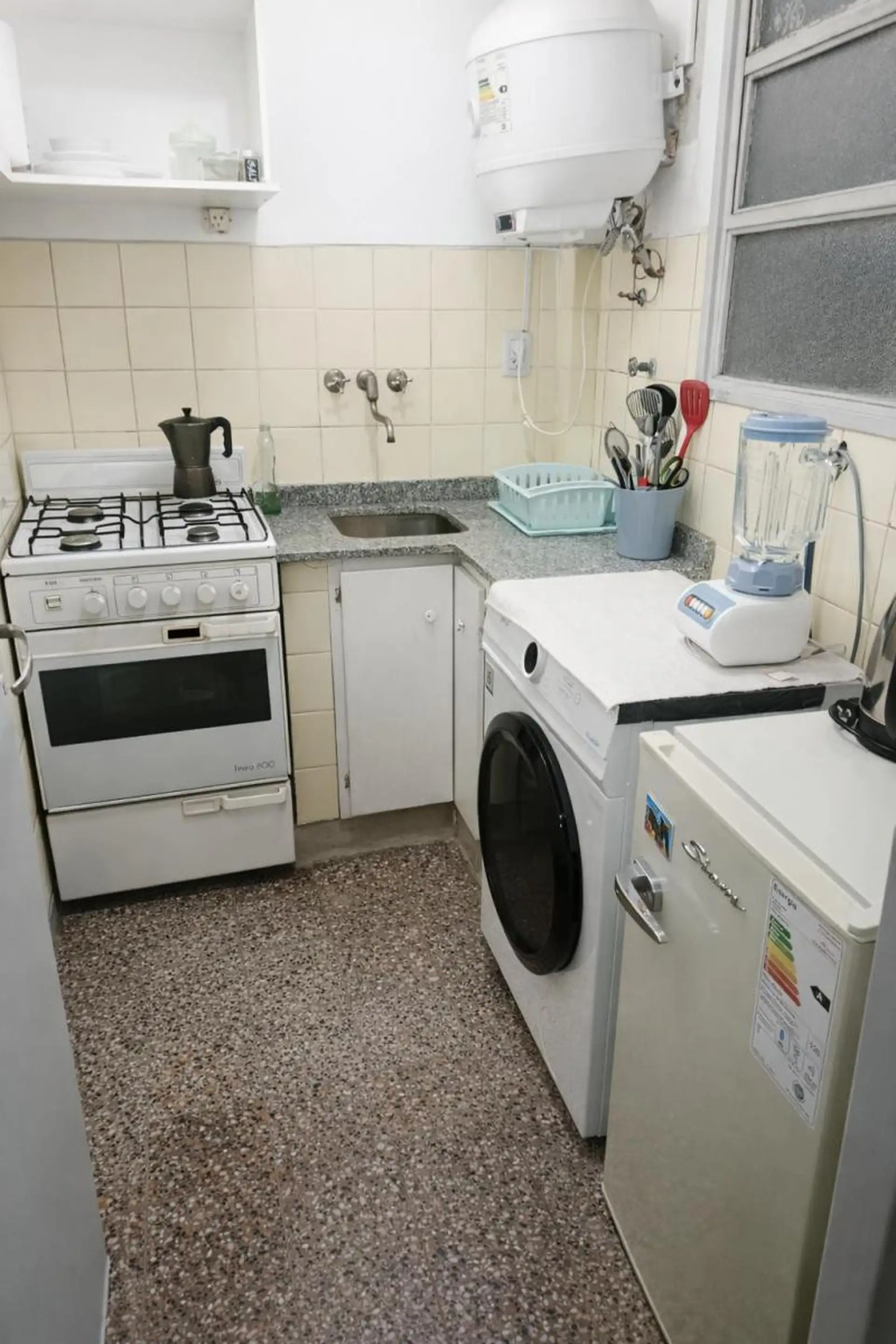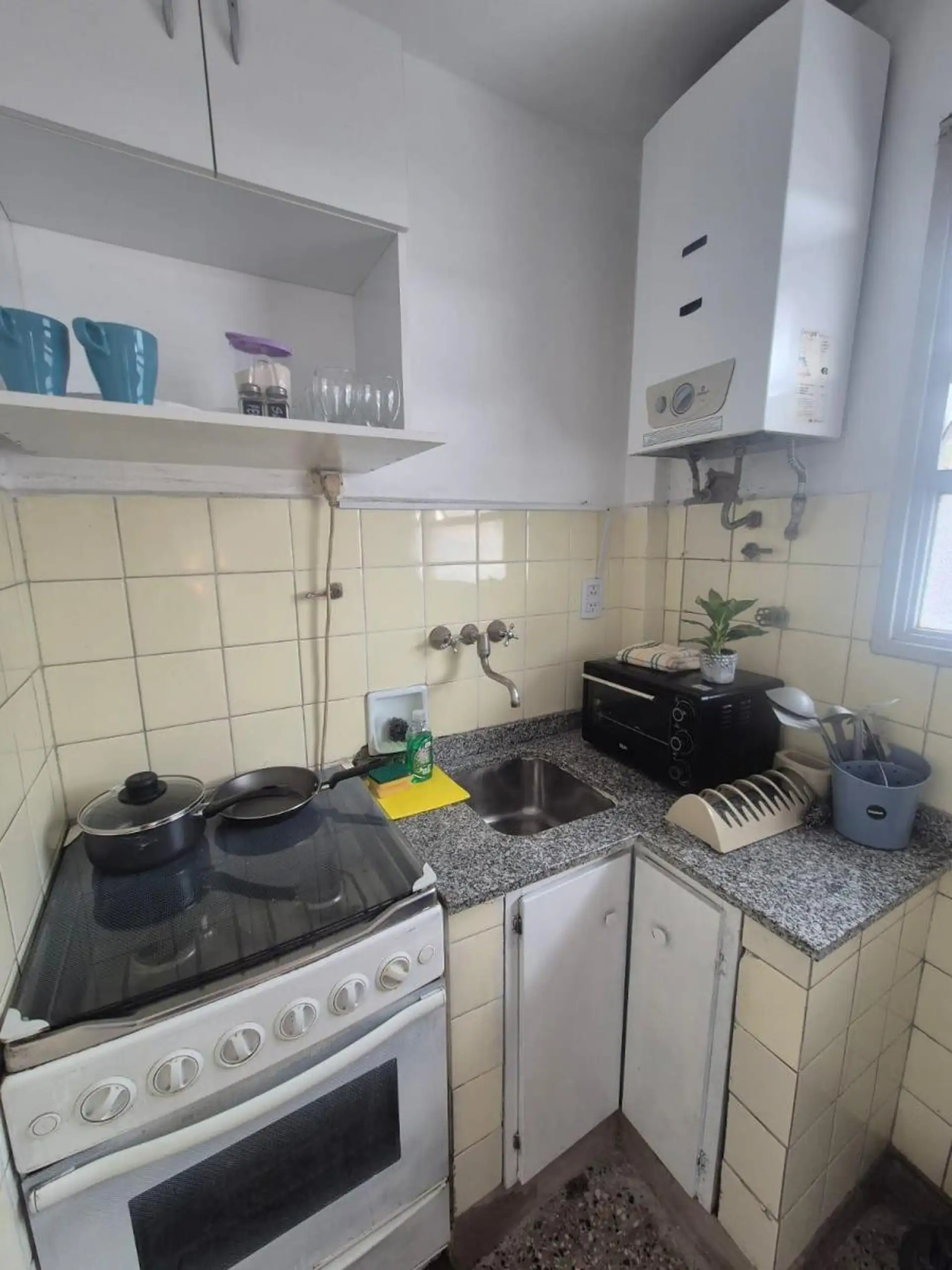 Studio apartment with a balcony, in Balvanera. Located on Av. Córdoba 2000, with a separate kitchen and air conditioning. Includes a fridge and a washing machine, and comes with built-in storage and furnished rooms. The listing states 20 years of age and a rental price of USD 770 for a package.