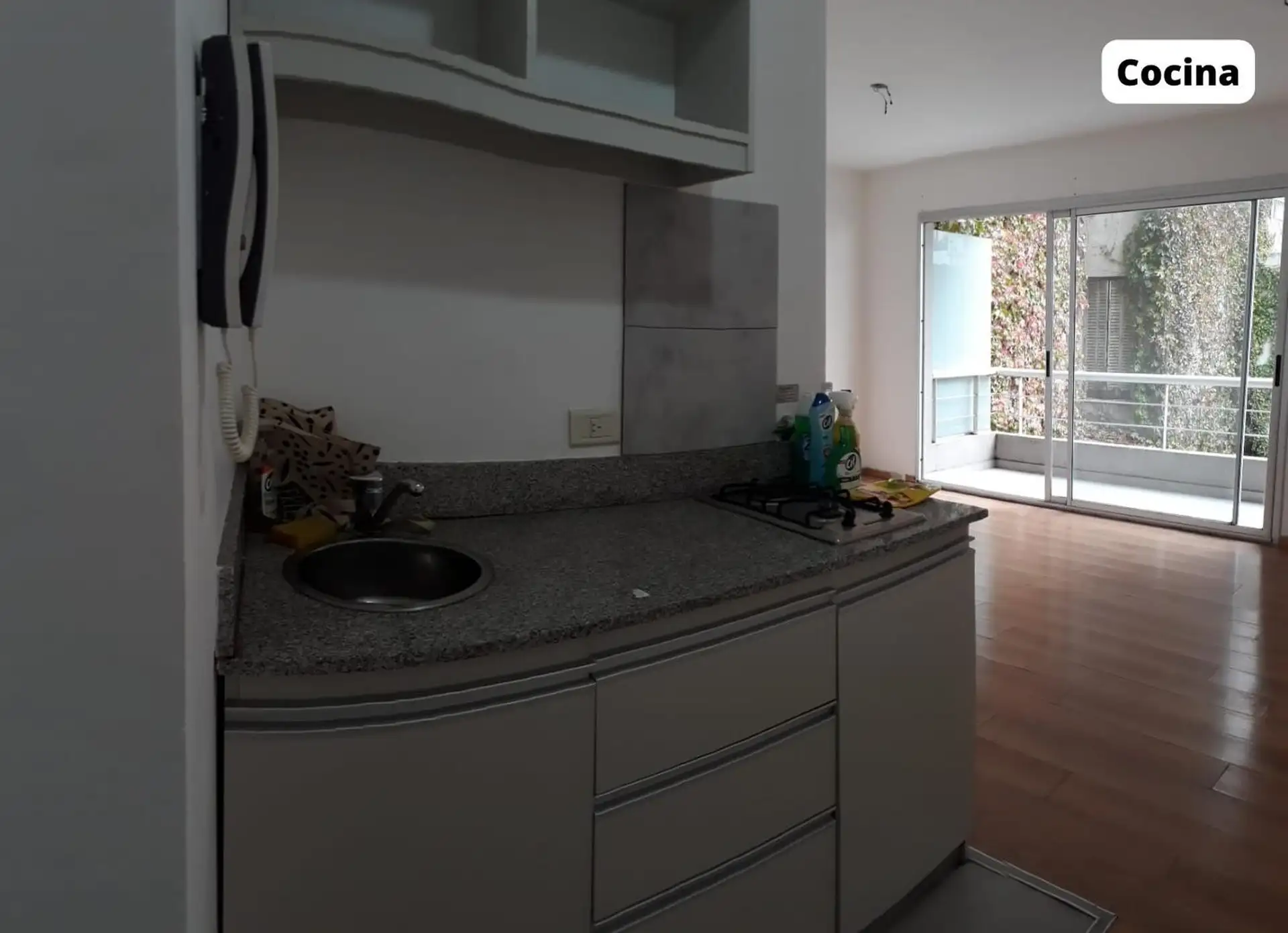 Studio apartment with a balcony in Balvanera. The building has a communal room (SUM) and a grill (parrilla). Building fees include AYSA. Deposit is 1 month. Taxes and water are the tenant’s responsibility.