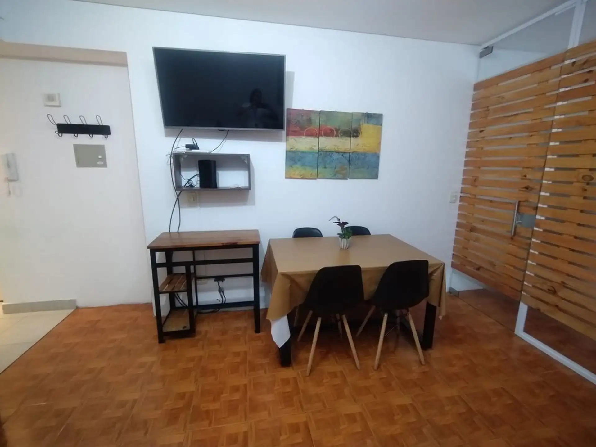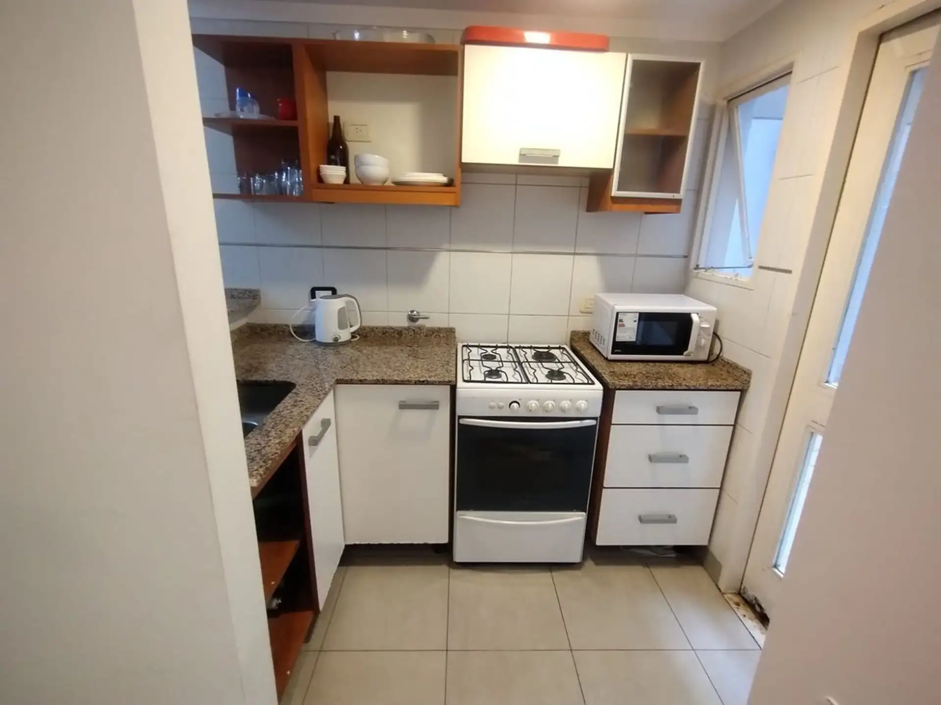 Furnished apartment with 1 bedroom in Balvanera, 54 m² total on the west-facing side. The unit includes a balcony and an exclusive-use patio. It is equipped with air conditioning, a fitted kitchen with appliances and utensils, and TV and internet; it also provides bed linens and towels.