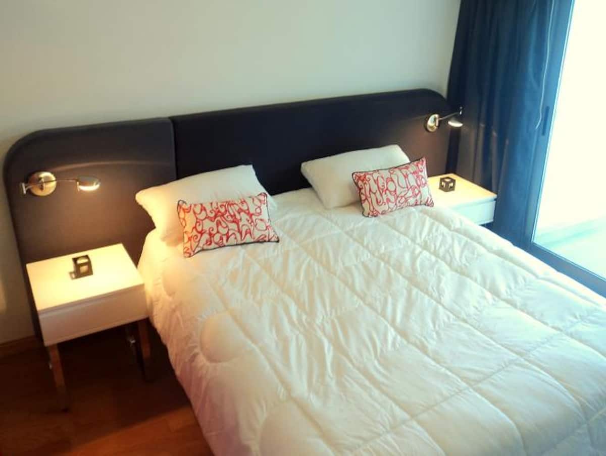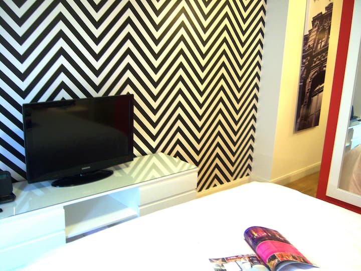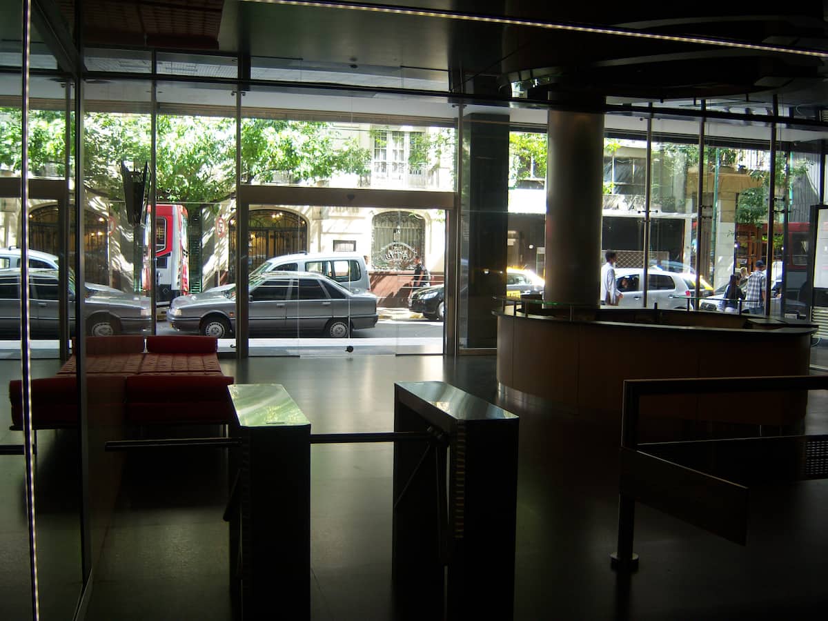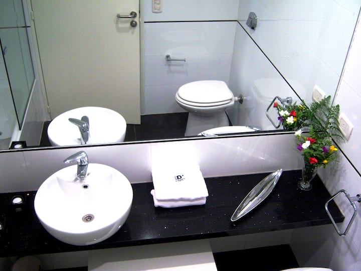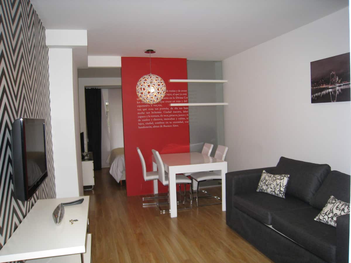Studio apartment in a modern building in central Buenos Aires, meters from Av. Corrientes. 24-hour security is provided, with guest access via an entry ID system. The building has a sky bar on the 10th floor and a laundry room in the first basement, plus three underground parking areas connected directly to the apartments (paid service). The studio accommodates up to 4 people and includes a queen bed or two single beds, a double sofa bed, two flat-screen TVs, Wi-Fi, and a fully equipped kitchen