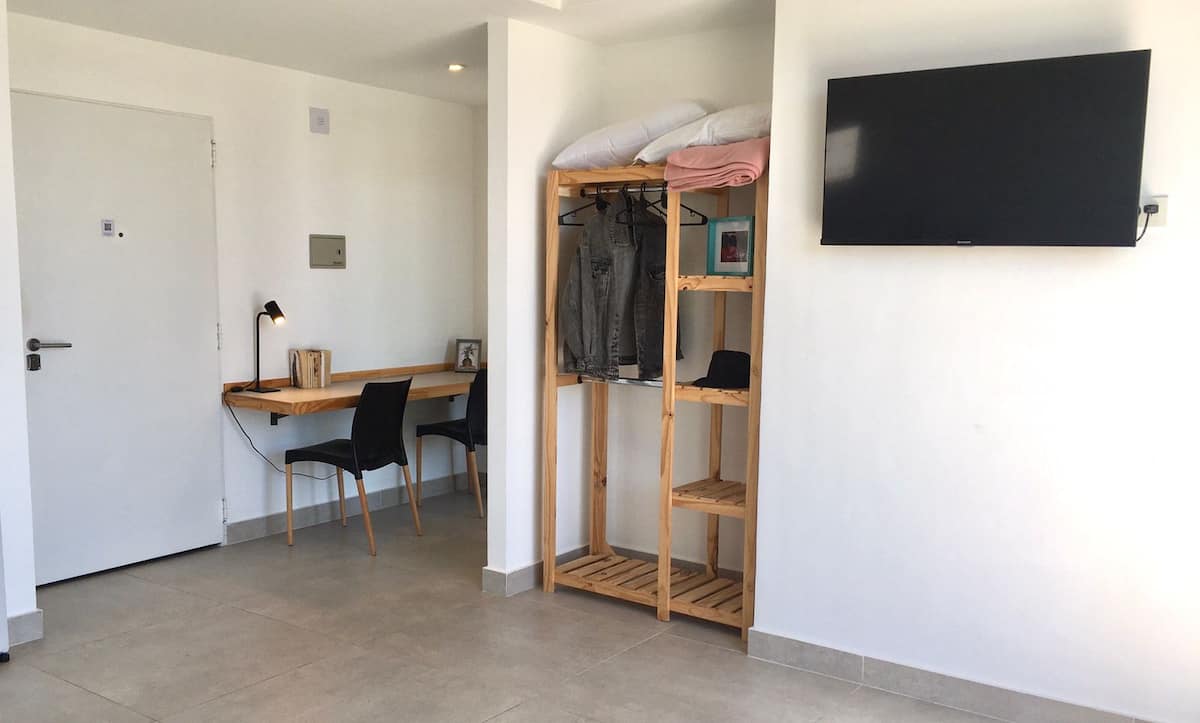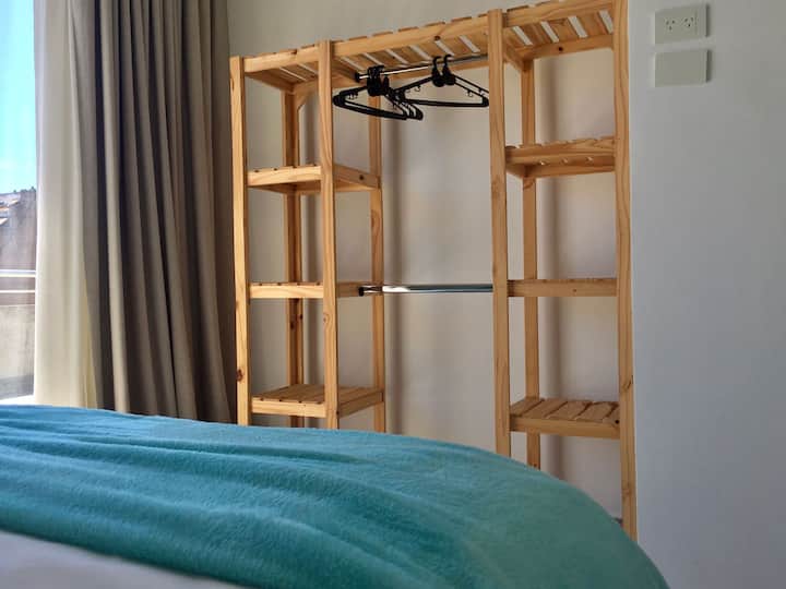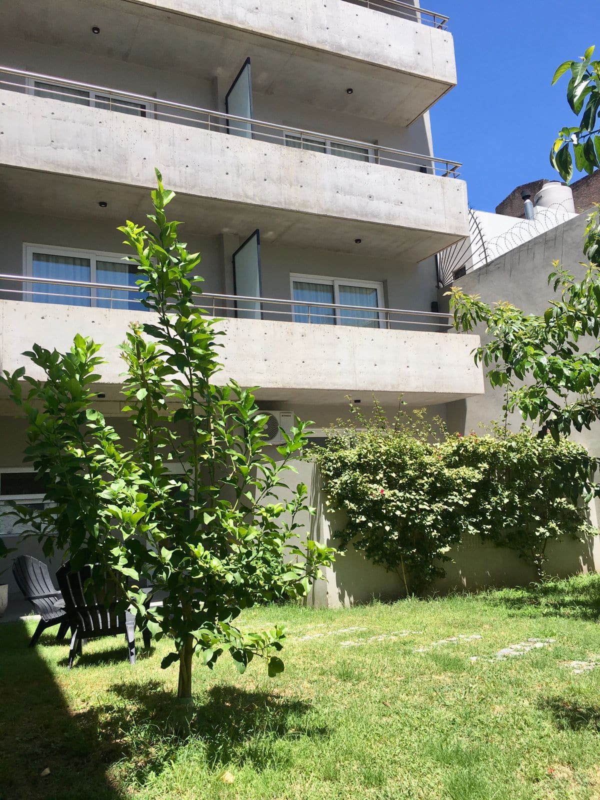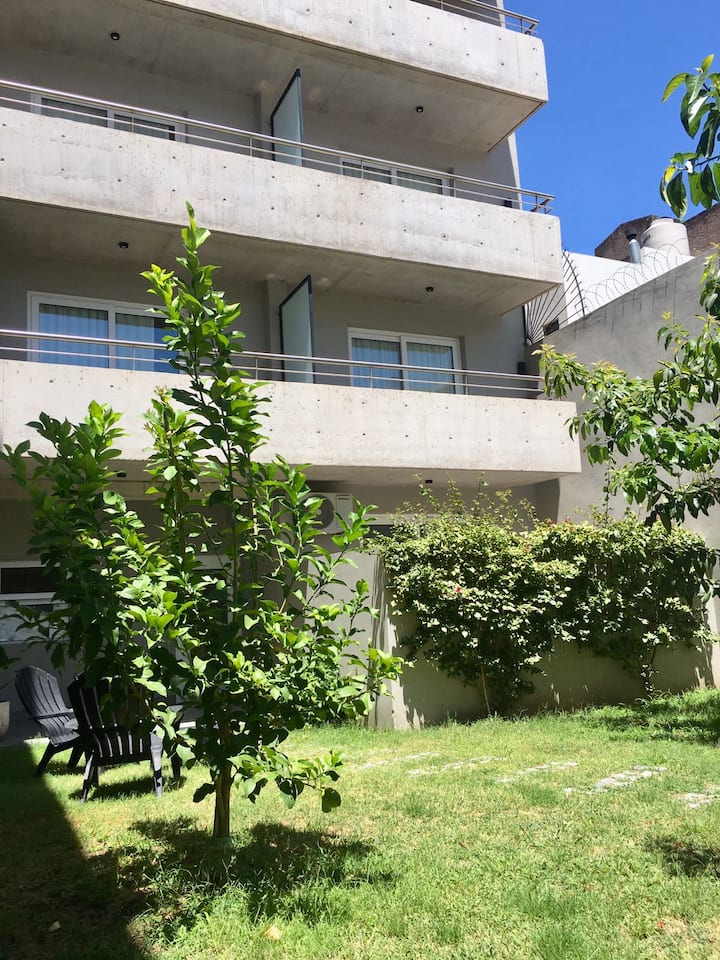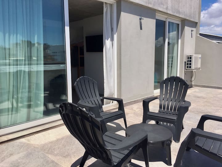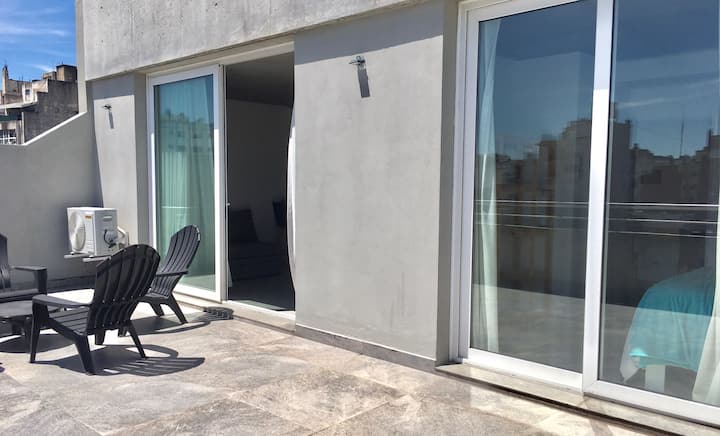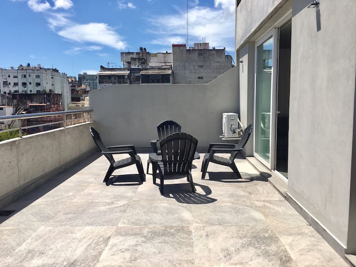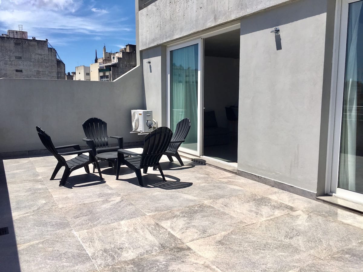 Two-room apartment in Turquoise Buenos Aires, a 23-unit building designed for short stays. Includes a fully equipped bed and armchair bed, air conditioning in the room and living room, a terrace, and high-speed Wi-Fi. Access includes a garden and a terrace with a panoramic view. The building offers easy access to Subte Line B, Carlos Gardel station, and several bus lines.