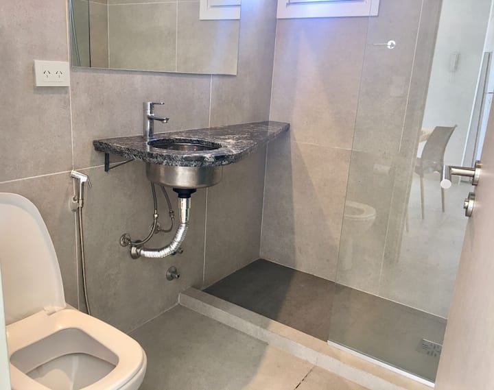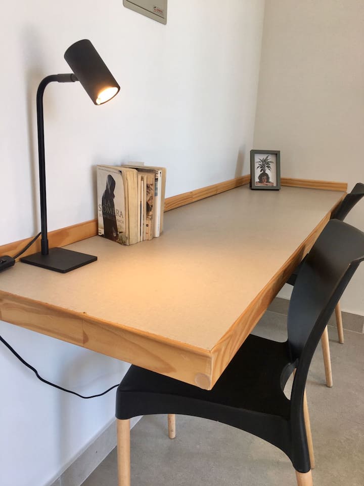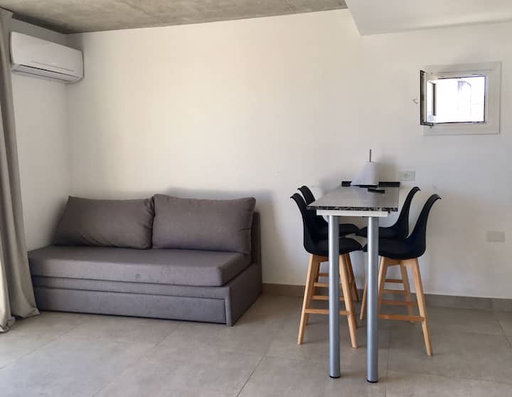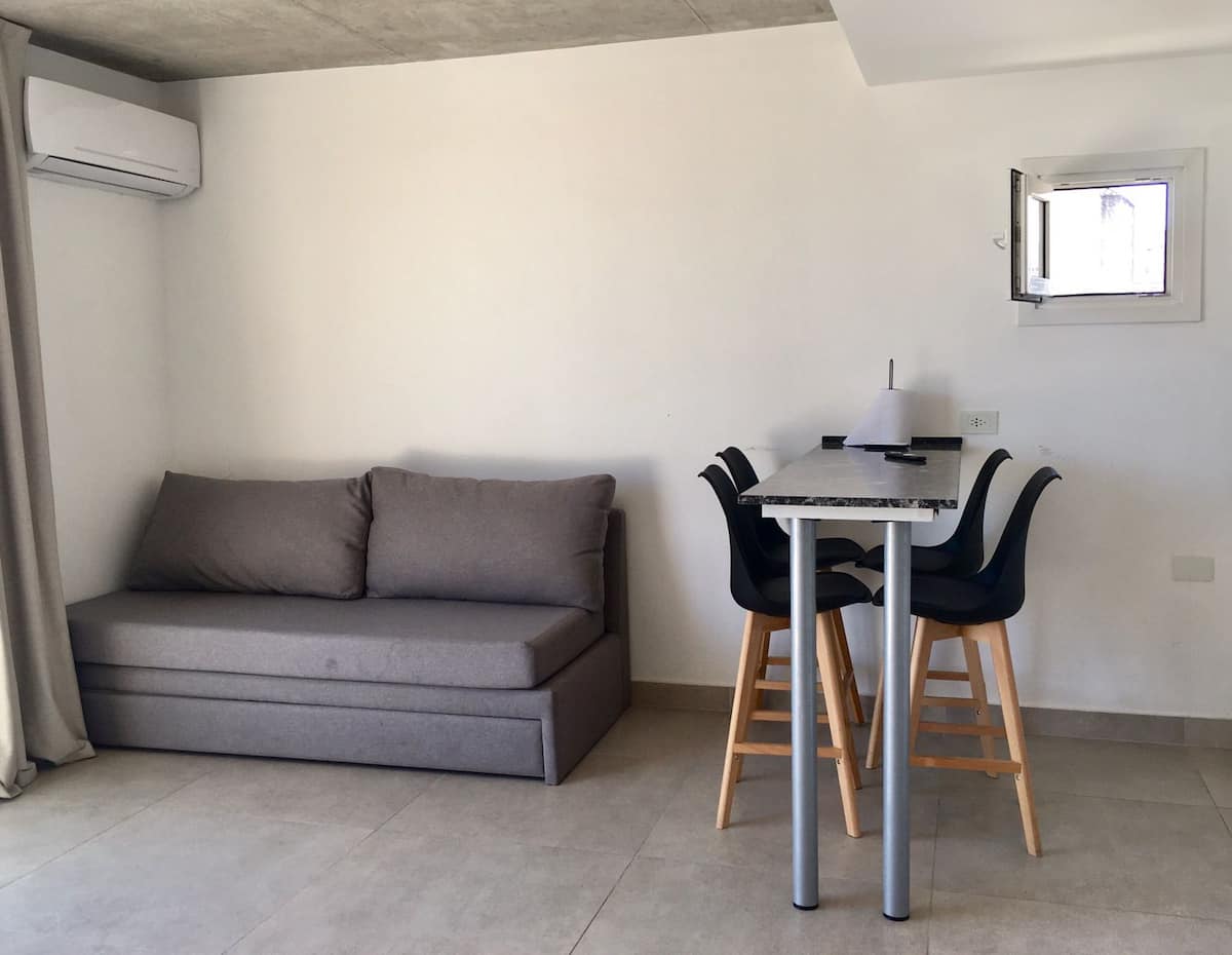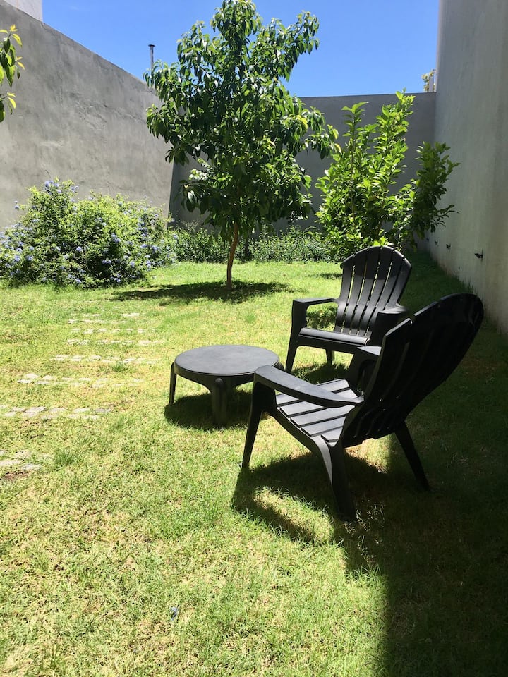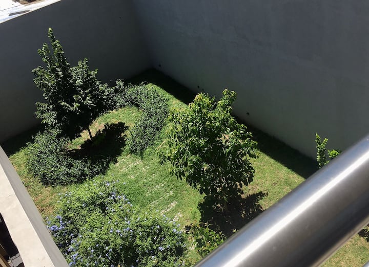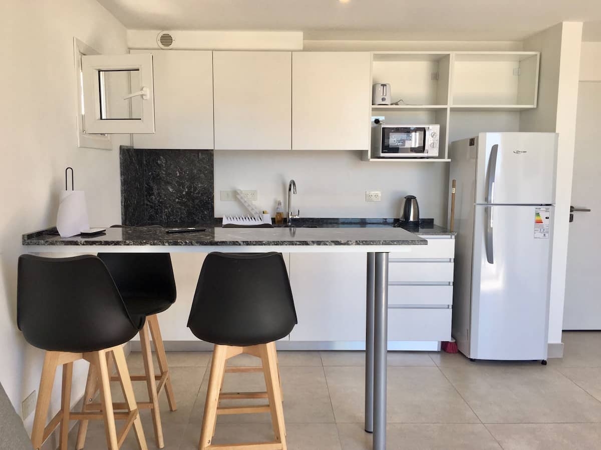 Two-room apartment in Turquoise Buenos Aires, a 23-unit building designed for short stays. Includes a fully equipped bed and armchair bed, air conditioning in the room and living room, a terrace, and high-speed Wi-Fi. Access includes a garden and a terrace with a panoramic view. The building offers easy access to Subte Line B, Carlos Gardel station, and several bus lines.