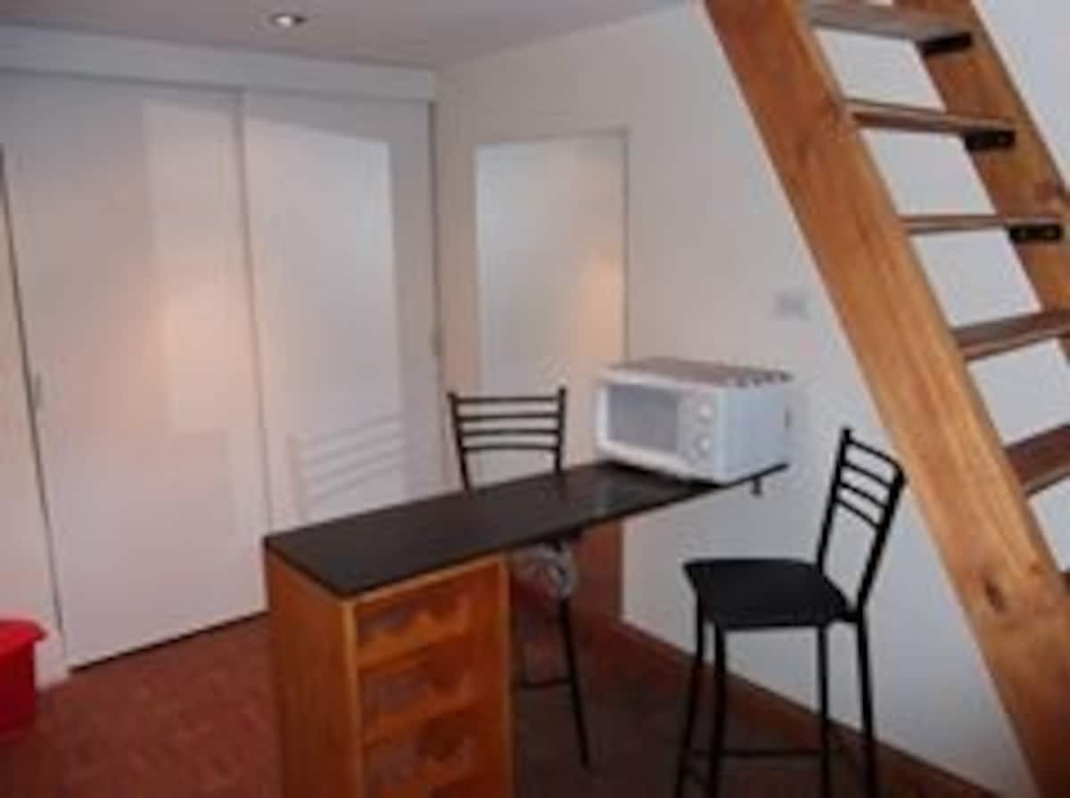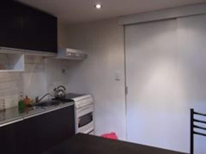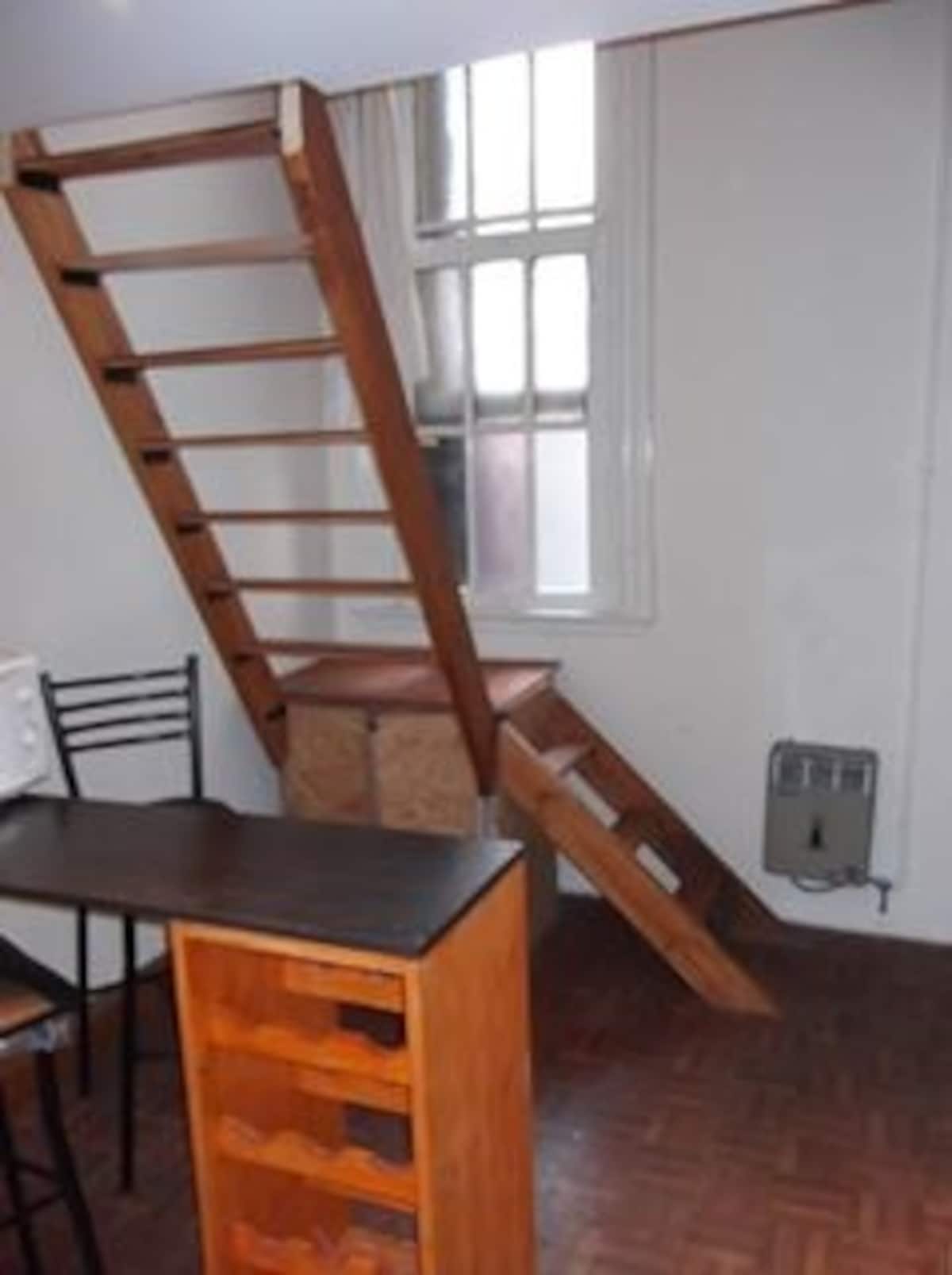 Ground-floor or upper unit with private entrance in Balvanera, around three blocks from the Congress and one block from Av. Rivadavia and Subway A. The layout has a dining kitchen and a room on the lower level, with a refrigerator and microwave and kitchen utensils. On the upper level there is an en-suite guesthouse, with bedding provided.