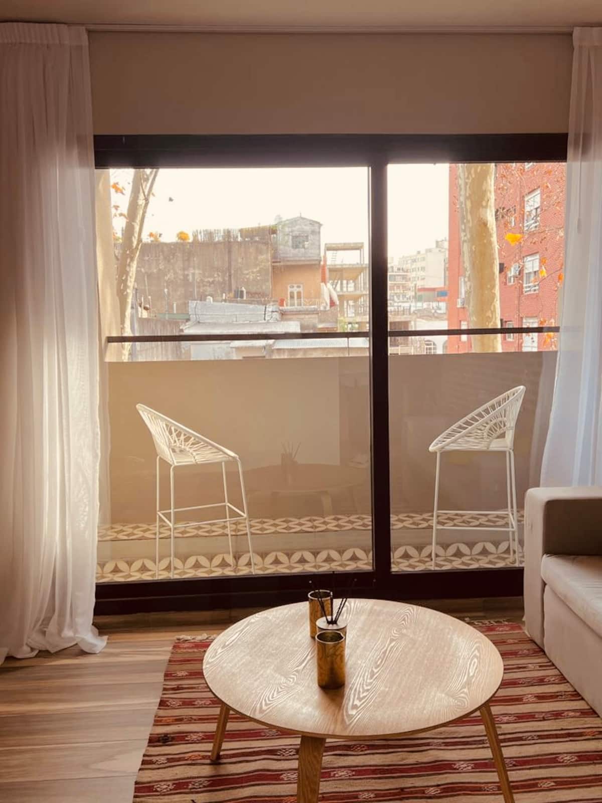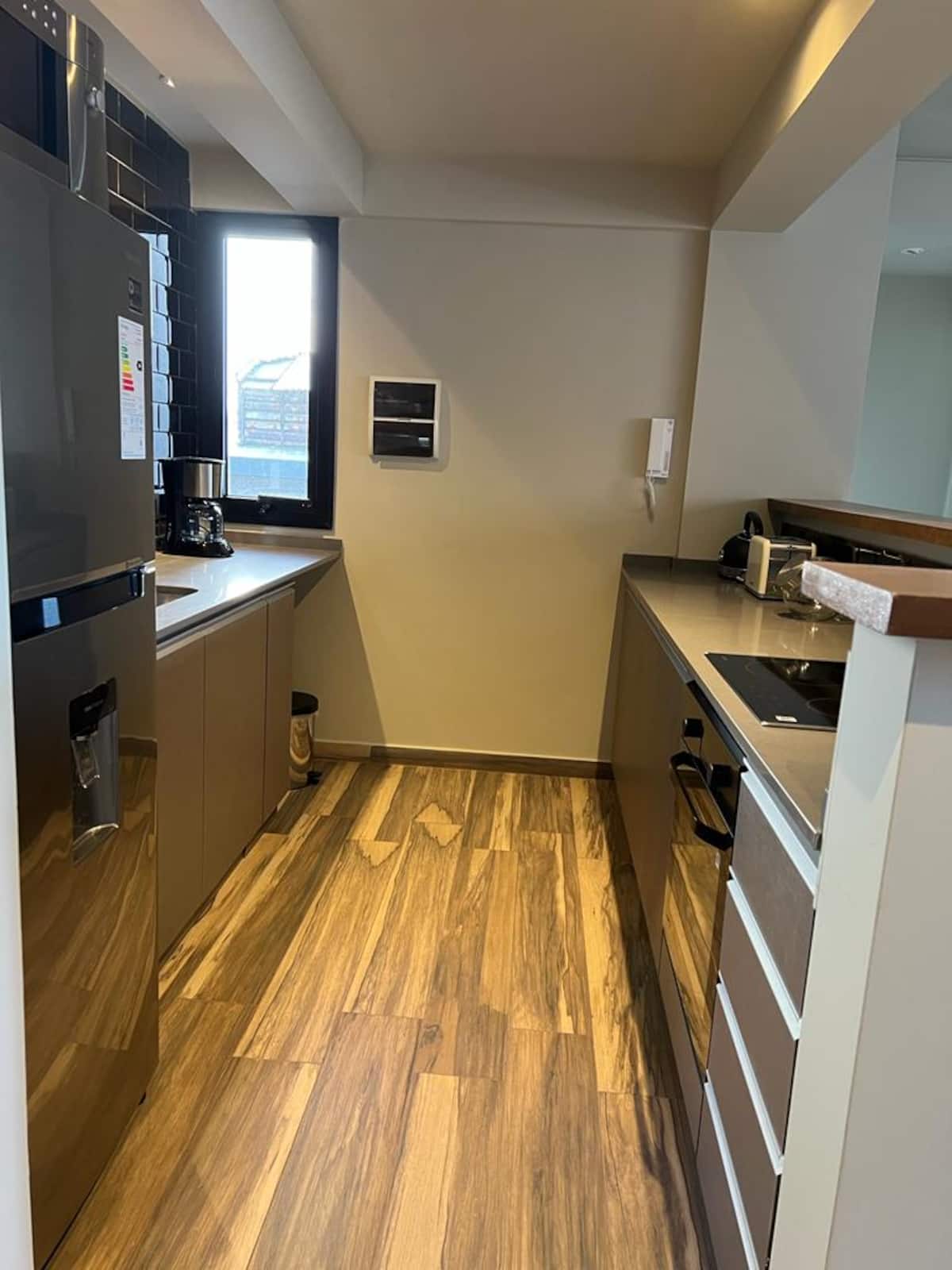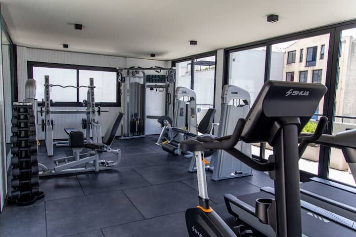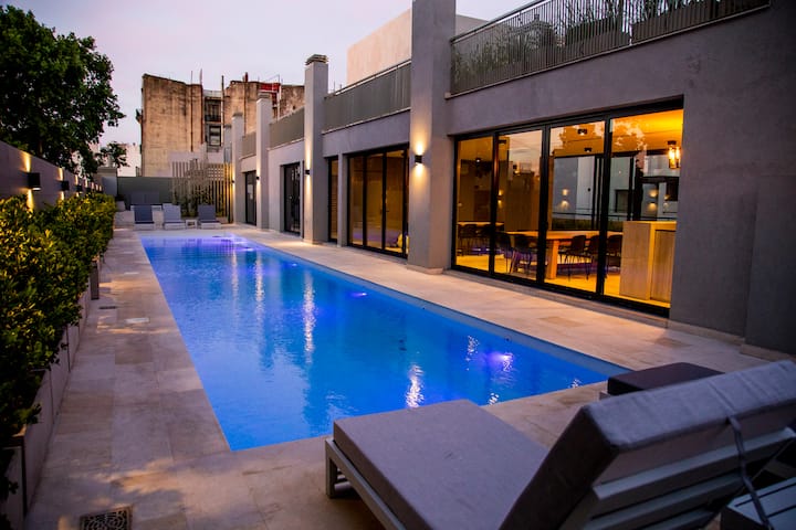 New designer apartment in the La Galerie residential complex in San Telmo, street-facing with a balcony. It includes a fully equipped kitchen, capacity for 4 people, and access to a terrace pool for stays of 3 nights or more. Building amenities include a communal room with WiFi, SUM, laundry, gym, 24-hour security, and a solarium, with elevator access.