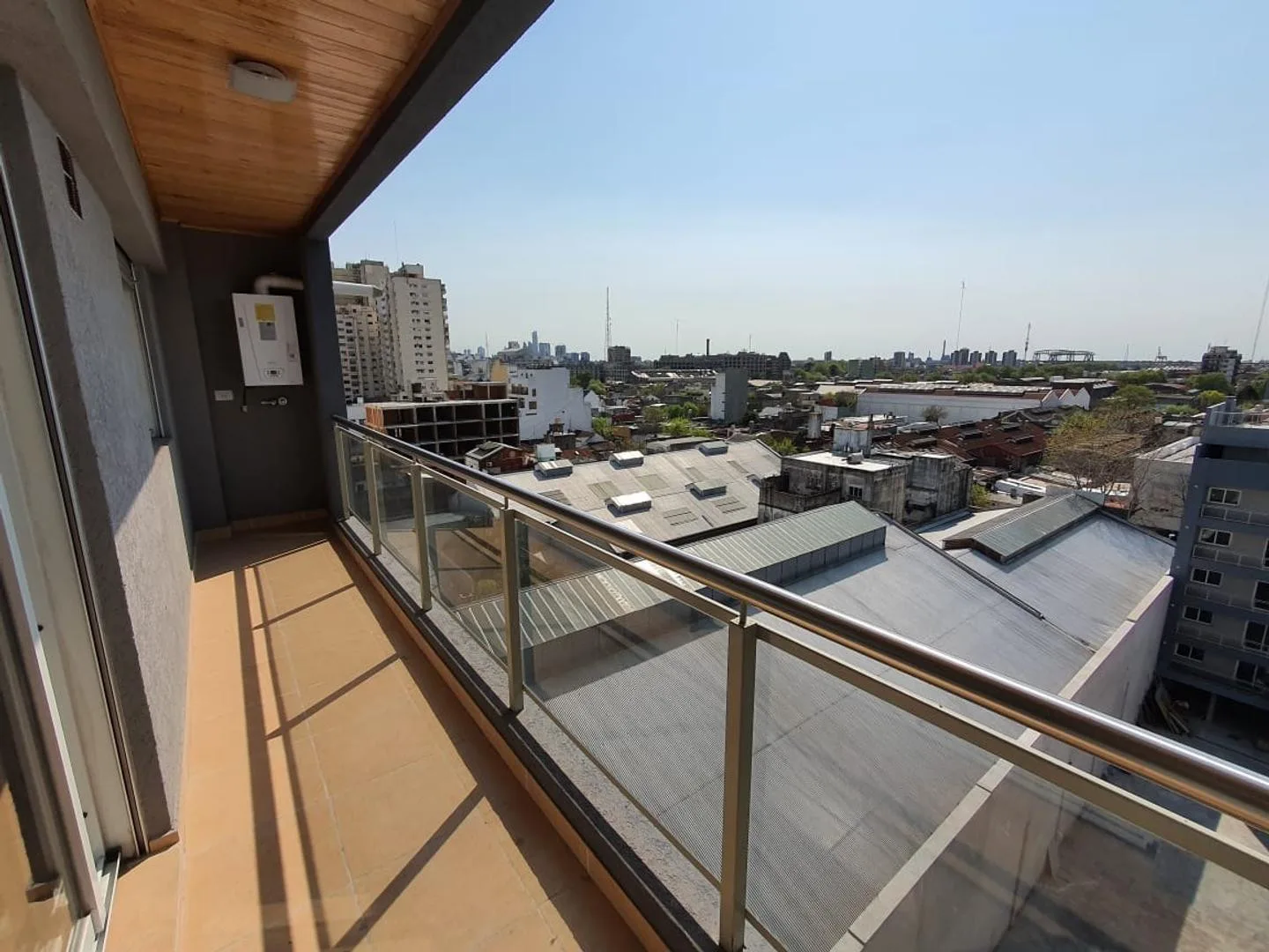 Two-room apartment of 1 bedroom and living-dining area, brand new. Covered layout includes a living-dining room with access to a continuous balcony and panoramic views. Separate kitchen with breakfast bar and installation for a washing machine; full bathroom; bedroom with wardrobe. Individual boiler with radiators in all rooms. Communal residents' lounge (SUM) in the building; located on Av. Montes de Oca near shops and bus routes.