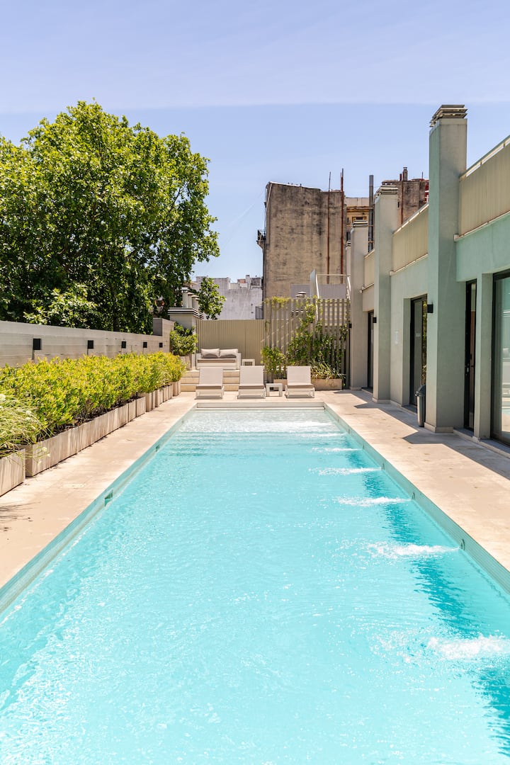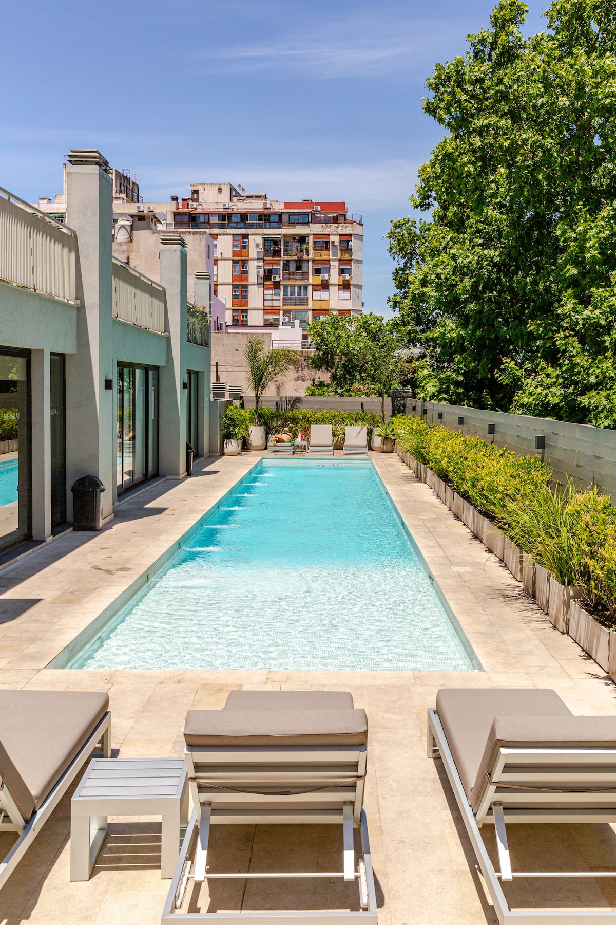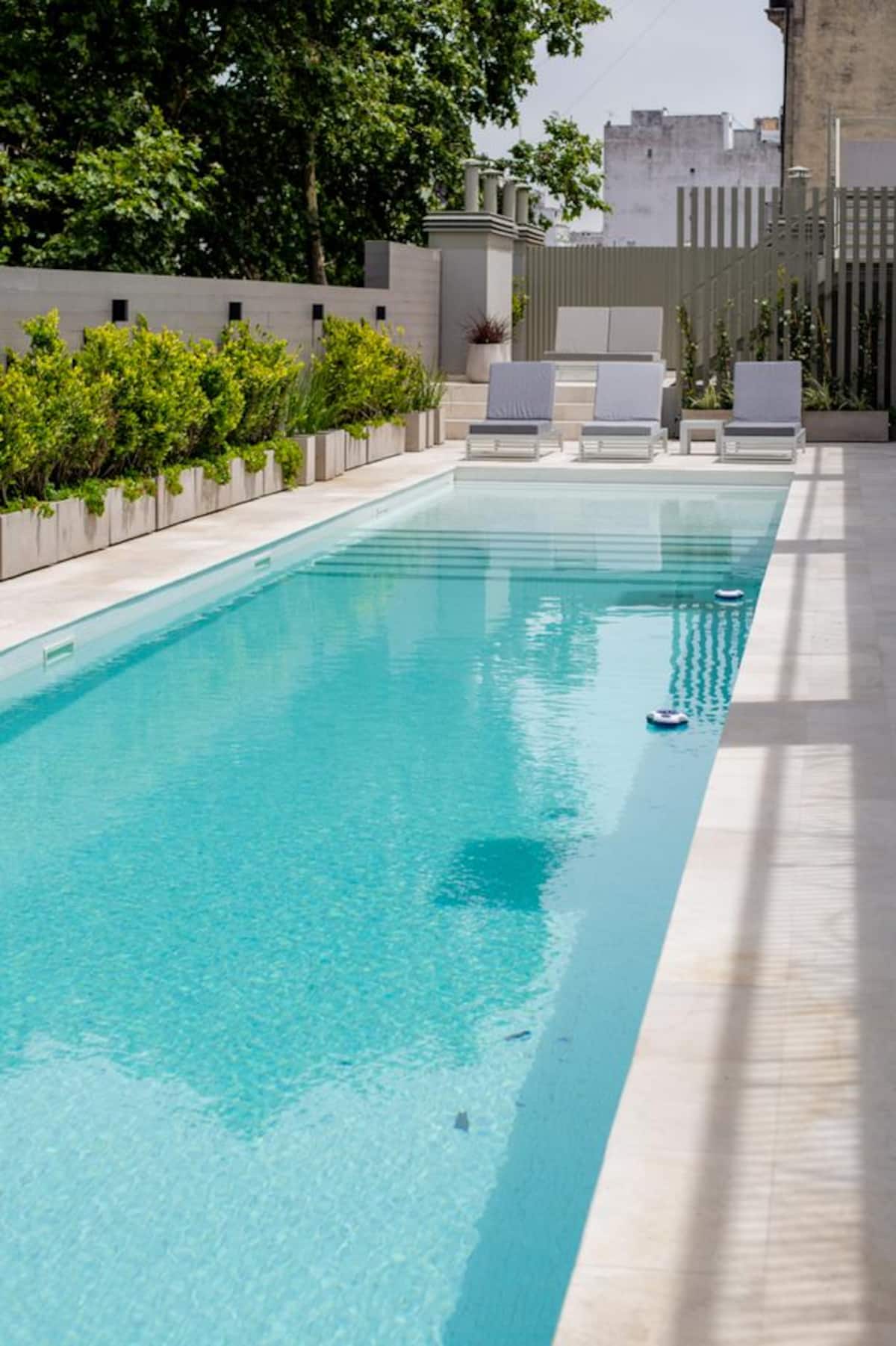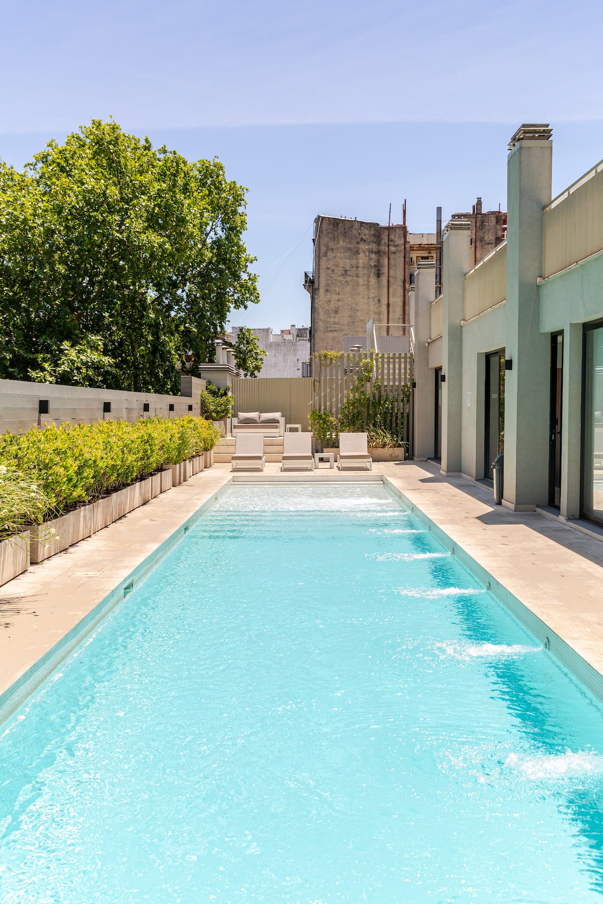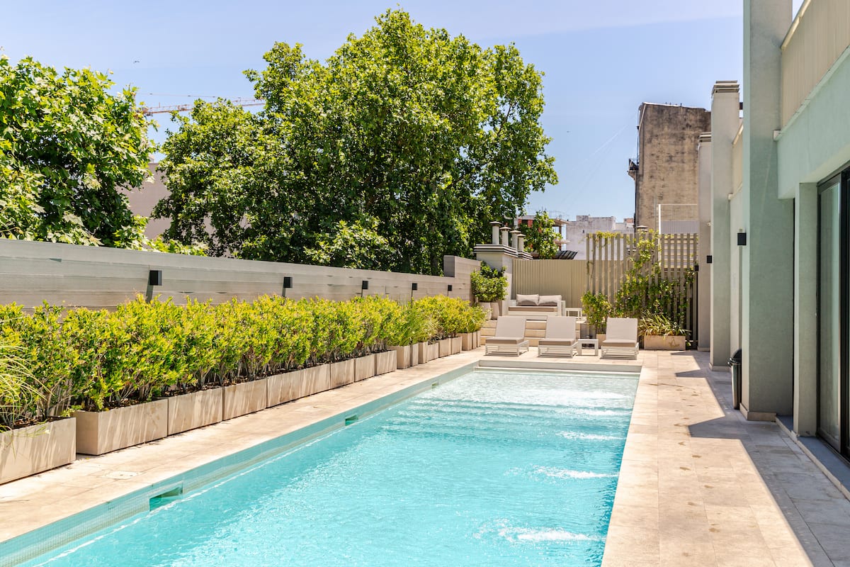 One-bedroom apartment in San Telmo with a king-size bed in the bedroom. The unit has a living room with a sofa bed, two bathrooms, and a fully equipped kitchen, plus Wi‑Fi with 300 mbps internet inside. The residential complex is an old warehouse converted into apartments, with a 65 ft outdoor pool, solarium, gym, coworking area, laundry, and security staff 24/7. Communal areas include the pool, terrace, gym, and communal tables, with access subject to building rules.