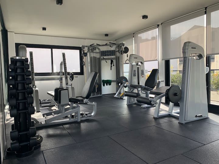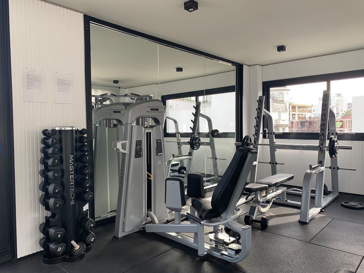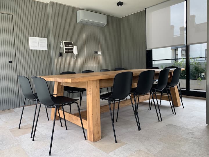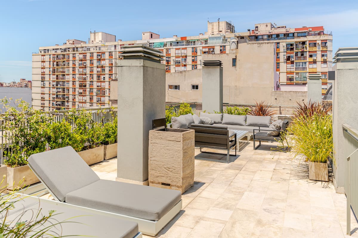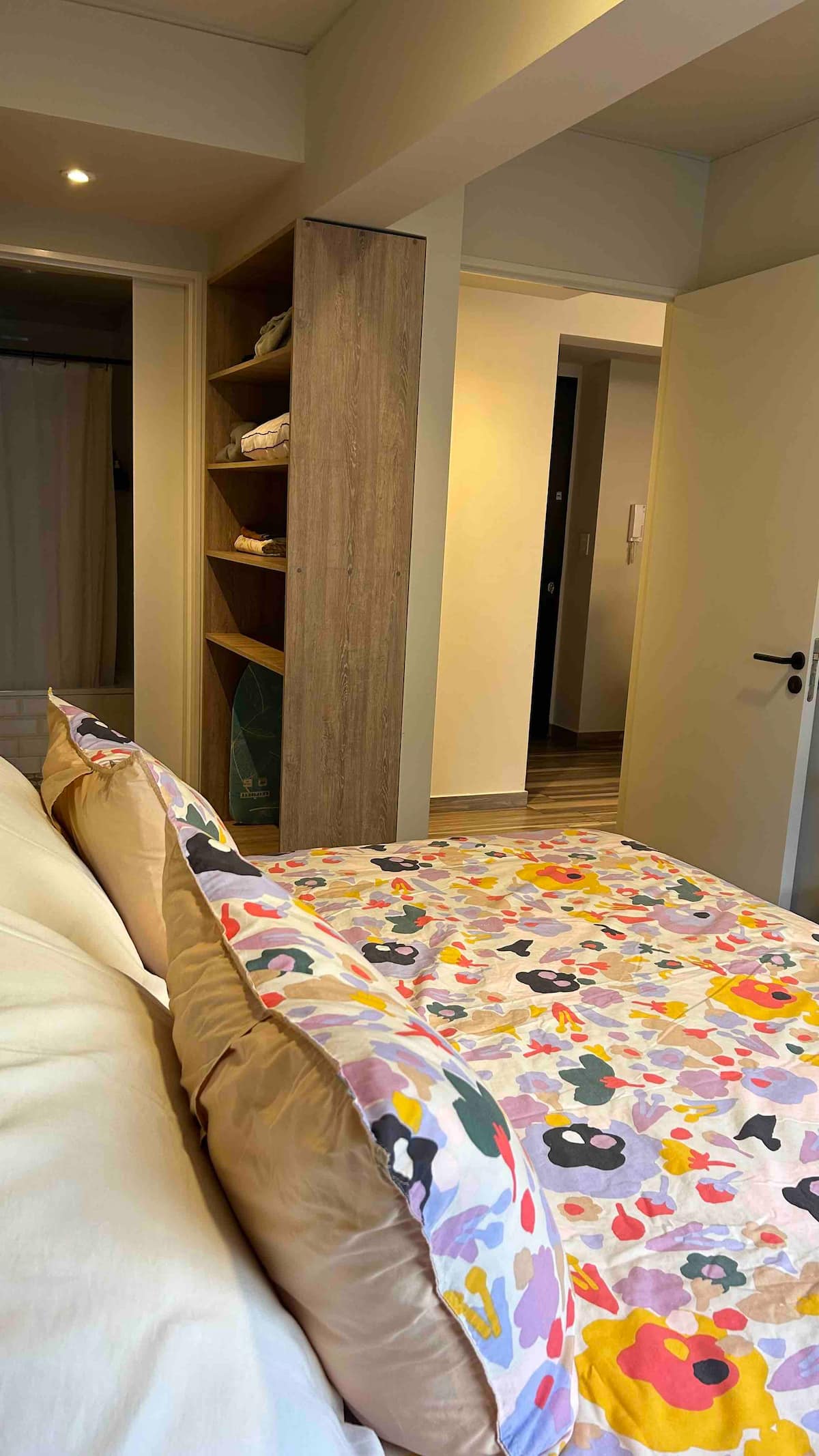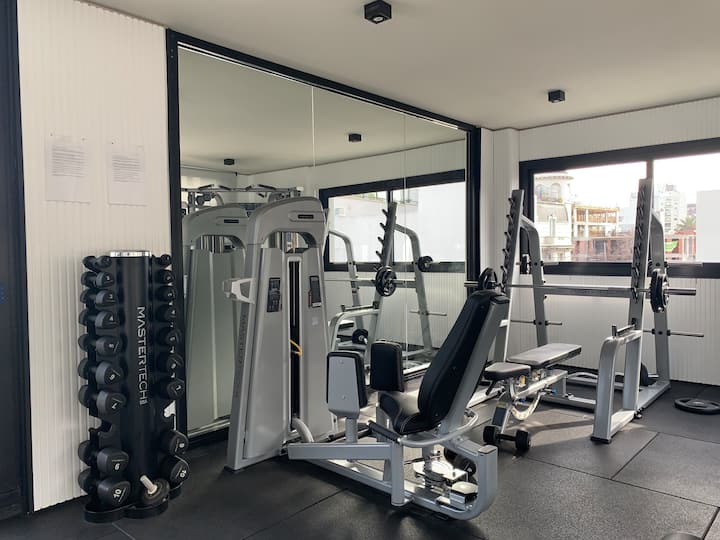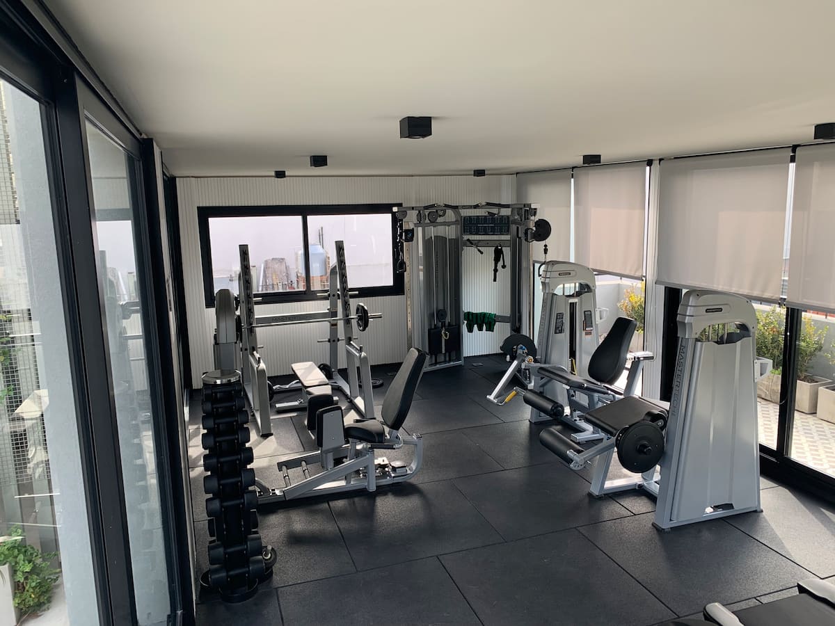 One-bedroom apartment in San Telmo with a king-size bed in the bedroom. The unit has a living room with a sofa bed, two bathrooms, and a fully equipped kitchen, plus Wi‑Fi with 300 mbps internet inside. The residential complex is an old warehouse converted into apartments, with a 65 ft outdoor pool, solarium, gym, coworking area, laundry, and security staff 24/7. Communal areas include the pool, terrace, gym, and communal tables, with access subject to building rules.