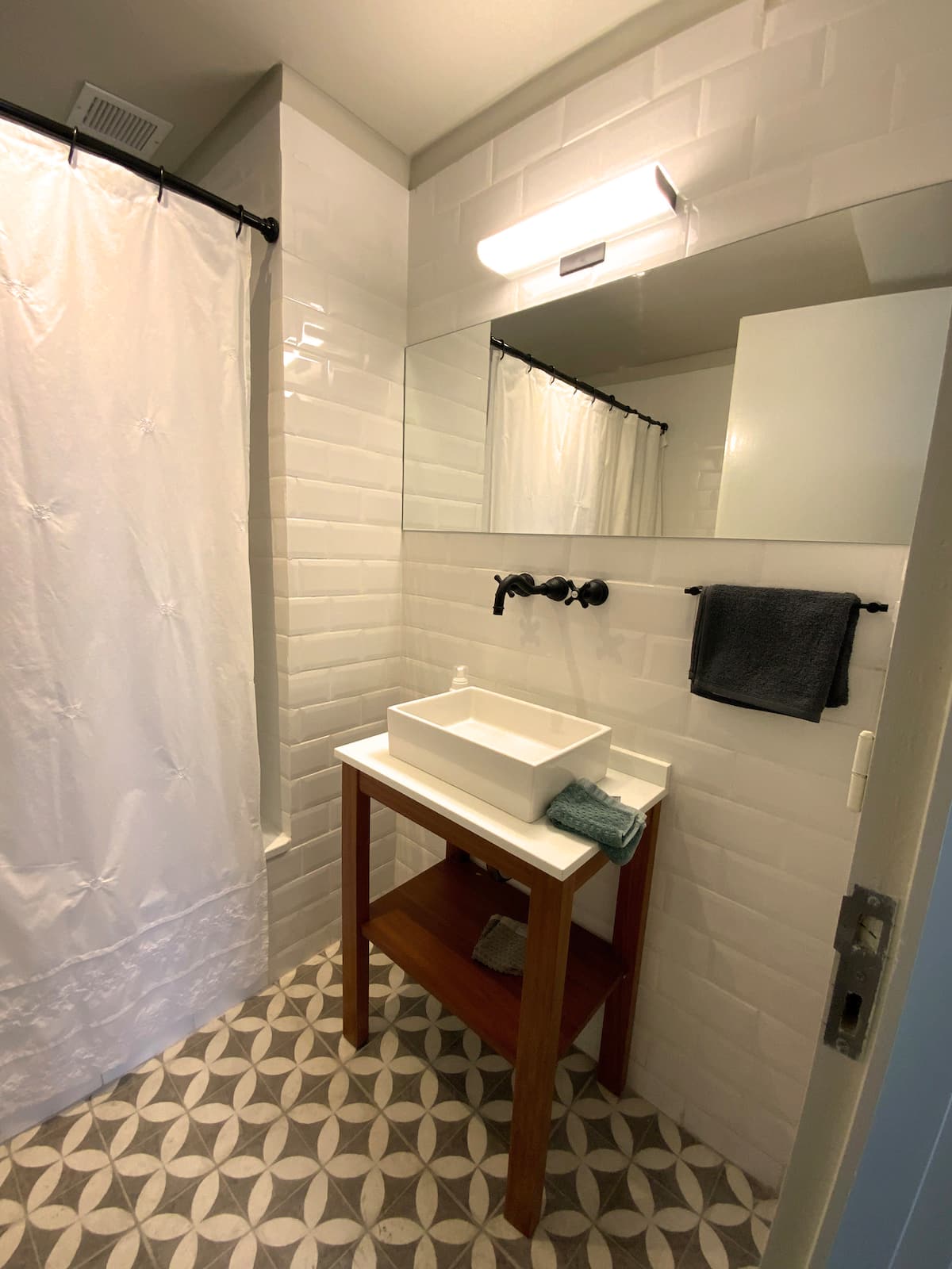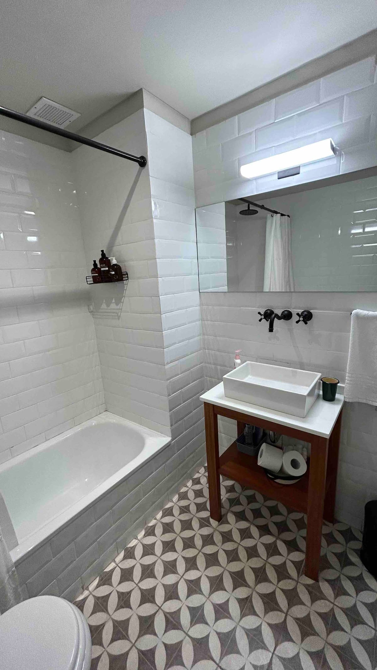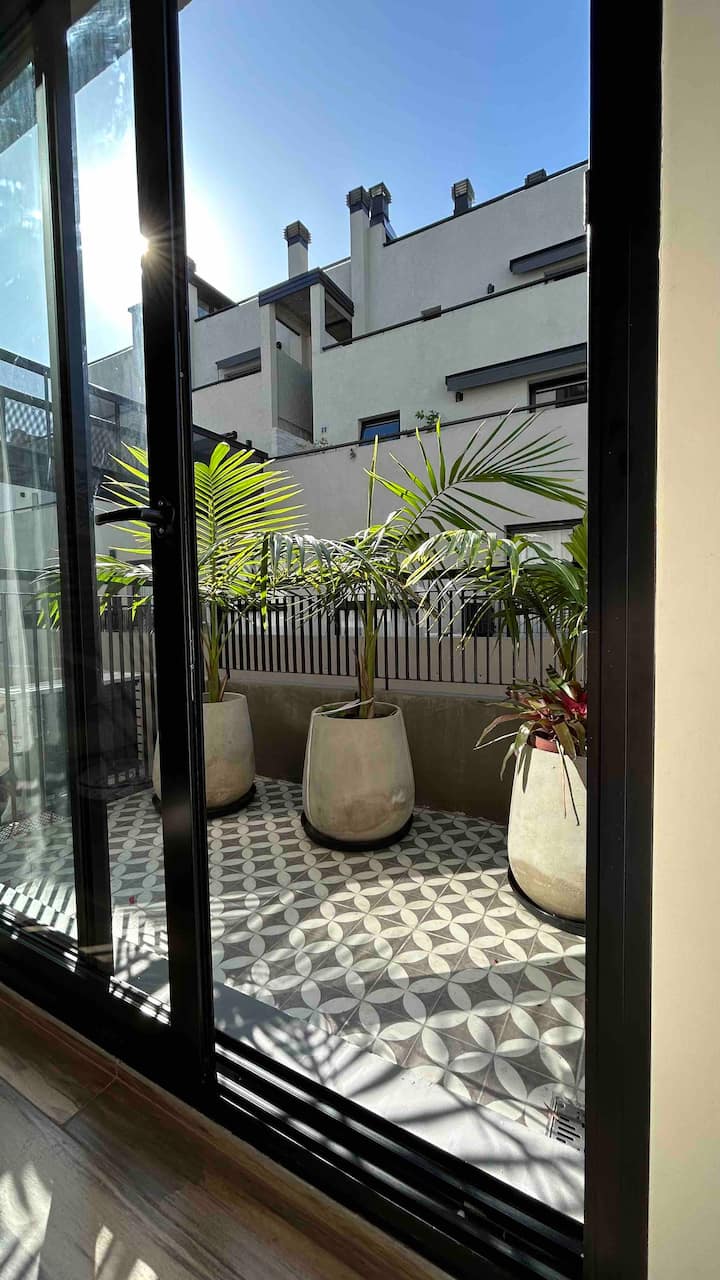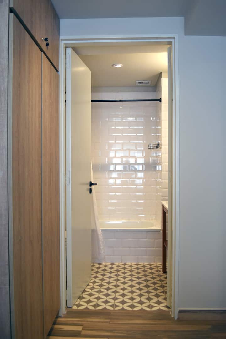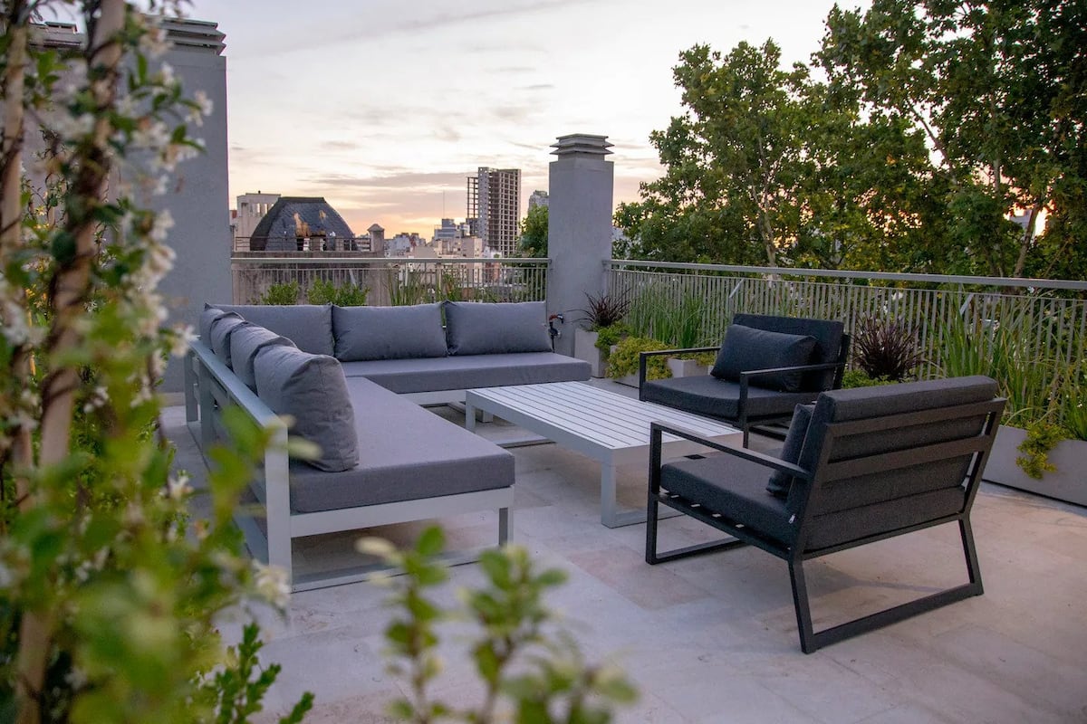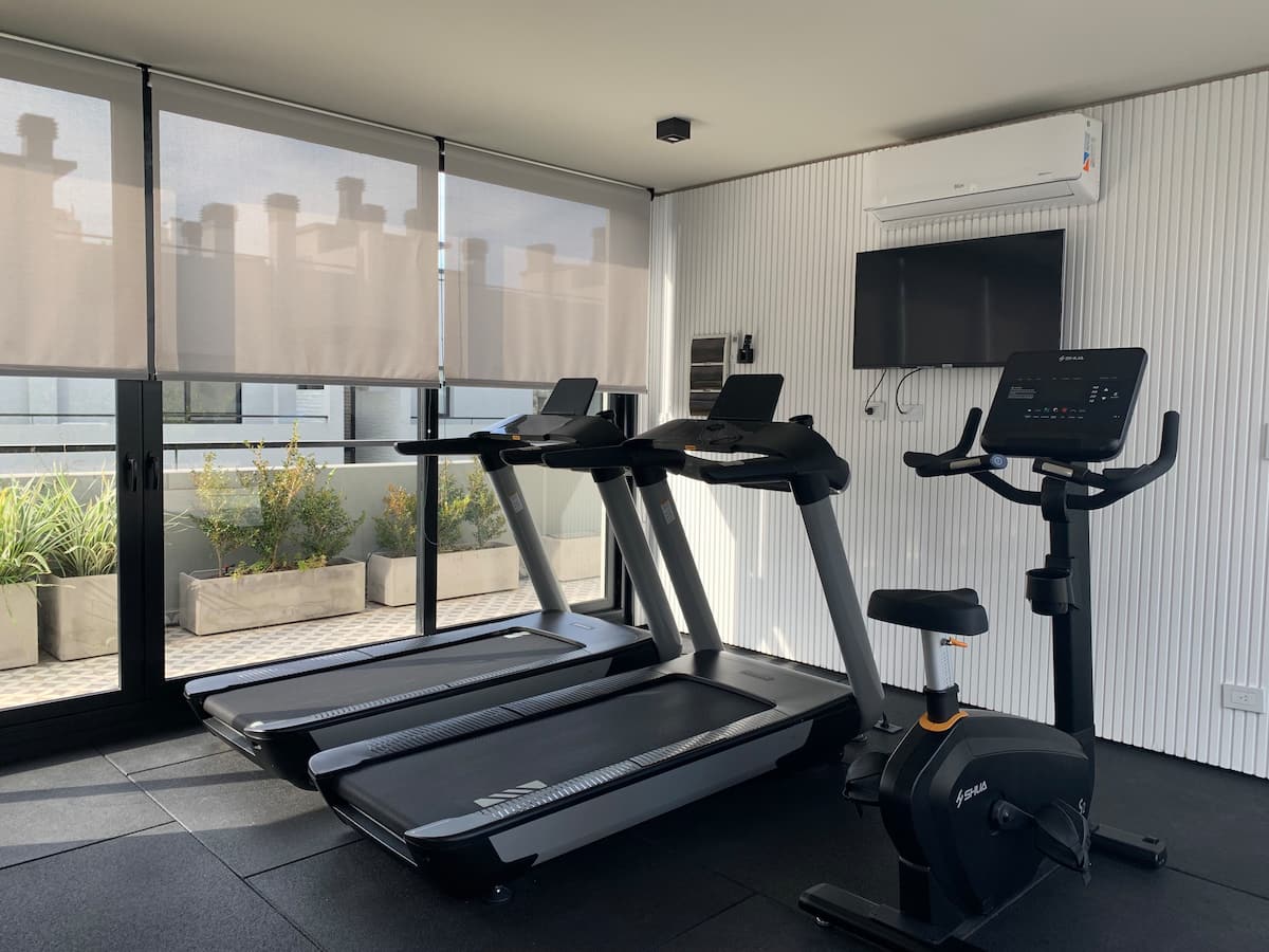 One-bedroom apartment in San Telmo with a king-size bed in the bedroom. The unit has a living room with a sofa bed, two bathrooms, and a fully equipped kitchen, plus Wi‑Fi with 300 mbps internet inside. The residential complex is an old warehouse converted into apartments, with a 65 ft outdoor pool, solarium, gym, coworking area, laundry, and security staff 24/7. Communal areas include the pool, terrace, gym, and communal tables, with access subject to building rules.