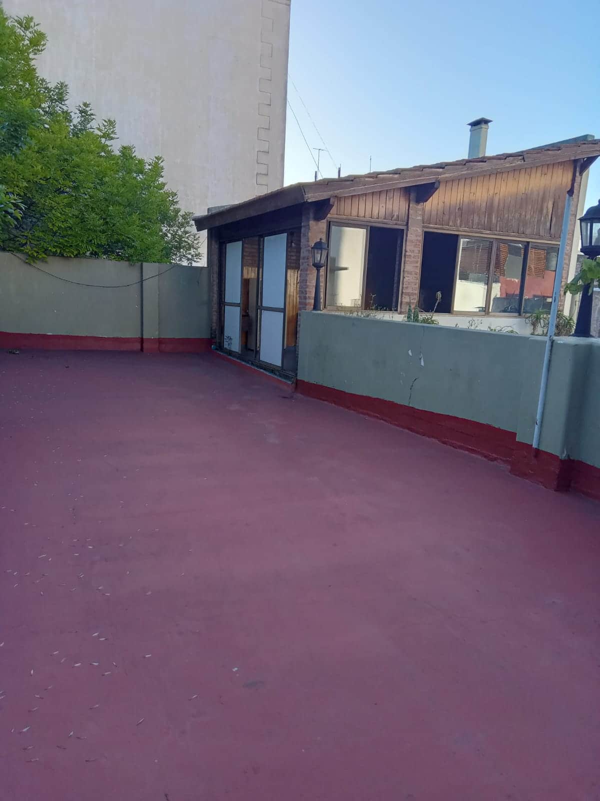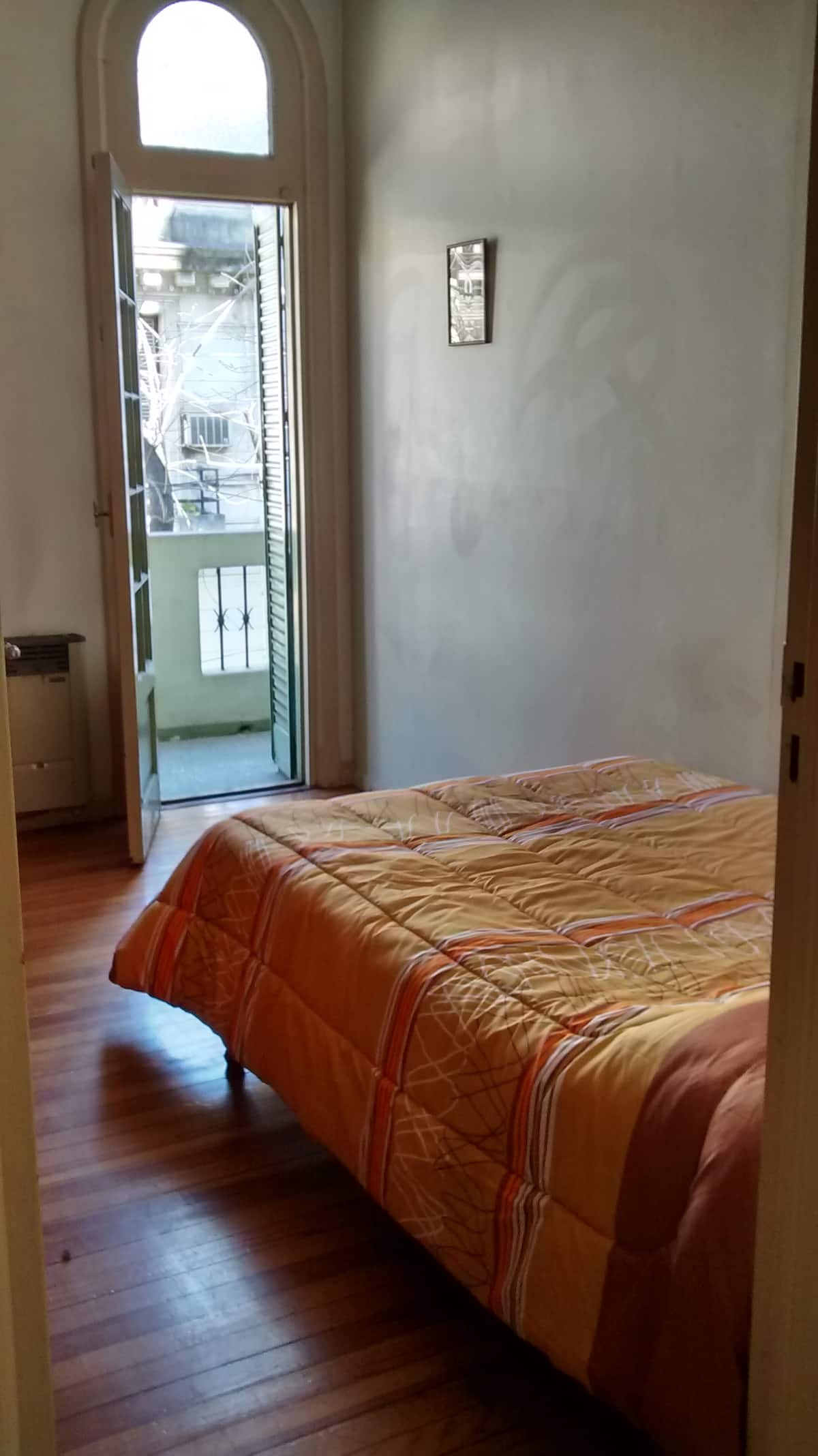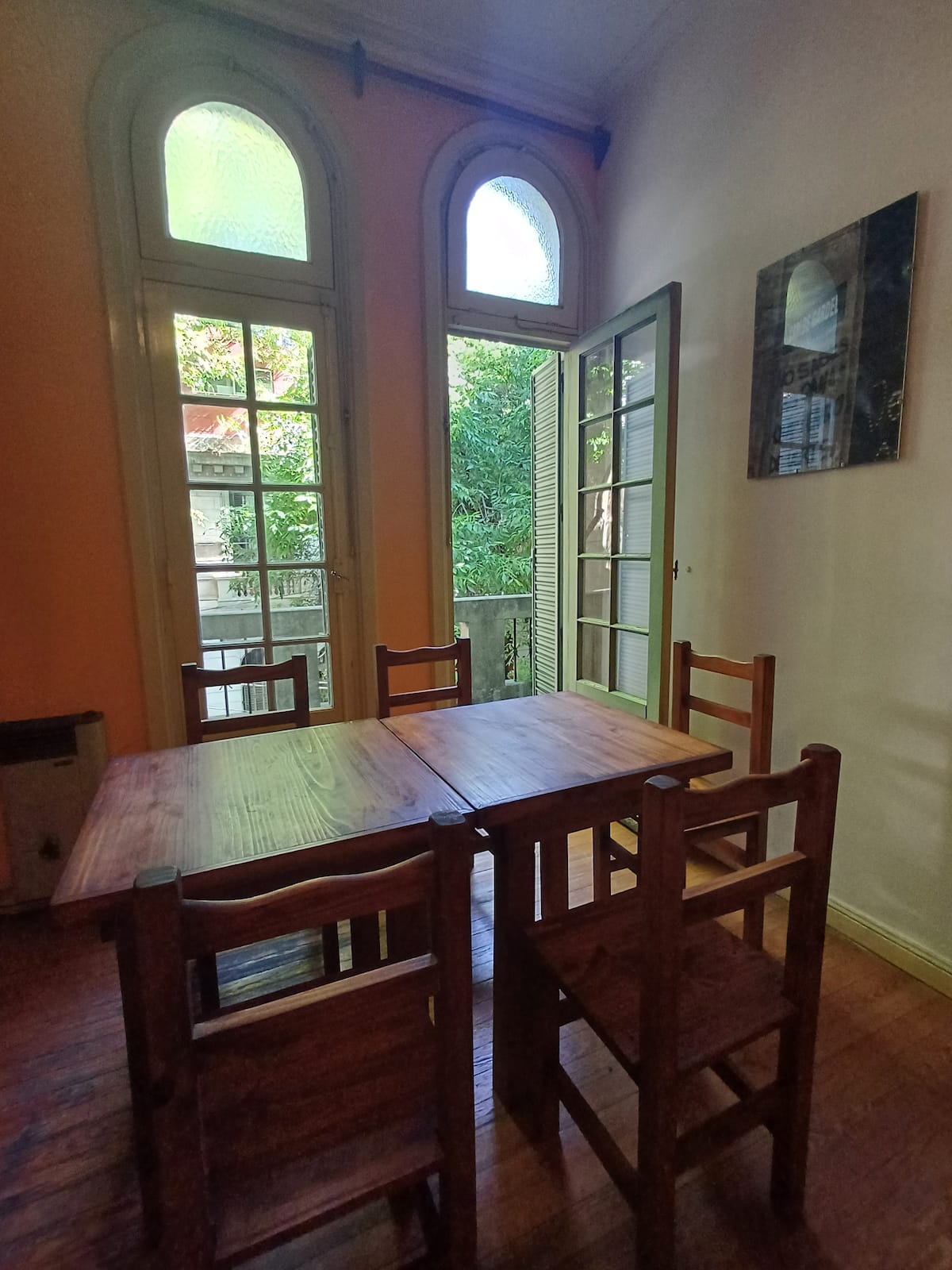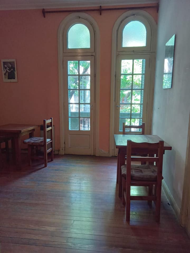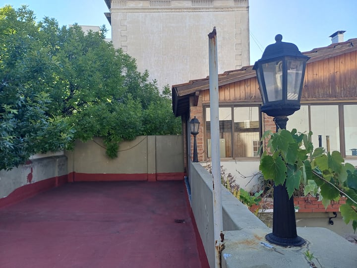 Private room in a shared house in Barracas with access to two terraces, a patio and a grill area. The house has 5 rooms and the listing price is for one room, with desk, chair and wardrobe. There are two shared full bathrooms and a common living room with dining/work tables; monthly stays only.