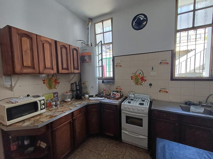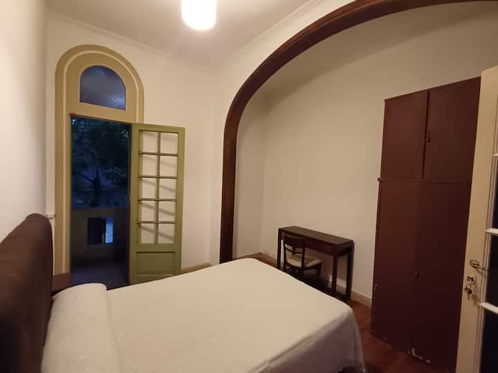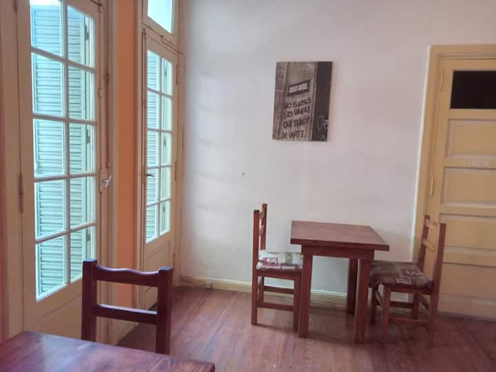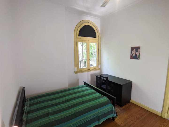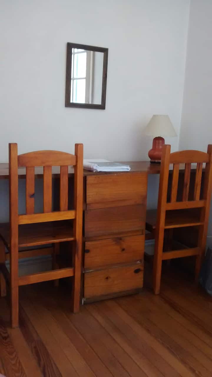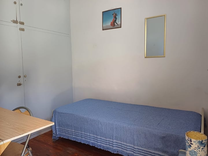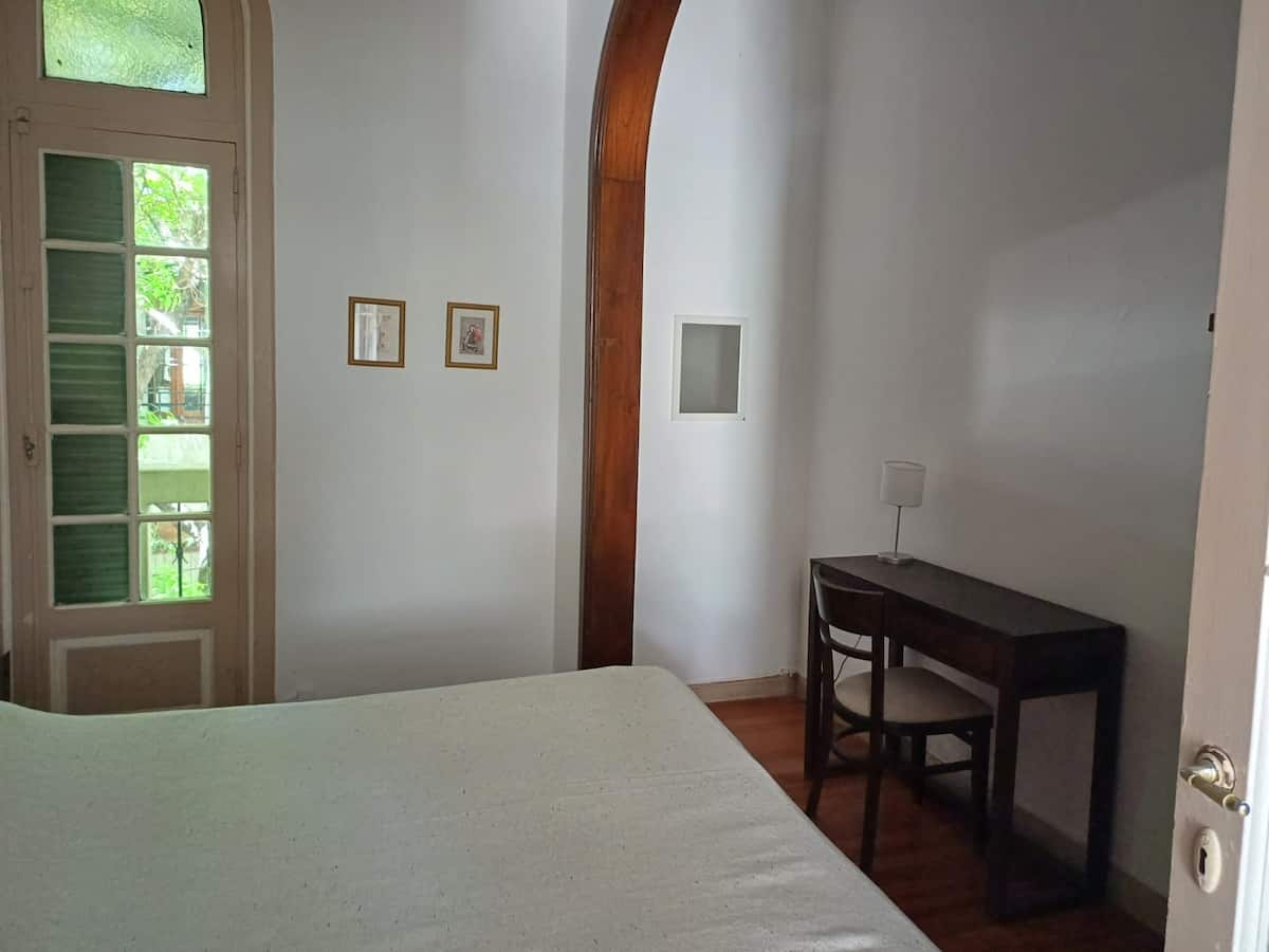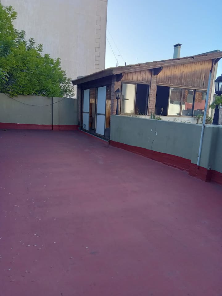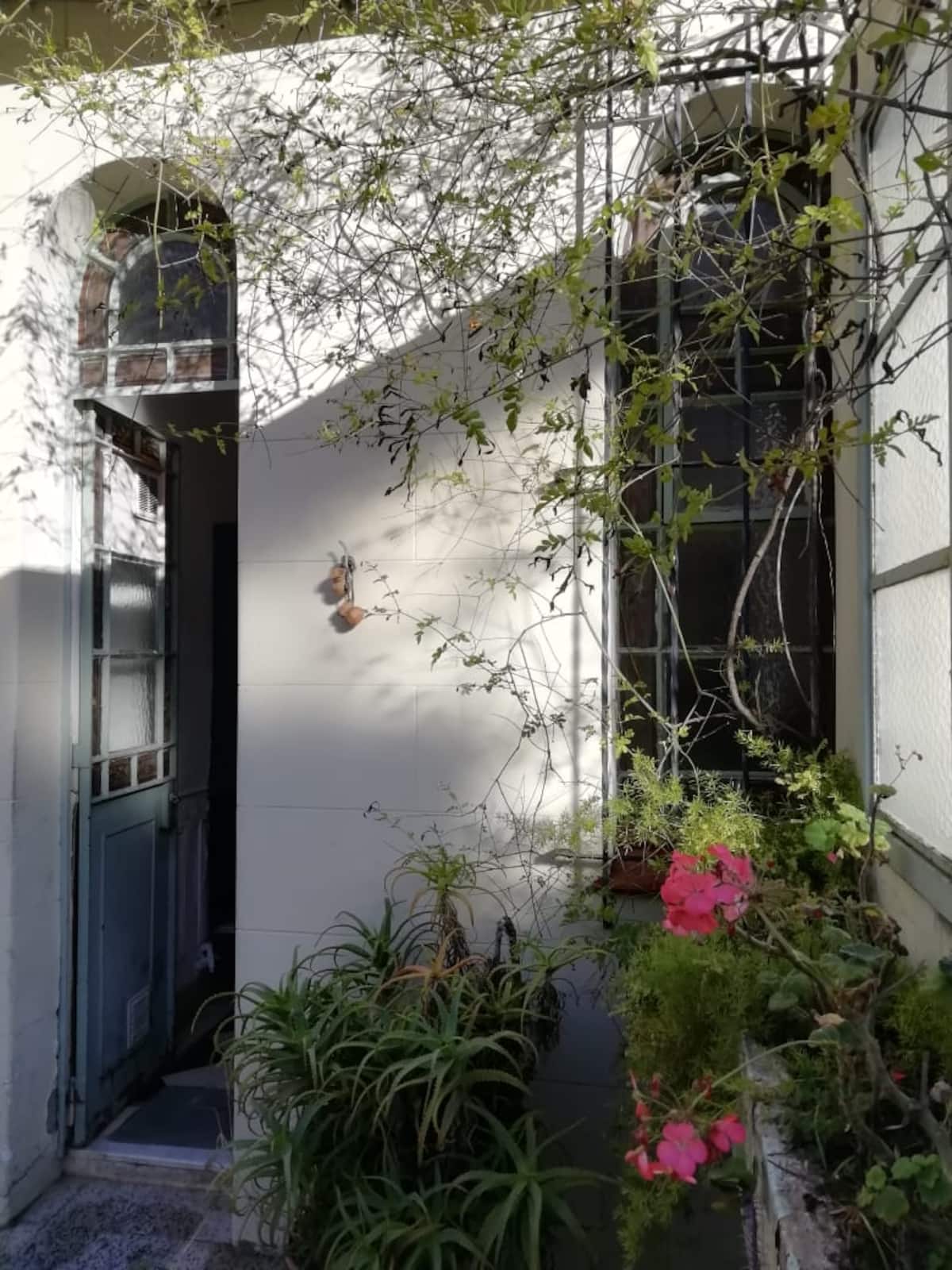 Private room in a shared house in Barracas with access to two terraces, a patio and a grill area. The house has 5 rooms and the listing price is for one room, with desk, chair and wardrobe. There are two shared full bathrooms and a common living room with dining/work tables; monthly stays only.