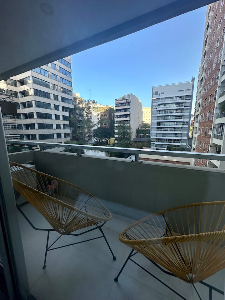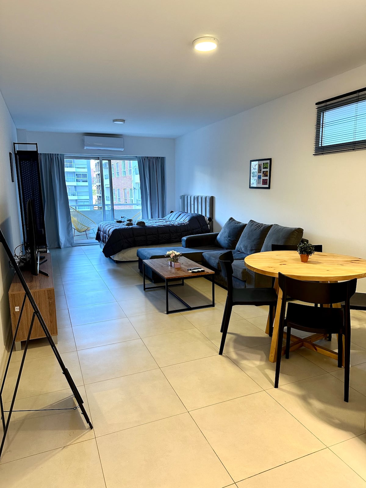 Studio apartment in Belgrano with a kitchen, a large living area, and a bed, plus a balcony. Appliances include a washing machine. Wi‑Fi, towels, heating, air conditioning and bed linen are included; optional services listed include luggage storage (USD 30 per reservation), early check-in (USD 25) and late check-out.