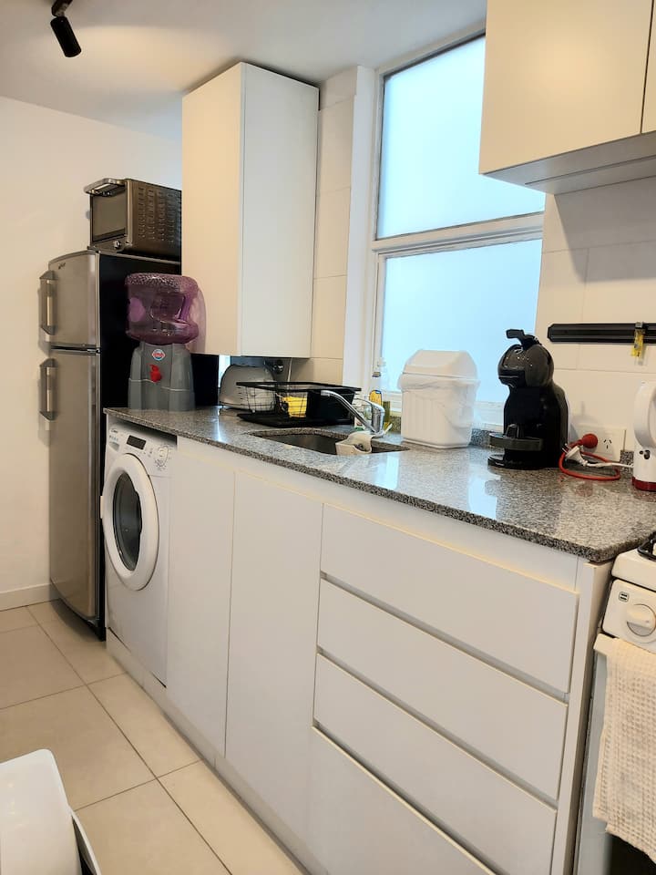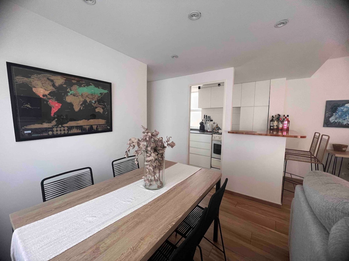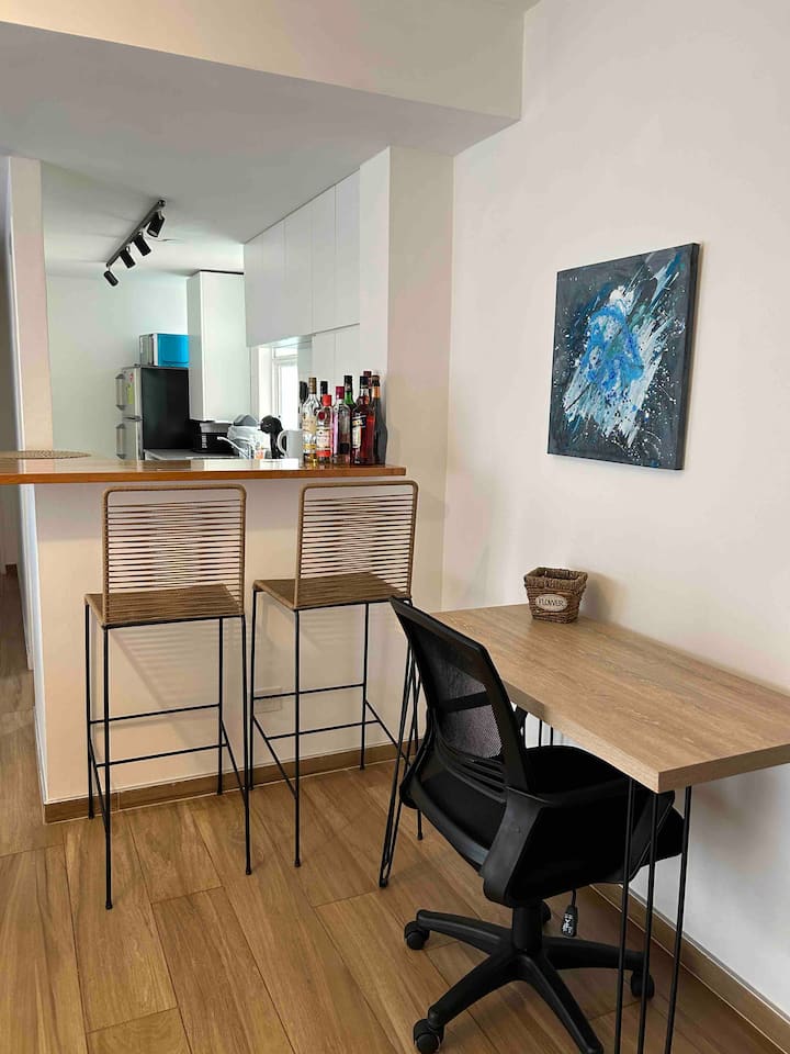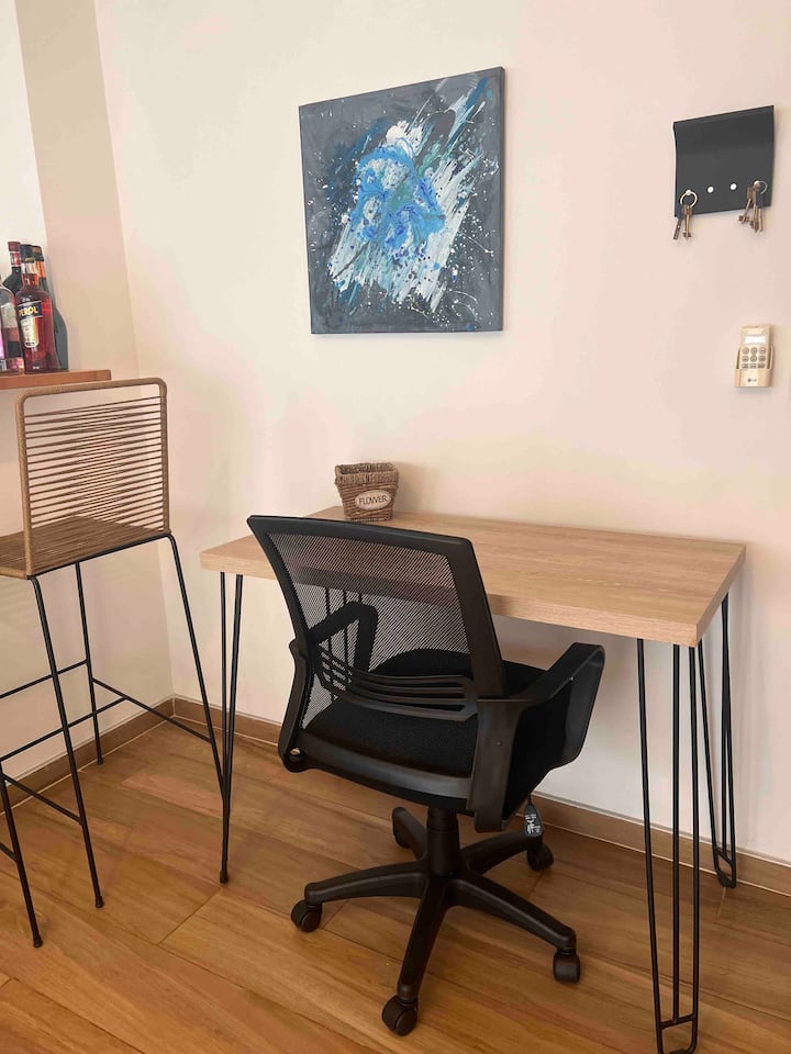 Furnished one-bedroom apartment renovated in 2022 on the 6th floor. Street-facing with a balcony and views. Brand-new furniture in an industrial-style layout, with a washing machine and a Dolce Gusto coffee machine, plus a work area. Building fees include weekly cleaning for stays longer than 7 days.