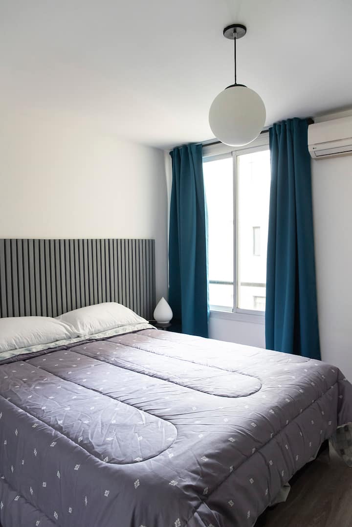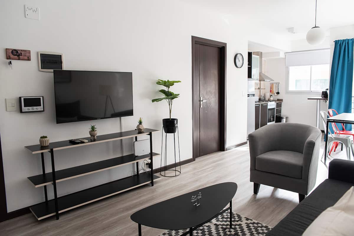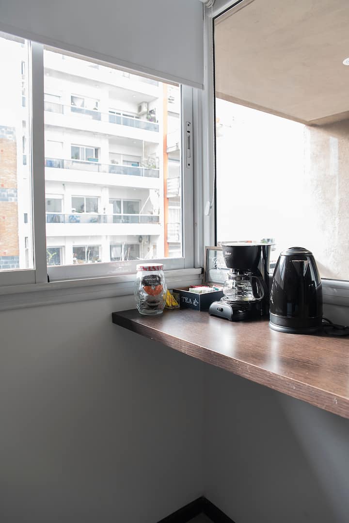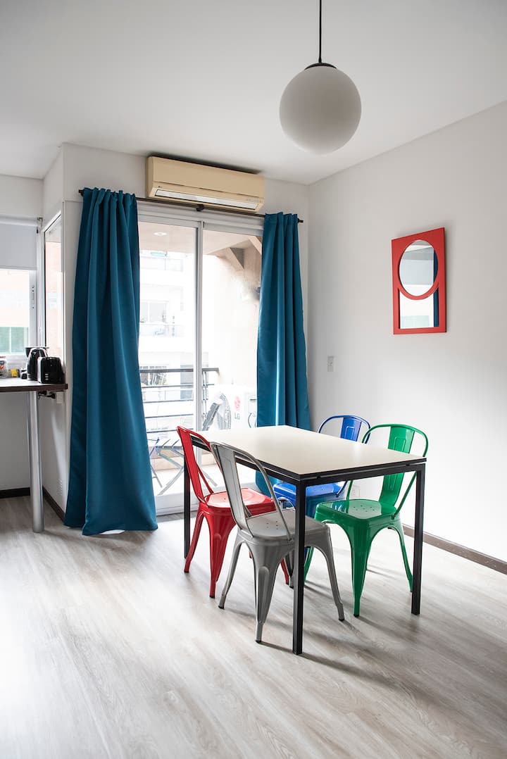 Two-room apartment on the 4th floor with elevator, located on the border of Nuñez and Belgrano. The unit accommodates up to three people, with a double bed and a sofa bed. Living-dining room with a balcony and an integrated, fully equipped kitchen; full bathroom. TV and Wi-Fi are included, and a communal laundry room is available on the top floor. One block from Av. Libertador; Barrancas train station and Subte Line D are a few blocks away. Building fees and the availability of additional cleani